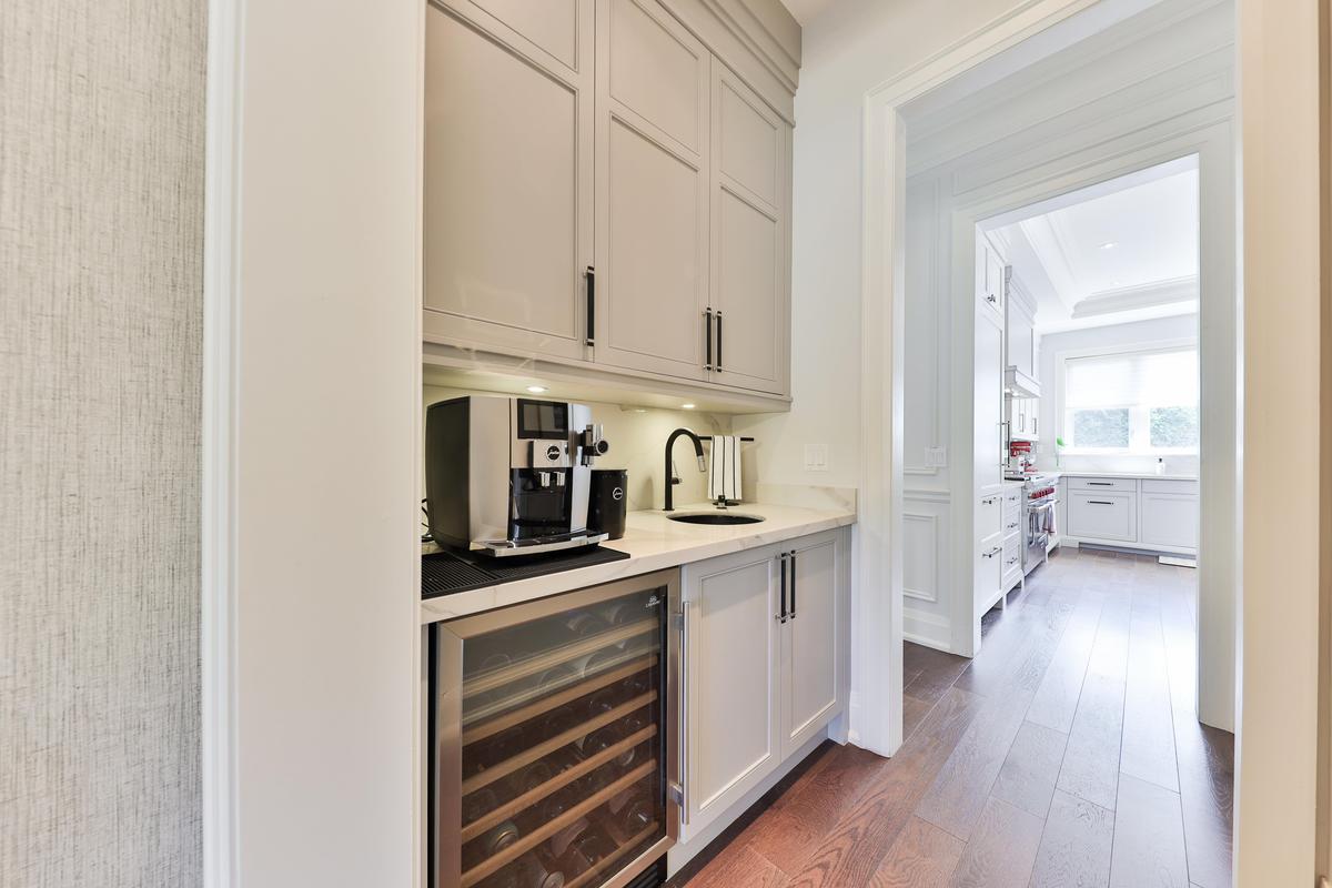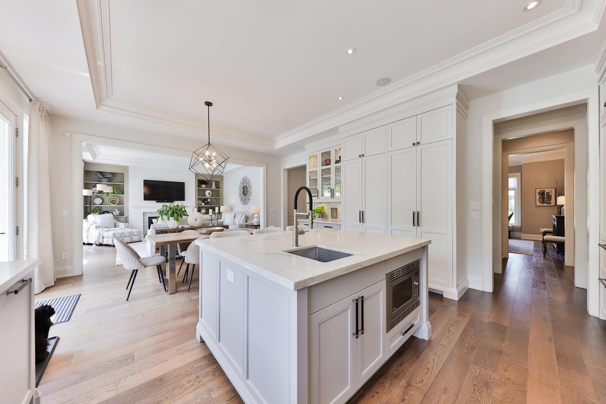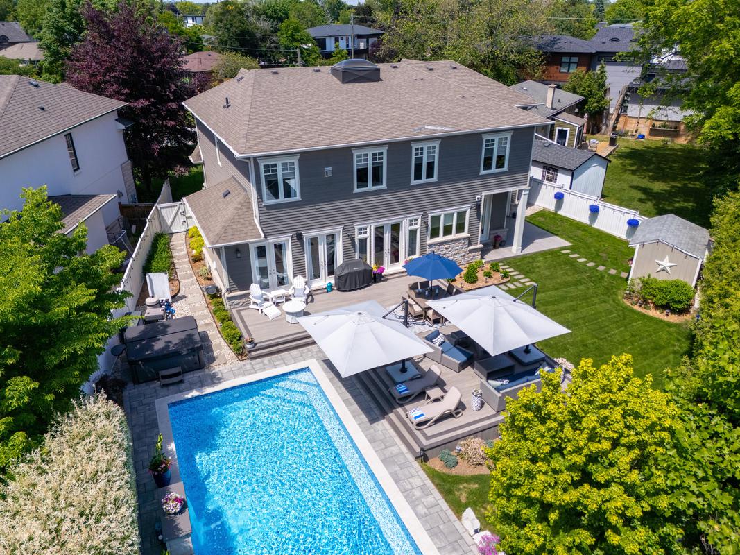 Every so often, a home comes along that subtly sets a new standard, combining timeless architecture, magazine-worthy interiors, and a resort-style backyard into one exceptional residence. With over 6,100 square feet of finished living space, this custom-built home is among the most beautiful and balanced in the area. Situated on one of the largest pie-shaped lots in the neighbourhood, the property spans an impressive 11,516 square feet. This is more than 45 percent larger than typical area lots, offering a rare sense of space and privacy. The southwest-facing rear gardens are a professionally designed showpiece, centered around a heated saltwater pool, multiple tiered lounging areas, soft ambient lighting, and mature privacy hedges. Inside, the home exudes quiet sophistication. Ten-foot ceilings on the main floor, wide-plank hardwood floors, and finely crafted millwork create a refined and inviting atmosphere. The open-concept kitchen and family room form the heart of the home. Custom cabinetry, quartz countertops, premium appliances, and a gas fireplace framed by built-ins provide both beauty and functionality. French doors open to the rear gardens, blending indoor comfort with outdoor serenity. The main level also includes a formal living room, an elegant dining space for intimate gatherings, and a private office that is ideal for working from home. Upstairs, the primary suite offers the comfort of a luxury hotel, complete with a spa-like ensuite and a private dressing room. Three additional bedrooms and a well-appointed laundry room provide practical comfort for family living. The fully finished lower level adds tremendous flexibility. It includes a large recreation room with wet bar, a home gym, a built in sauna, fifth bedroom, and a full bathroom. This space is perfectly suited for teens, guests, or multigenerational families. Timeless, calm, and effortlessly functional, this is a home designed for elegant living and fashioning lasting memories.