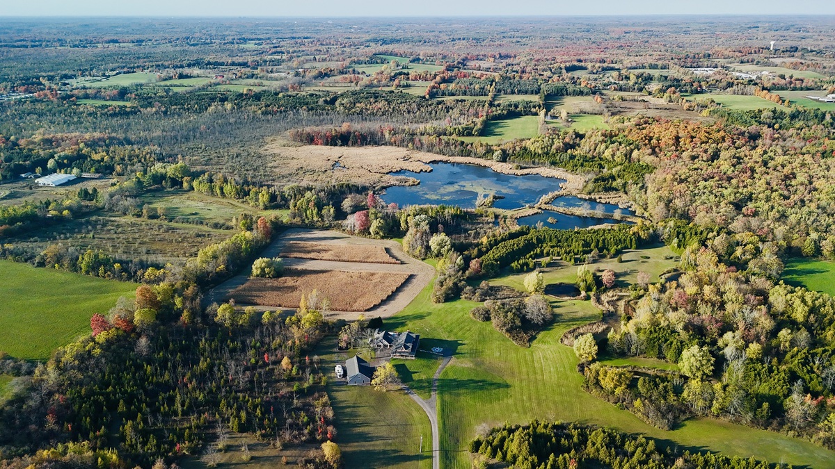 This 4-bedroom, 5-bathroom country estate offers nearly 6,000 sq. ft. on 108+ acres in Flamborough. Renovated in 2018, the property features 7 serene bodies of water, including 3 connected to Bronte Creek. The home includes a walkaround porch, gourmet kitchen with Bosch appliances, a steam spa shower in the primary bath, and two Rumford fireplaces. Highlights include a walk-out basement with in-floor heating, pool house, a 60x40 workshop with a 10,000 lb hoist, RV hookup, and a framed 2-bedroom apartment upstairs. Other features include a Kohler generator, high-speed fiber internet, security cameras, and updated electrical, plumbing, and HVAC systems. The property has reduced property taxes due to farming use, making it an ideal multi-functional family estate or private retreat.