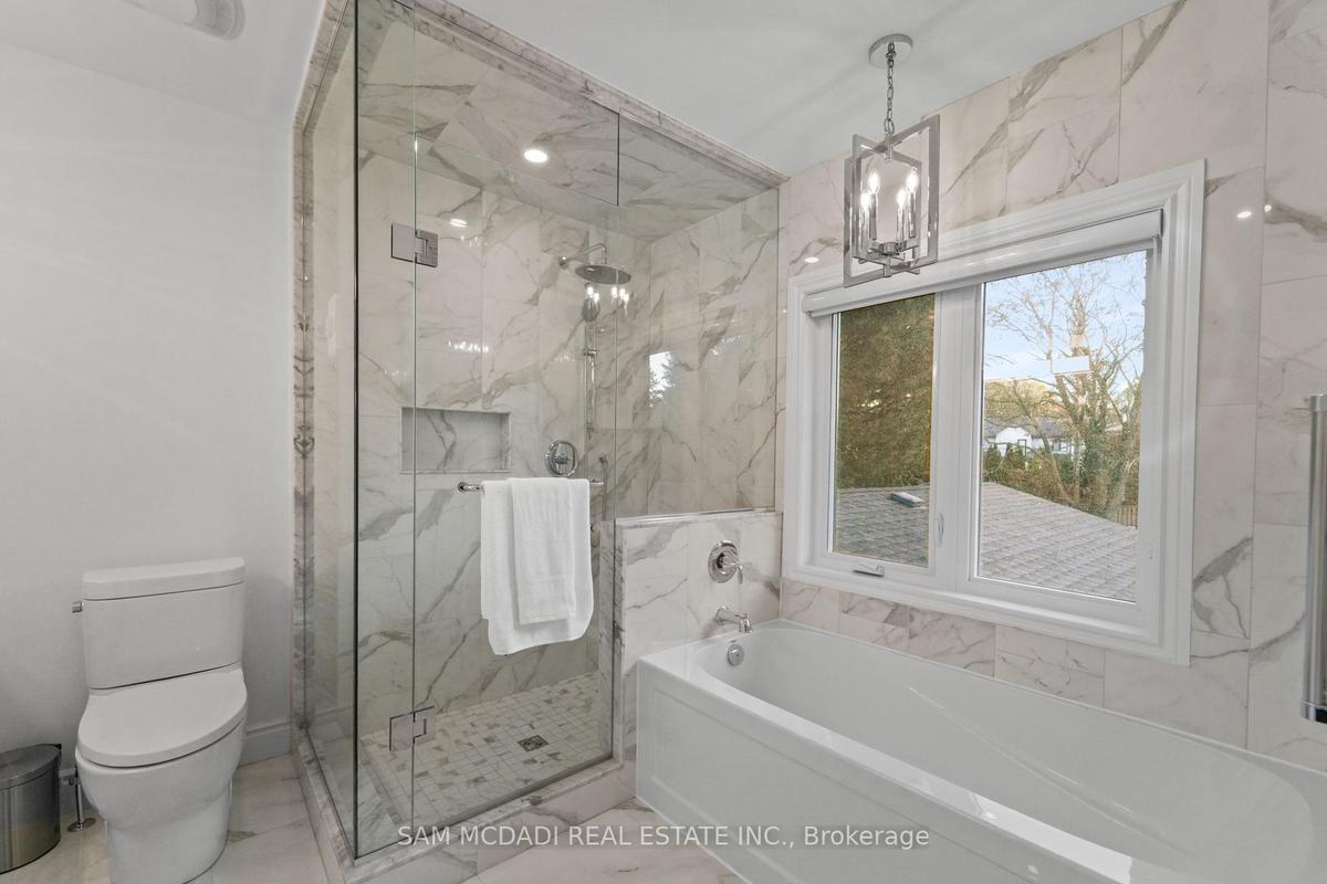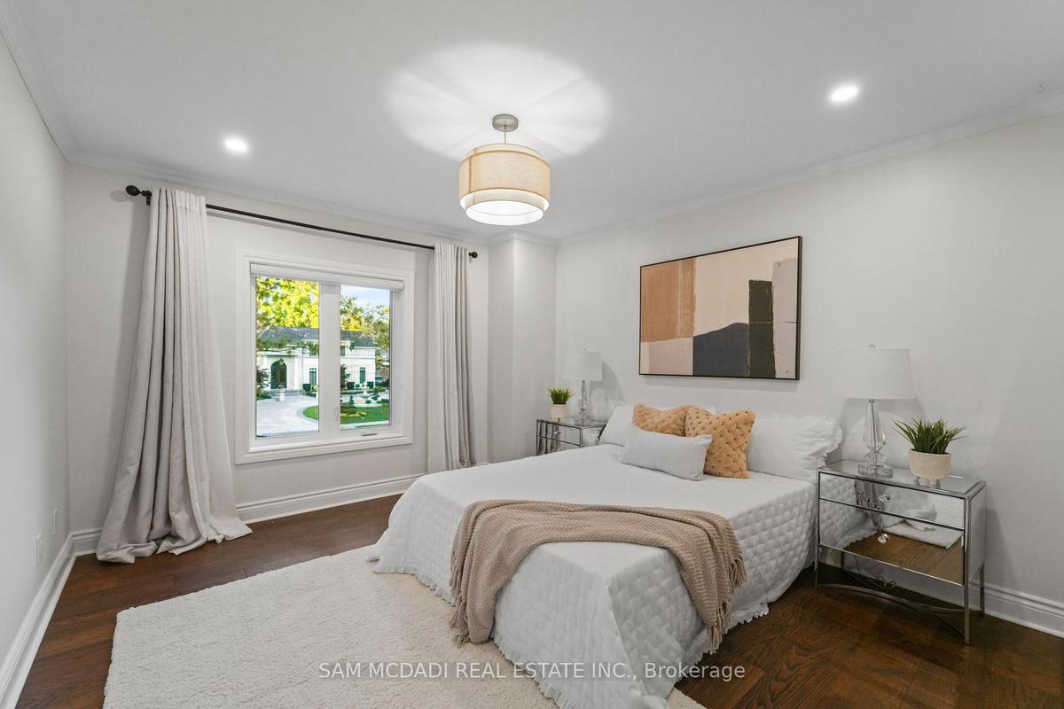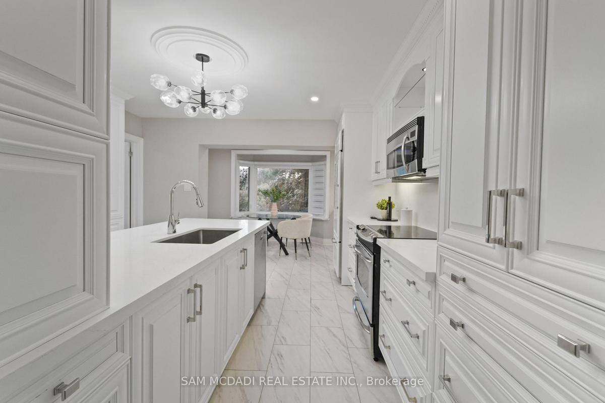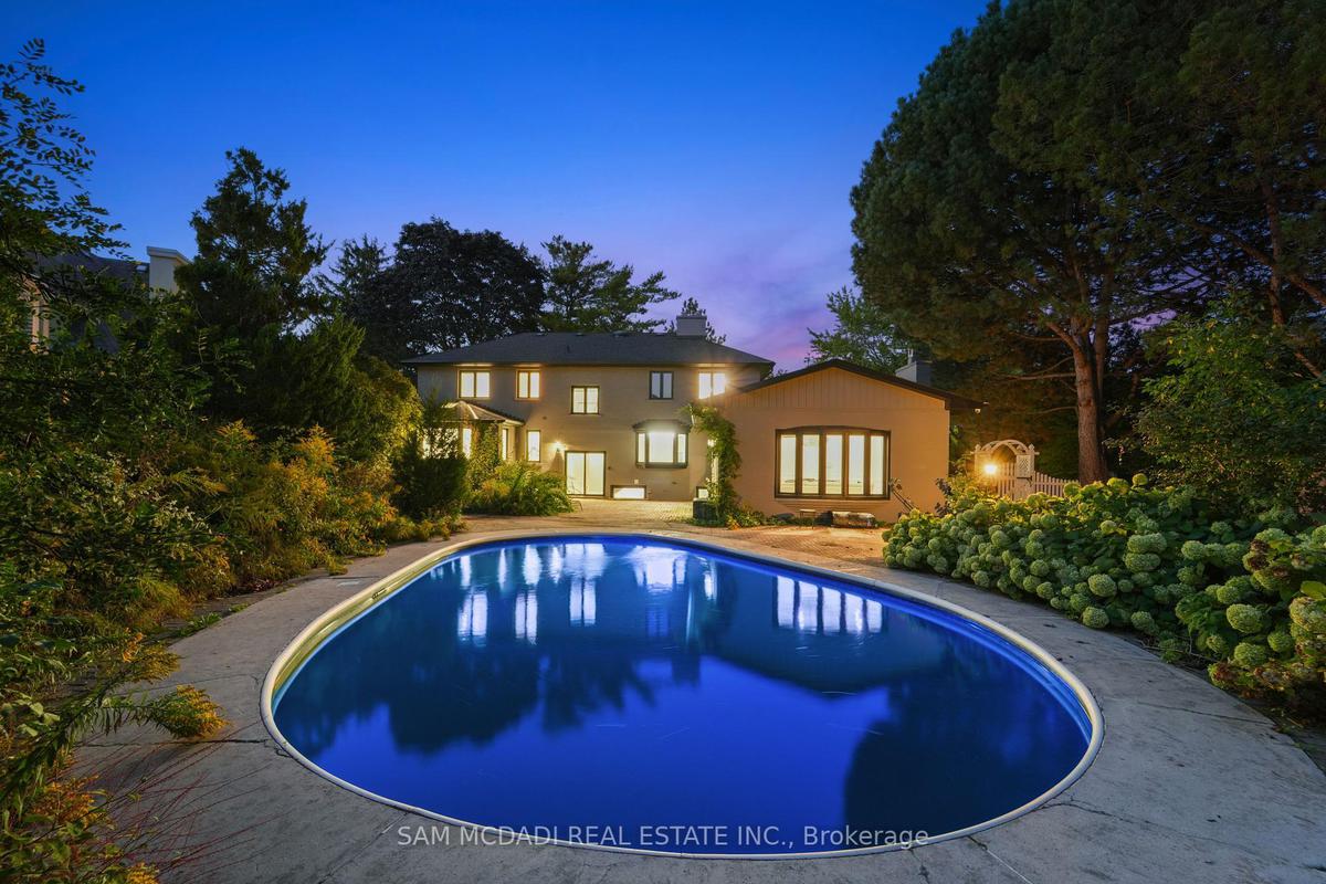 Rare offering of a home to lease with an electronic gate providing enhanced privacy and security! This completely redesigned family home in desirable Rattray Marsh neighbourhood known for its iconic scenery, well established streets and access to Lake Ontario! Inside you'll find beautiful designer finishes with prodigious principal rooms offering new wide plank hardwood floors, expansive windows and exceptional millwork throughout. The white bespoke kitchen with breakfast area offers ample storage space and features quartz countertops, large peninsula island, stainless steel appliances and provides direct access to the spacious dining room! Accompanying this level is the elegant living room with quartz fireplace, the office featuring built-in cabinetry and the sunken family room elevated by its dark and dramatic exposed ceiling beams, eye-catching chandelier, floor-to-ceiling stone fireplace and exceptional decorative wood paneling as well as a walk-out to the landscaped backyard. The second level hosts the romantic primary with built-in cabinetry, large walk-in closet and stunning 5-piece ensuite. Down the hall are 3 more bedrooms with their own captivating design details and a shared 5-piece bath. The finished basement features a large rec area with luxury vinyl floors, a 3-piece bath, a laundry room with ample counter and storage space, a 5th bedroom and an infrared sauna for the ultimate at-home spa experience. The stunning backyard completes this home with an inground pool, stone patio and green space!