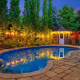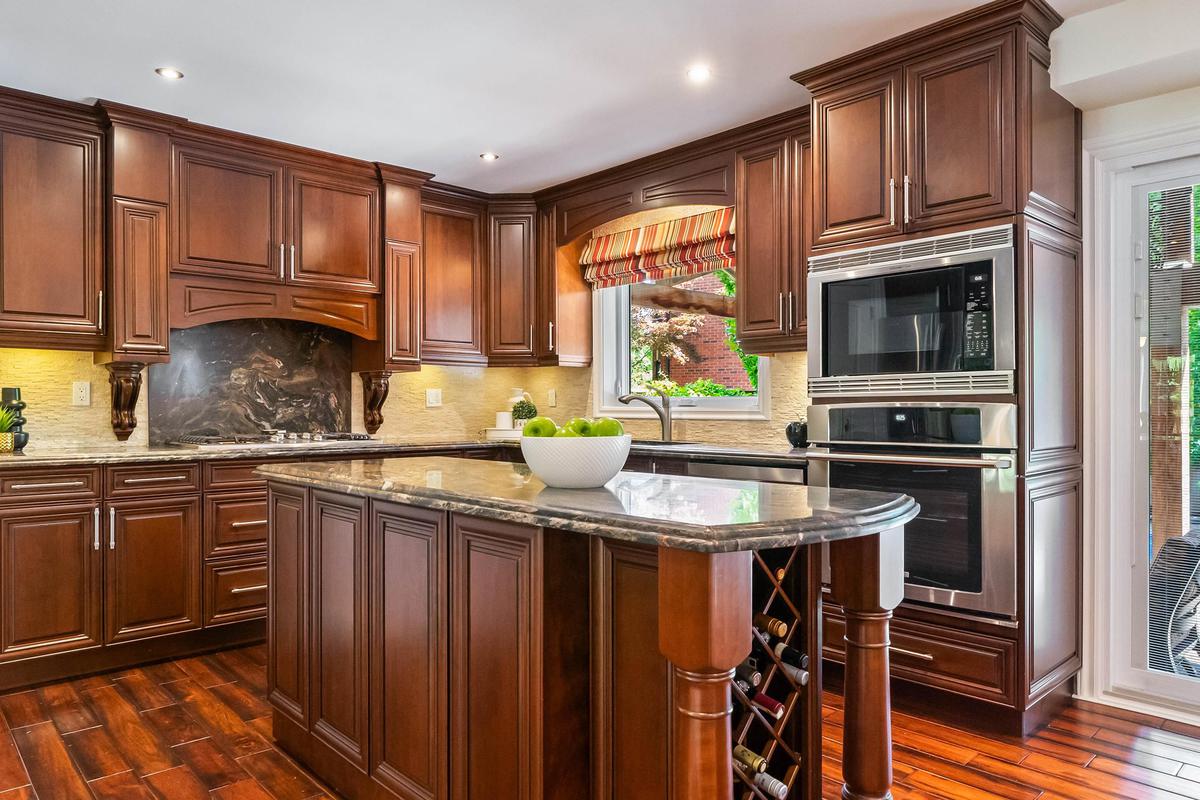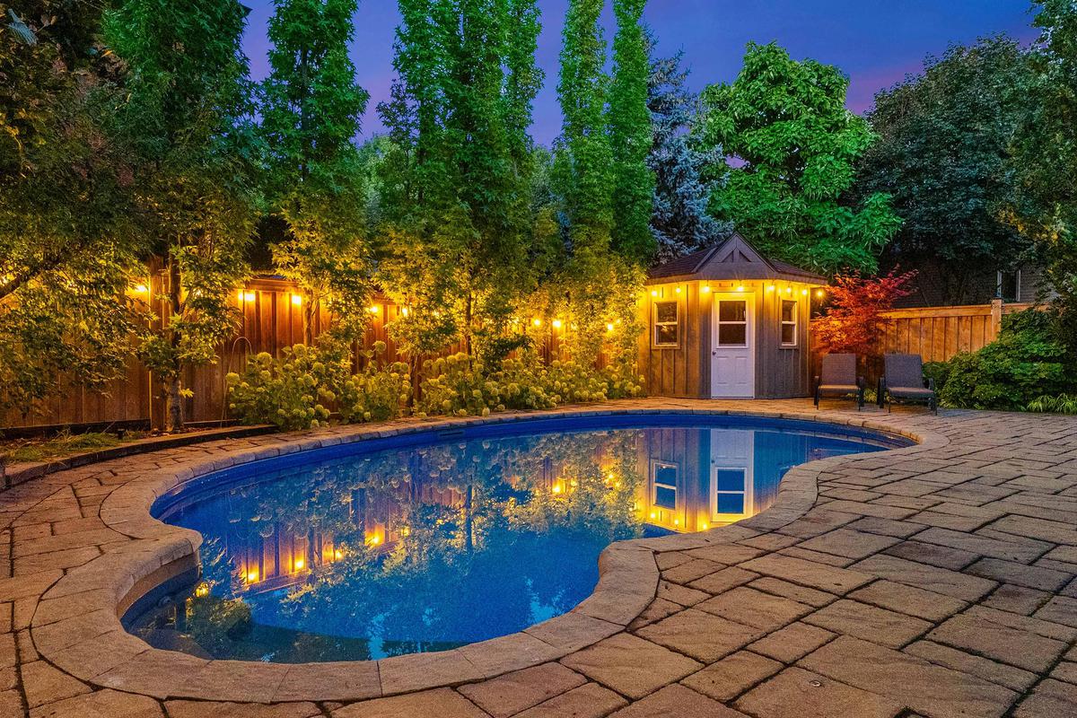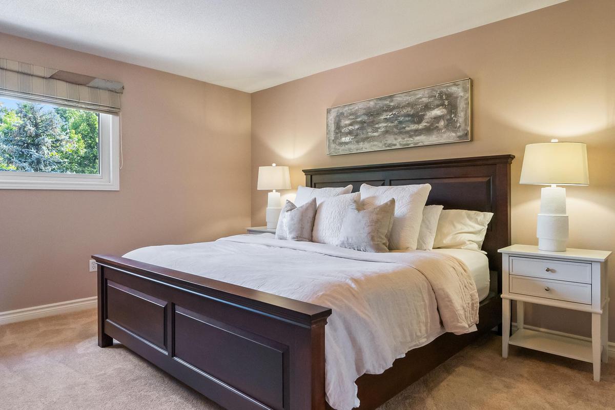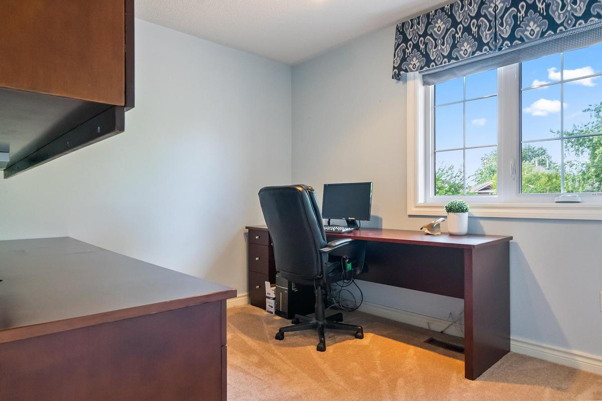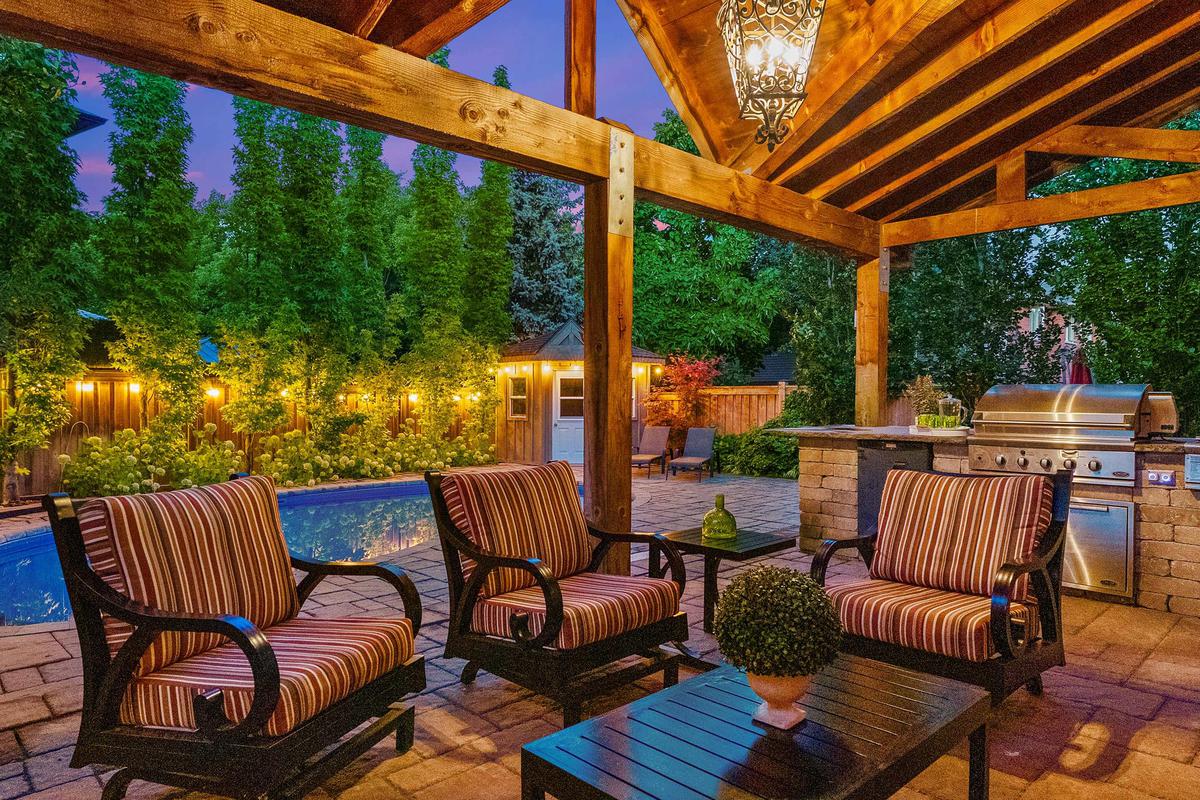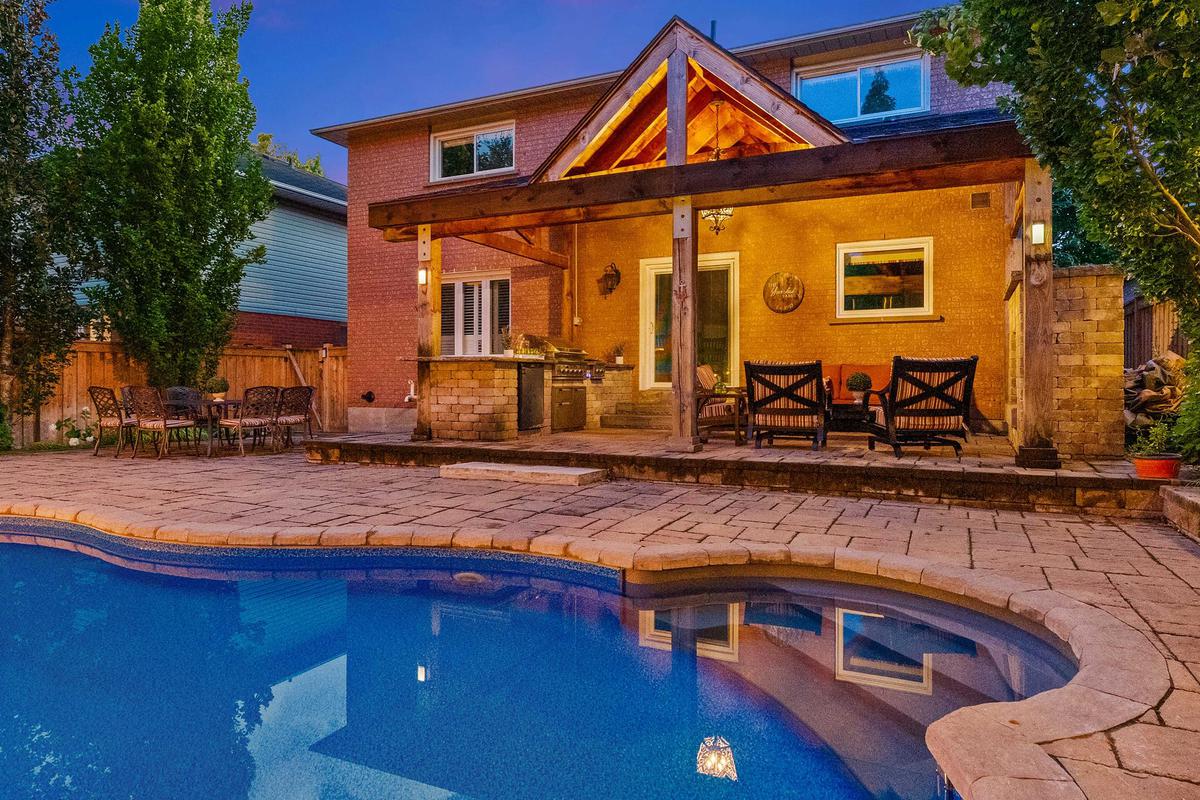 flooring throughout, a dedicated home office, and a bright, airy living space anchored by a stunning bay window that floods the home with natural light. The chef-inspired kitchen boasts a large island, built-in appliances, a walk-in pantry, and an eat-in breakfast area perfect for everyday family meals and casual entertaining. A spacious laundry/mudroom with direct garage access adds everyday convenience. Upstairs, you'll find four generous bedrooms, including a primary suite with a private ensuite, plus an additional full bathroom with double sinks for the family. The finished lower level offers incredible versatility with a large recreation/gym area, a fifth bedroom with its own 3-piece bathroom, and plenty of storage space. Step outside to your private backyard oasis a beautifully landscaped retreat complete with a salt-water pool, covered Douglas Fir timbered Pergola, built-in BBQ, gas fireplace, and in-ground irrigation system, all surrounded by mature trees offering privacy and tranquility. Located within walking distance to Holy Trinity Catholic Secondary School and just minutes from all the amenities in the Uptown Core neighbourhood, as well as Munns Creek trails and local parks. Situated in one of Oakville's most desirable and family- friendly communities and not to be missed, this exceptional home stands out from the rest and is ready to be enjoyed by its next family