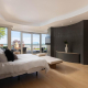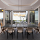 glass, stone, and steel. Inside, walls of windows frame water and city vistas from every angle. The great room