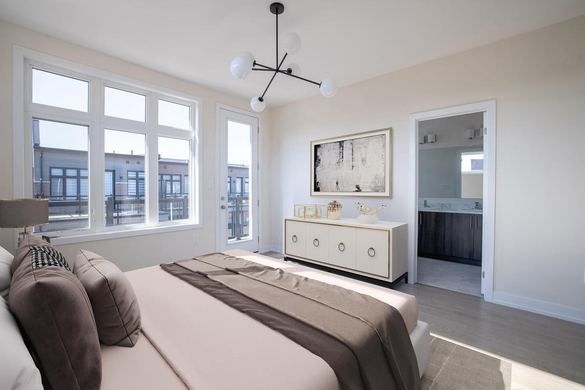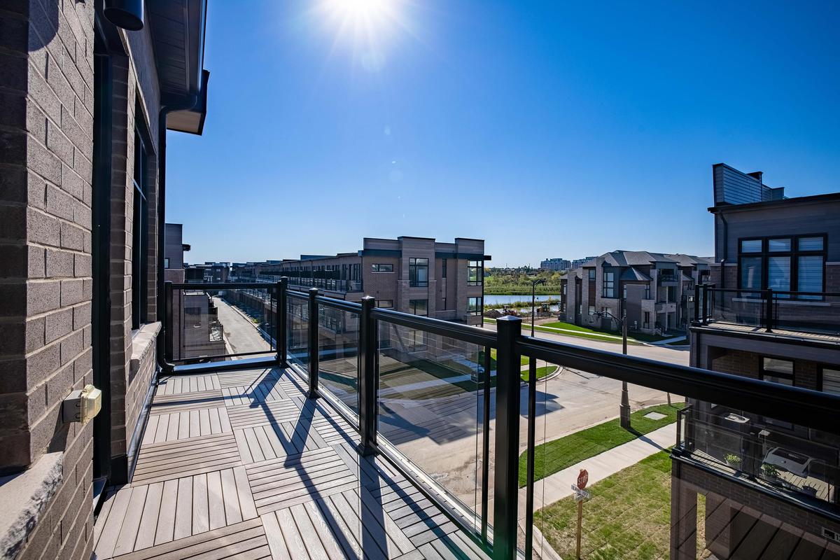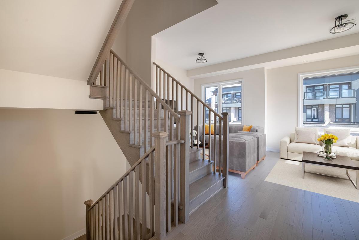 The second floor is light filled with an open concept kitchen, dining, and living area under 10 ft ceilings. The kitchen features stainless steel appliances, a centre island, and generous storage. The dining room has a walkout to the balcony for easy indoor to outdoor entertaining, and a powder room completes the level.