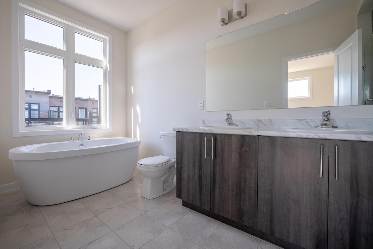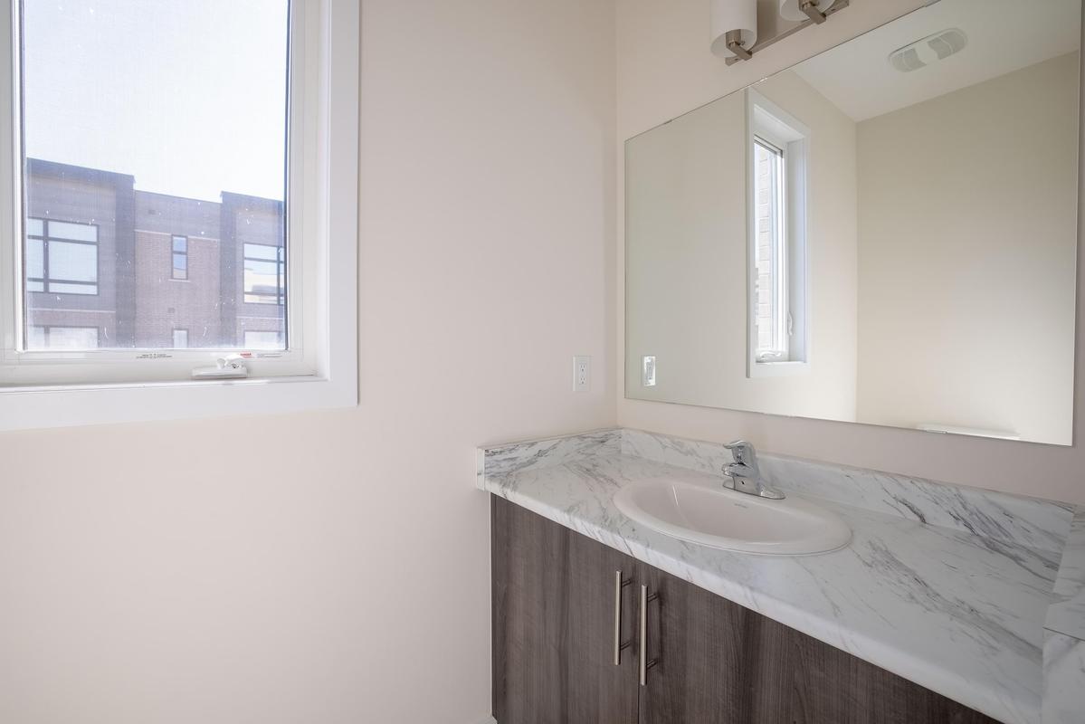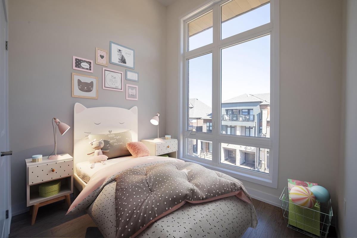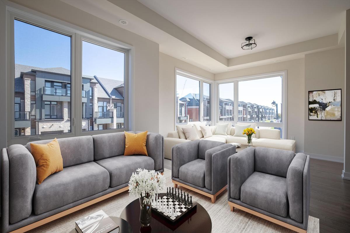 The second floor is light filled with an open concept kitchen, dining, and living area under 10 ft ceilings. The kitchen features stainless steel appliances, a centre island, and generous storage. The dining room has a walkout to the balcony for easy indoor to outdoor entertaining, and a powder room completes the level.