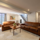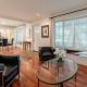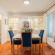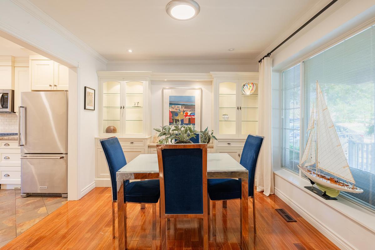 The kitchen features granite counters, a designer backsplash and stainless-steel appliances with direct access to a large private deck. The adjoining dining room with built-in cabinetry overlooks the living room, creating a warm and connected main-floor plan. A versatile main-floor den or bedroom with a nearby four-piece bath adds flexibility for guests.