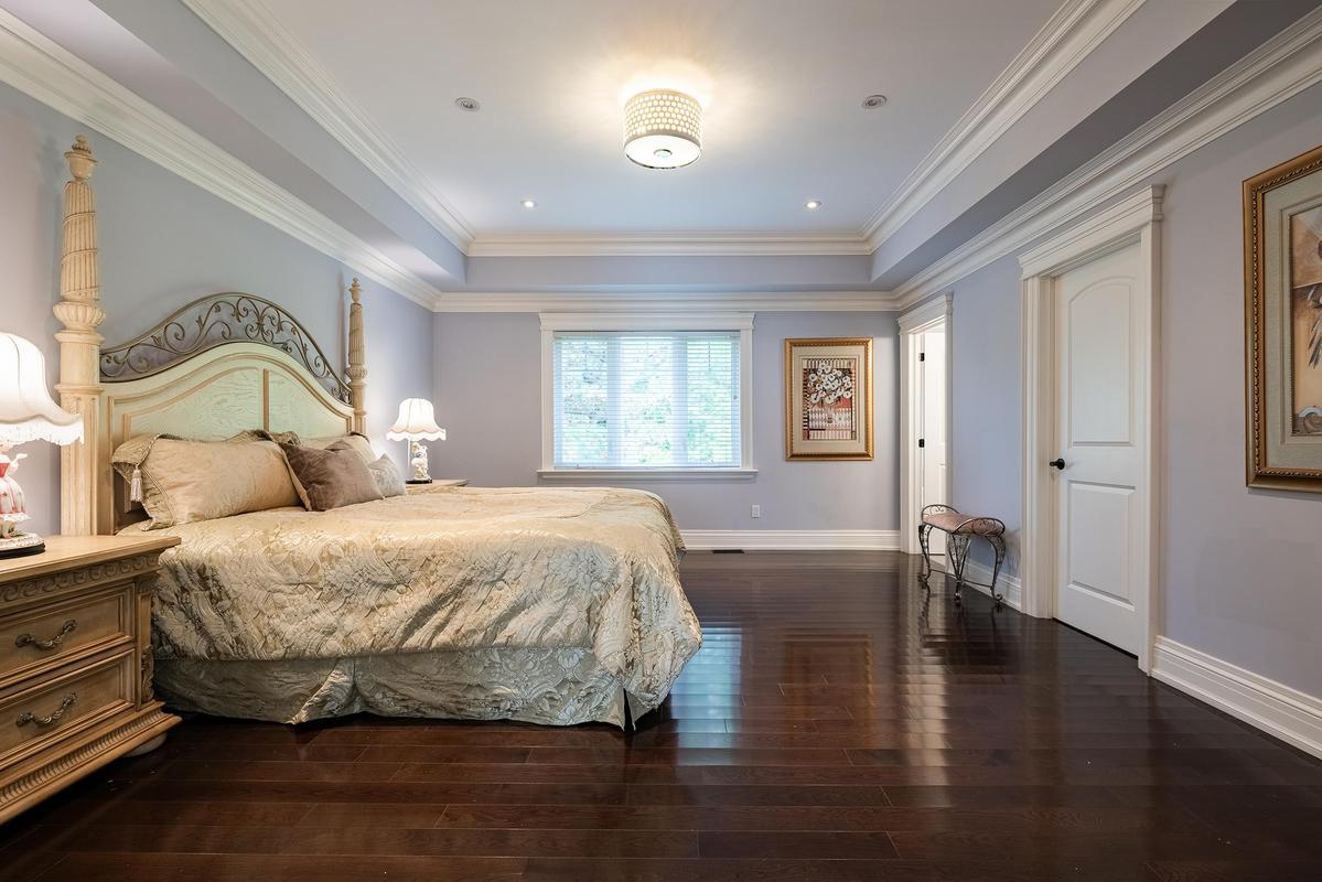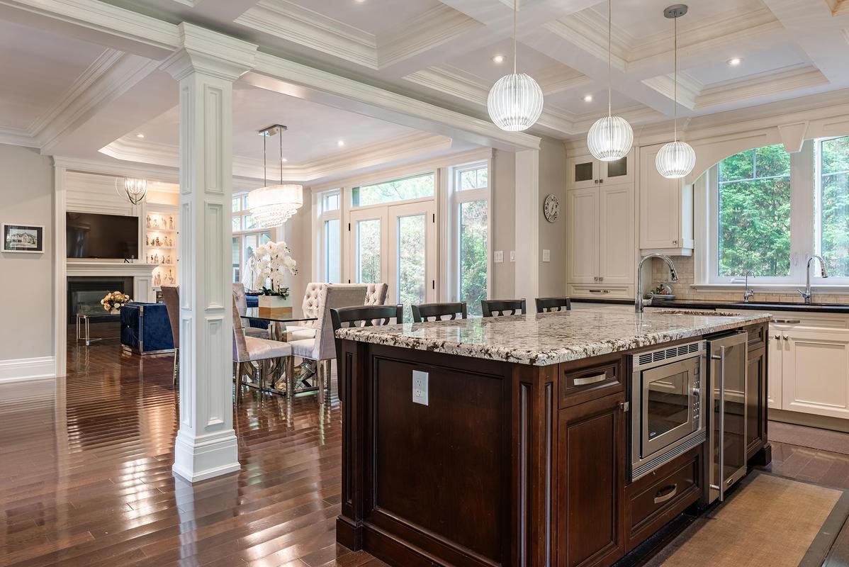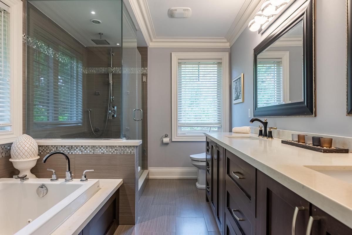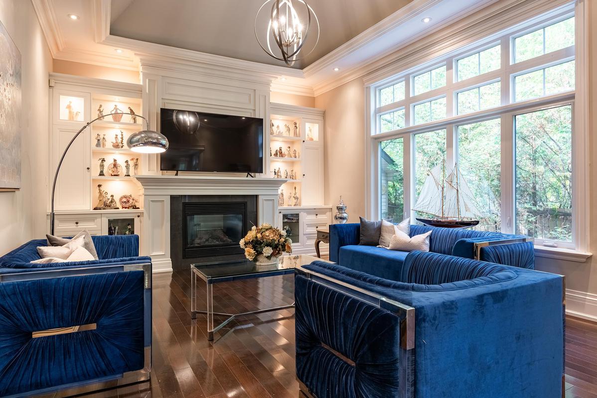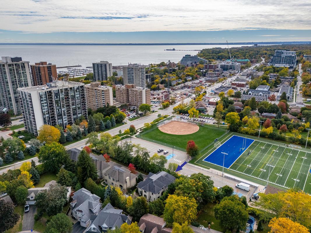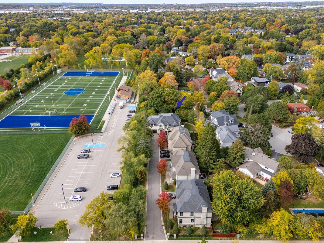 This distinguished custom-built two-storey residence offers over 5,600 square feet of refined living space, including 3,700 square feet above grade and nearly 2,000 square feet in a luxuriously finished lower level nestled within a prestigious Bronte East enclave. Step through the double entry doors into an impressive two-storey foyer crowned by soaring 20-foot ceilings and an open gallery overlook. Expansive transom windows bathe the space in natural light, highlighting the floating hardwood staircase with wrought-iron railings. The main level unfolds with an open-concept layout featuring hardwood floors, vaulted and recessed ceilings, French doors, custom millwork, and oversized picture windows that fill each room with light. The family room serves as a true architectural centerpiece with its 14-foot vaulted ceiling and floor-to-ceiling fireplace, while six additional rooms offer the flexibility to tailor each space to your lifestyle. The Chef's kitchen blends form and function with custom cabinetry, premium built-in appliances, and an expansive centre island ideal for both cooking and entertaining. The upper level hosts four spacious bedrooms, including a primary suite overlooking the rear and side gardens. This retreat features a spa-inspired five-piece ensuite complete with a floor-to-ceiling glass shower and whirlpool-style jetted tub. Two of the secondary bedrooms boast graceful, vaulted ceilings, adding a sense of airiness and architectural character. Mature trees and lush greenery envelop the property, creating serene views from every window. The professionally finished lower level extends the home's luxurious living space, offering a recreation room, theatre room or fifth bedroom, home office, above-grade windows, and a three-piece bath. Outside, the manicured backyard oasis features a gazebo and flower garden, providing a tranquil setting for relaxation or entertaining. A true beauty that you can not miss.