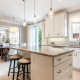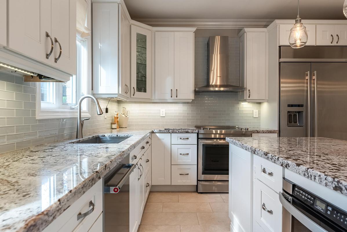 Attractive white kitchen has wood drawers and granite countertops. Renovated main floor laundry. Family room with gas fireplace has quartzite surround and built-in shelves. Bright living/dining area with cathedral ceiling.