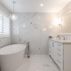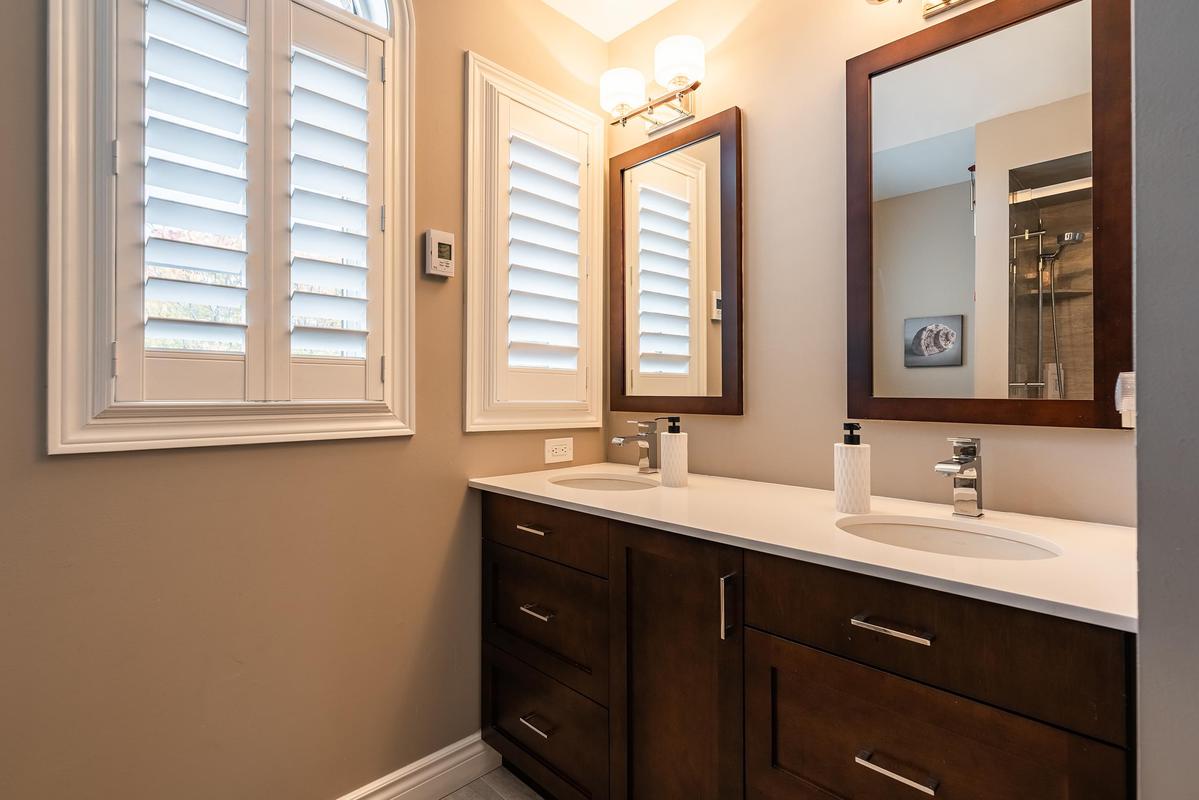 Primary suite with his and hers closets and exceptional ensuite. The enlarged 5 piece ensuite with heated floors, two custom vanities with Cambria countertops, glass shower and standalone tub. 4 piece main bath also renovated. Secondary bedrooms all good dimensions.