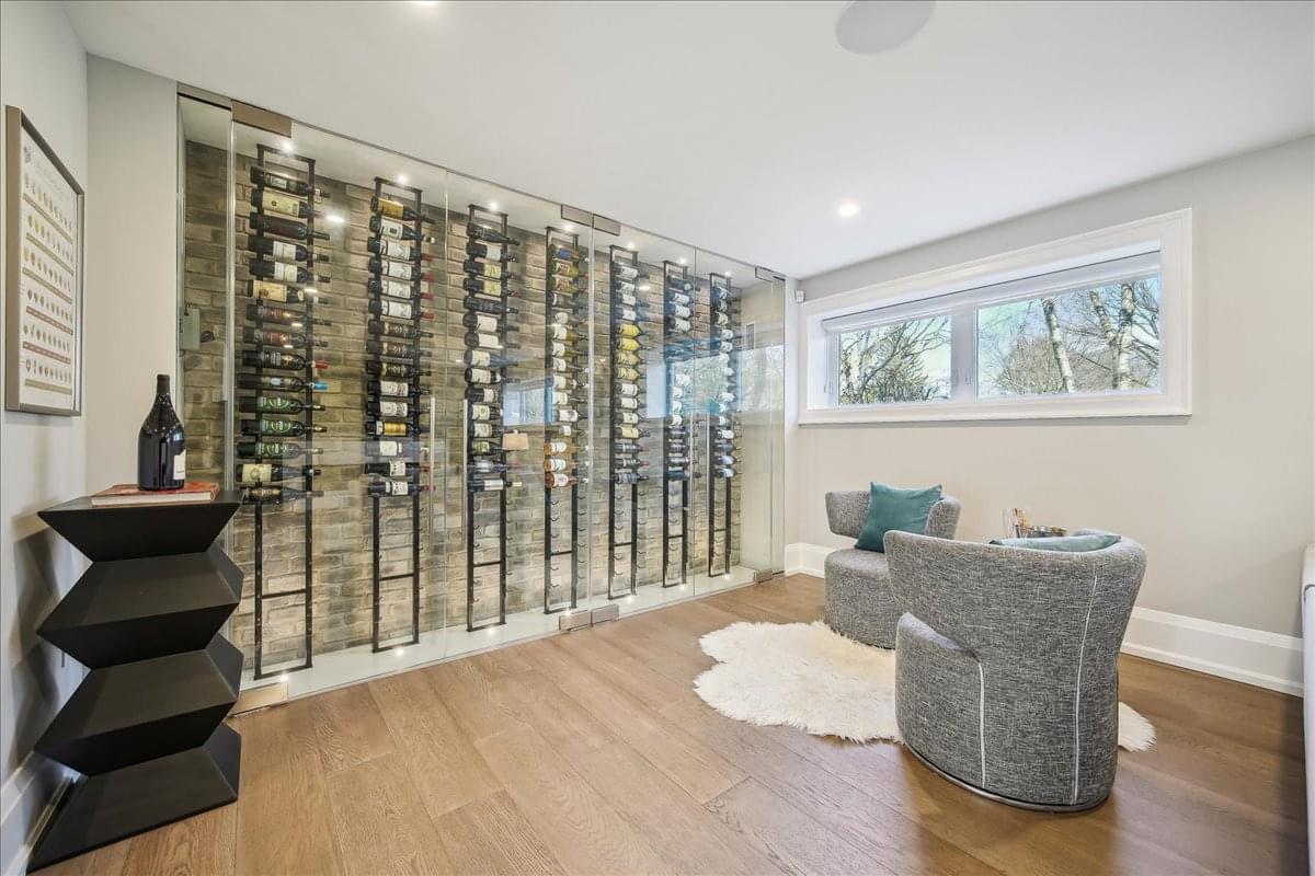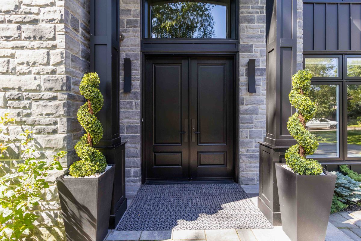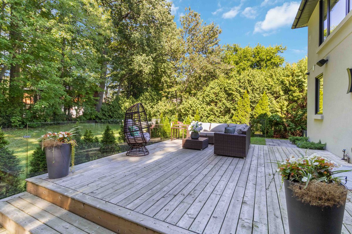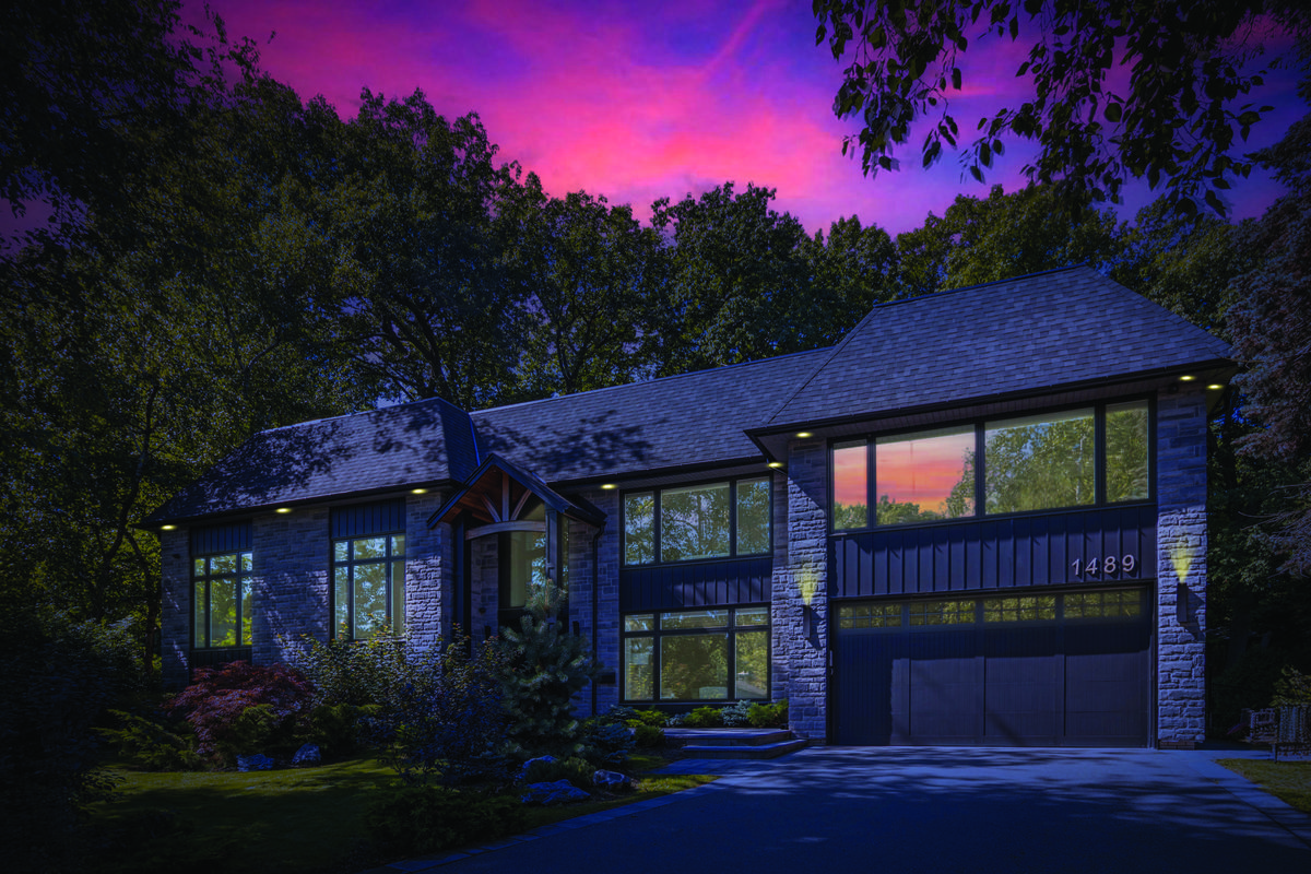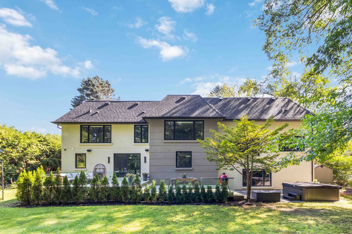 Nestled at the end of a quiet court in Lorne Parks prestigious White Oaks of Jalna, this custom 2021 five-bedroom home sits on a private pie-shaped 14,000+ sq ft lot enveloped by towering mature trees offering a Muskoka-like escape in the city. This ultra-modern residence blends elegance, warmth and high-end functionality, ideal for family living and entertaining. A grand façade and a stately double-door entry set the tone. Inside, a dramatic two-story foyer with a striking chandelier leads to a meticulously designed open-plan main floor. The chefs kitchen boasts custom cabinetry, a show stopping honed porcelain island and luxe Thermador appliances, including built-in wine cooler and coffee bar. A sun-filled dining area opens to the serene backyard, while the living room features a tray ceiling, a fireplace and modern built-ins. A few steps down, a family room showcases a 150-bottle temperature-controlled wine wall, a fireplace and access to a versatile rec room/office with side entrance. Upstairs, five generous bedrooms boast soaring ceilings and large windows. The oversized primary suite offers a steam fireplace, a custom walk-in closet with a center island and an oversized six-piece spa-like ensuite with rain shower, sauna and soaker tub overlooking the backyard. The entertainers basement boasts a wet bar, waterfall island, multi-TV wall and eight-seat home theatre. No detail is overlooked with upgrades like motorized shades, heated flooring, custom cabinetry, Control4 home automation, security system and surround sound. The remarkably private west-facing backyard spans 150 ft across the rear, and features a hot tub, cedar-lined multi-level deck with glass railings, Wi-Fi speakers, gas BBQ hookup, and ample space for a pool or play area. Ideally located near top schools, parks, shops and fine dining, with easy access to GO Transit and the QEW this home delivers the perfect blend of peaceful luxury and urban connectivity, just 30 minutes from downtown Toronto. (41247570)
