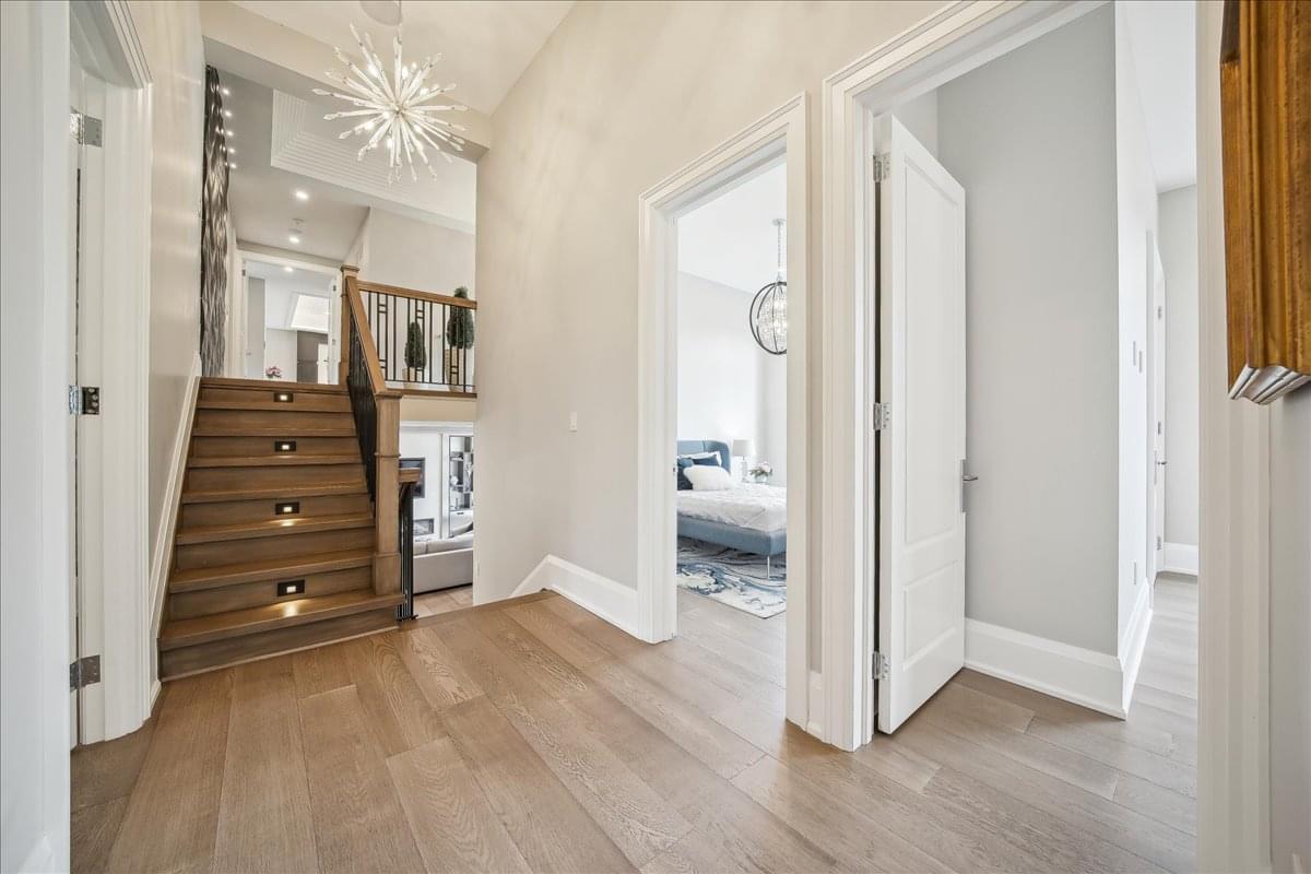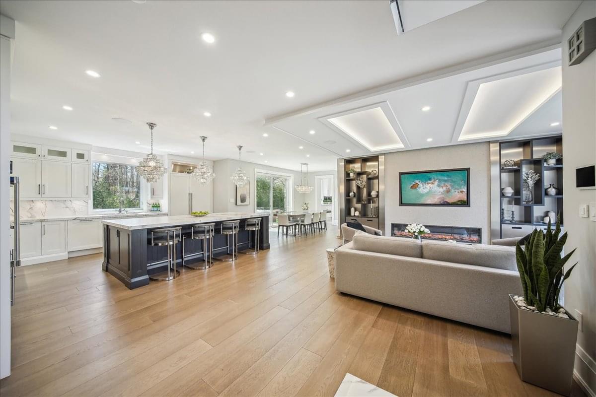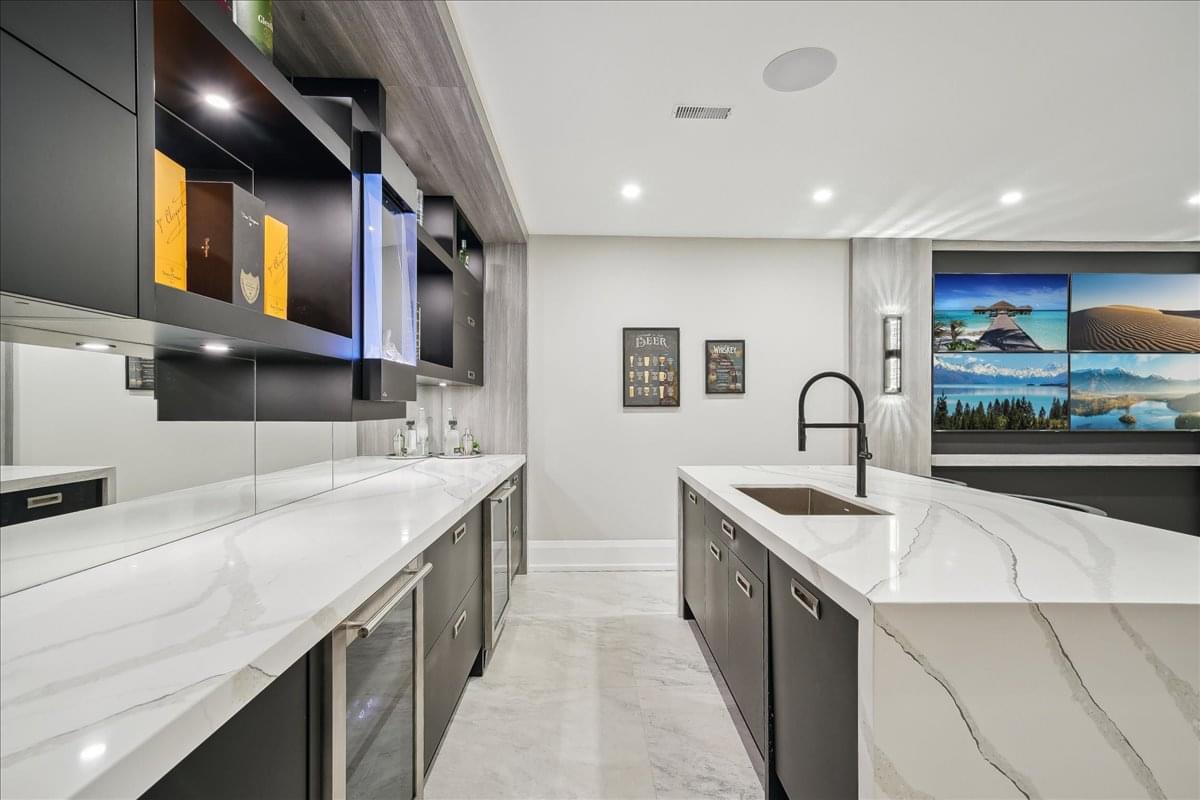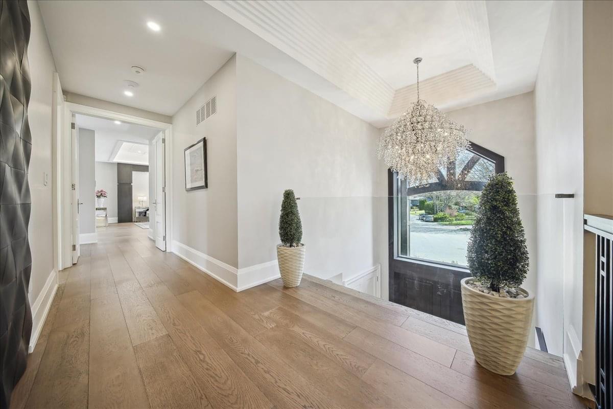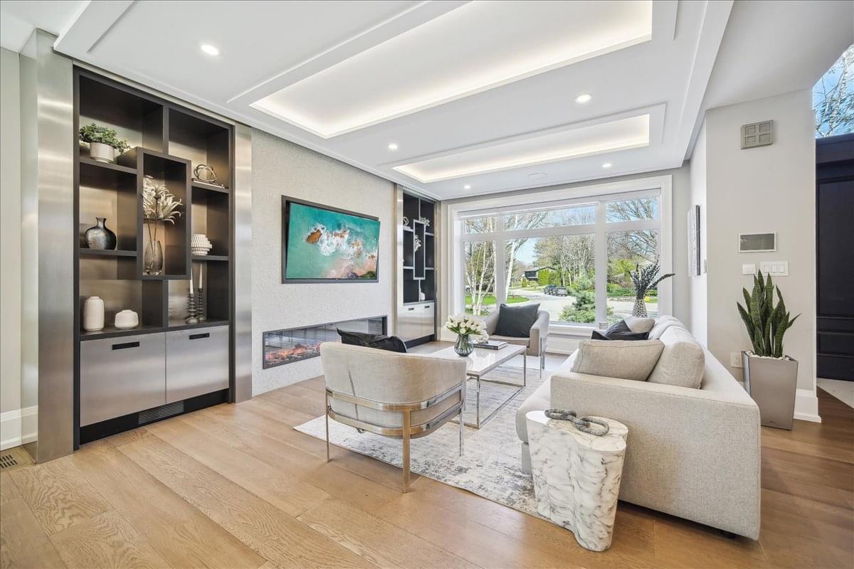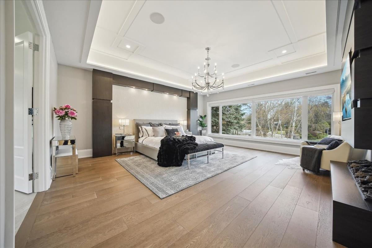 Nestled at the end of a quiet court in Lorne Parks prestigious White Oaks of Jalna, this custom 2021 five-bedroom home sits on a private pie-shaped 14,000+ sq ft lot enveloped by towering mature trees offering a Muskoka-like escape in the city. This ultra-modern residence blends elegance, warmth and high-end functionality, ideal for family living and entertaining. A grand façade and a stately double-door entry set the tone. Inside, a dramatic two-story foyer with a striking chandelier leads to a meticulously designed open-plan main floor. The chefs kitchen boasts custom cabinetry, a show stopping honed porcelain island and luxe Thermador appliances, including built-in wine cooler and coffee bar. A sun-filled dining area opens to the serene backyard, while the living room features a tray ceiling, a fireplace and modern built-ins. A few steps down, a family room showcases a 150-bottle temperature-controlled wine wall, a fireplace and access to a versatile rec room/office with side entrance. Upstairs, five generous bedrooms boast soaring ceilings and large windows. The oversized primary suite offers a steam fireplace, a custom walk-in closet with a center island and an oversized six-piece spa-like ensuite with rain shower, sauna and soaker tub overlooking the backyard. The entertainers basement boasts a wet bar, waterfall island, multi-TV wall and eight-seat home theatre. No detail is overlooked with upgrades like motorized shades, heated flooring, custom cabinetry, Control4 home automation, security system and surround sound. The remarkably private west-facing backyard spans 150 ft across the rear, and features a hot tub, cedar-lined multi-level deck with glass railings, Wi-Fi speakers, gas BBQ hookup, and ample space for a pool or play area. Ideally located near top schools, parks, shops and fine dining, with easy access to GO Transit and the QEW this home delivers the perfect blend of peaceful luxury and urban connectivity, just 30 minutes from downtown Toronto. (41247570)