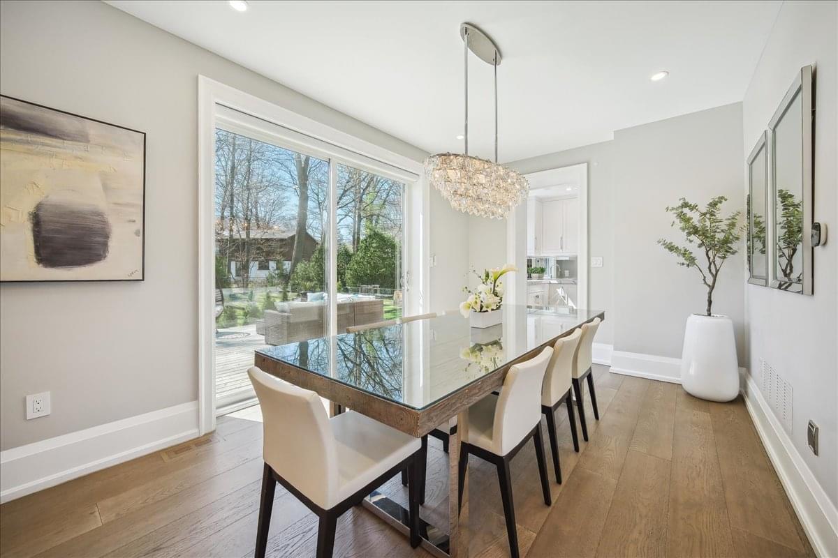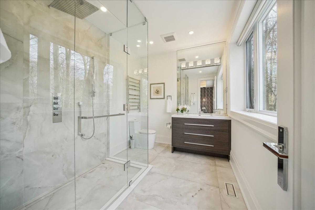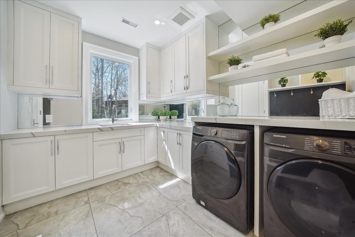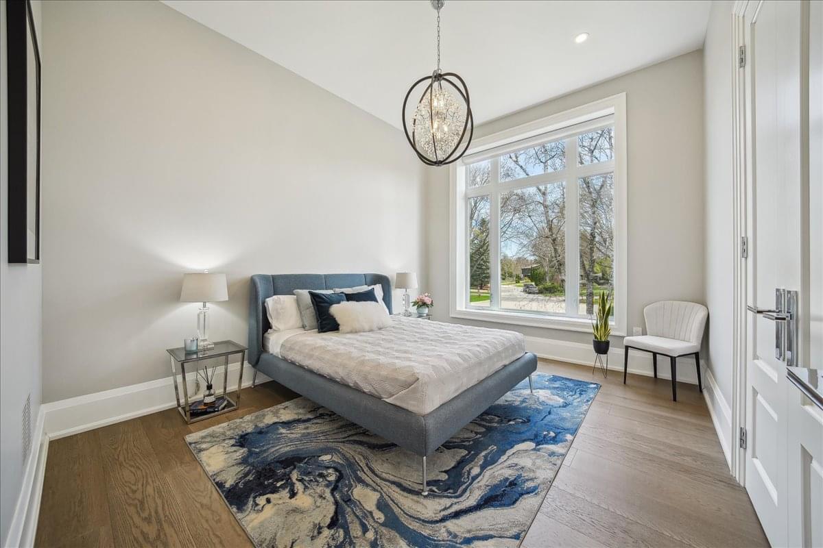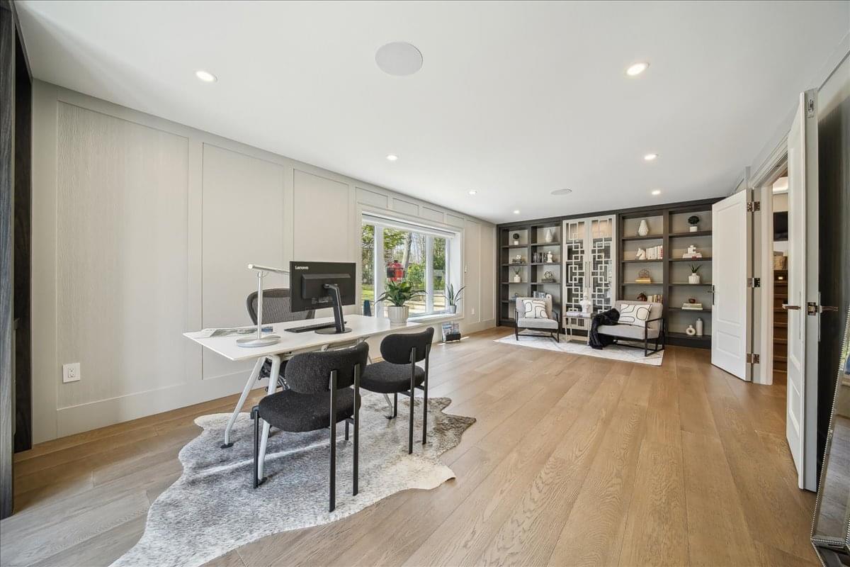 Nestled at the end of a quiet court in Lorne Parks prestigious White Oaks of Jalna, this custom 2021 five-bedroom home sits on a private pie-shaped 14,000+ sq ft lot enveloped by towering mature trees offering a Muskoka-like escape in the city. This ultra-modern residence blends elegance, warmth and high-end functionality, ideal for family living and entertaining. A grand façade and a stately double-door entry set the tone. Inside, a dramatic two-story foyer with a striking chandelier leads to a meticulously designed open-plan main floor. The chefs kitchen boasts custom cabinetry, a show stopping honed porcelain island and luxe Thermador appliances, including built-in wine cooler and coffee bar. A sun-filled dining area opens to the serene backyard, while the living room features a tray ceiling, a fireplace and modern built-ins. A few steps down, a family room showcases a 150-bottle temperature-controlled wine wall, a fireplace and access to a versatile rec room/office with side entrance. Upstairs, five generous bedrooms boast soaring ceilings and large windows. The oversized primary suite offers a steam fireplace, a custom walk-in closet with a center island and an oversized six-piece spa-like ensuite with rain shower, sauna and soaker tub overlooking the backyard. The entertainers basement boasts a wet bar, waterfall island, multi-TV wall and eight-seat home theatre. No detail is overlooked with upgrades like motorized shades, heated flooring, custom cabinetry, Control4 home automation, security system and surround sound. The remarkably private west-facing backyard spans 150 ft across the rear, and features a hot tub, cedar-lined multi-level deck with glass railings, Wi-Fi speakers, gas BBQ hookup, and ample space for a pool or play area. Ideally located near top schools, parks, shops and fine dining, with easy access to GO Transit and the QEW this home delivers the perfect blend of peaceful luxury and urban connectivity, just 30 minutes from downtown Toronto. (41247570)