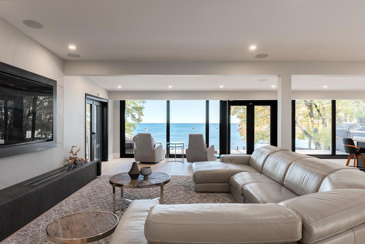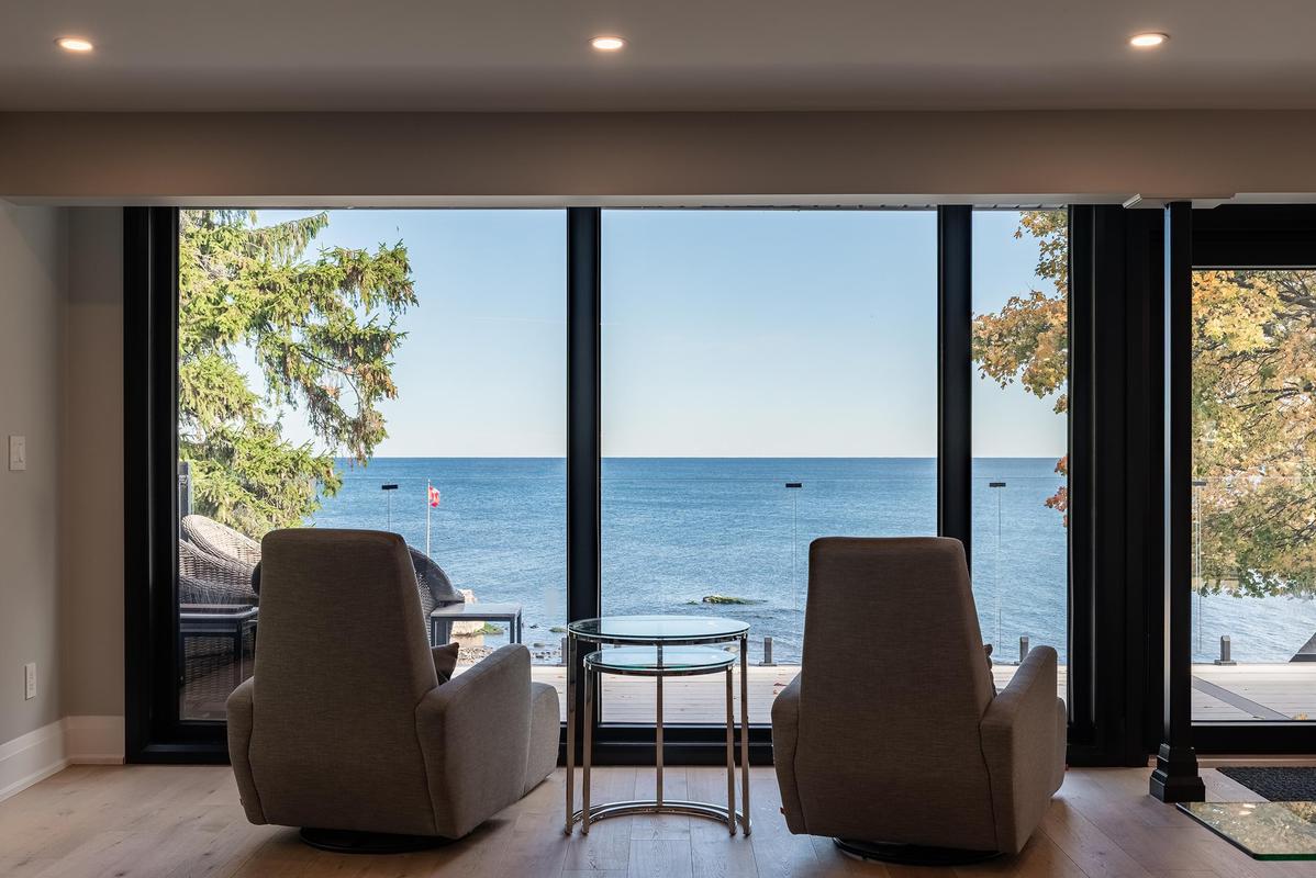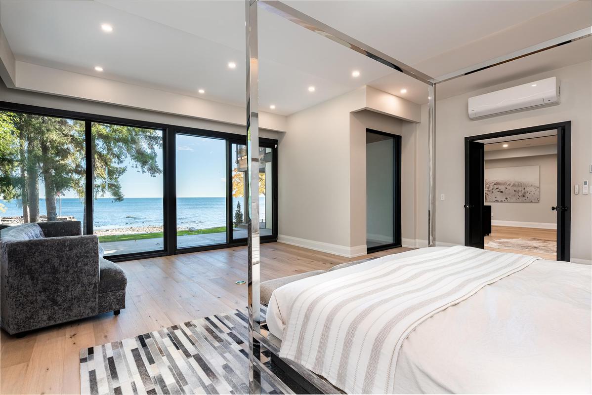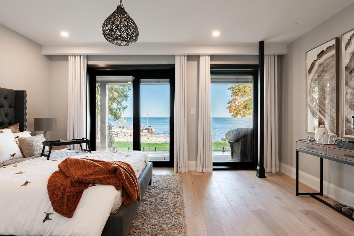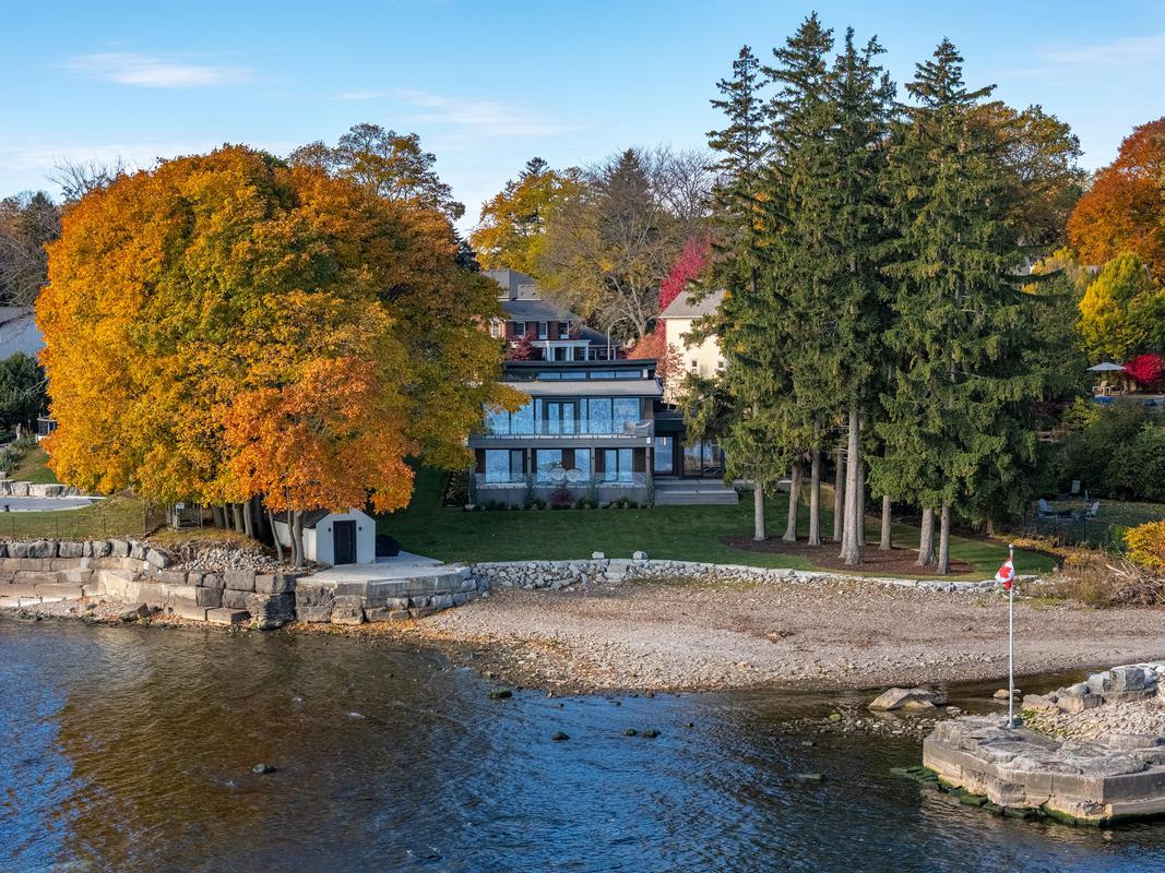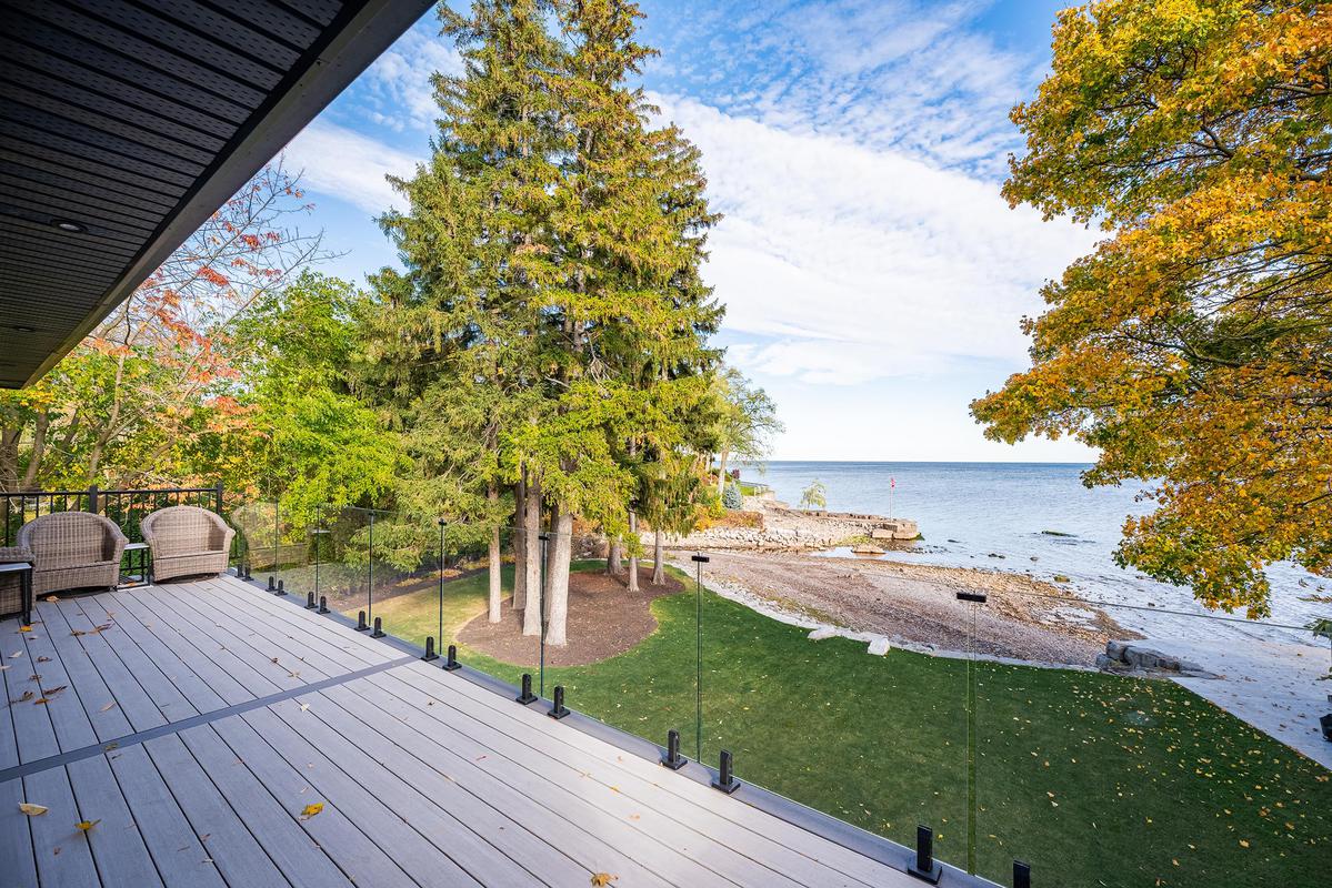 Natural serenity meets modern design at 121 Edgecliffe Place. Set on a rare 29,000 sq. ft. pie-shaped lakefront lot where Appleby Creek meets Lake Ontario, this exceptional property offers 105 feet of direct waterfront and 130 feet along the creek with riparian rights, creating an irreplaceable natural setting in the city. This fully renovated home offers over 5,200 sq. ft. of finished living space with floor-to-ceiling windows that draw the lake and landscape into every room. The open-concept main level features 12-foot peaked ceilings, engineered light hardwood, and dark-framed windows that frame panoramic southern views. A chef's kitchen anchors the space with a large island and top-tier appliances, ideal for entertaining. The walkout lower level accommodates four bedrooms, each with its own ensuite and ductless air conditioning unit. The primary suite opens directly to the lakeside deck, featuring a spa-inspired ensuite with dual rain showers and a massive walk-in closet with custom cabinetry. Radiant in-floor heating extends throughout the home for year-round comfort. Multiple outdoor living spaces blur the line between indoors and out. A covered lower deck and expansive upper terrace with built-in BBQ maximize lakefront enjoyment and capture the home's stunning setting. Modern. Peaceful. One of a kind on the water.