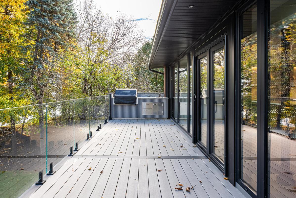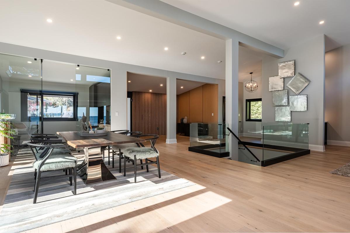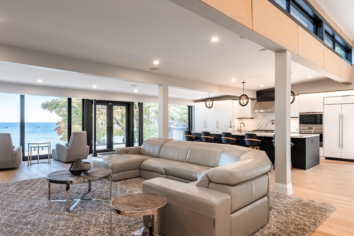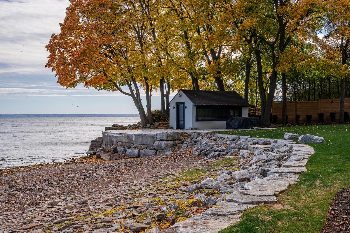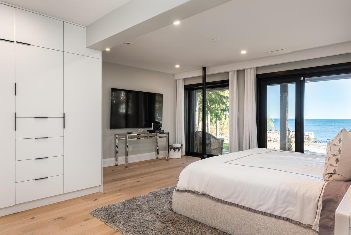 Natural serenity meets modern design at 121 Edgecliffe Place. Set on a rare 29,000 sq. ft. pie-shaped lakefront lot where Appleby Creek meets Lake Ontario, this exceptional property offers 105 feet of direct waterfront and 130 feet along the creek with riparian rights, creating an irreplaceable natural setting in the city. This fully renovated home offers over 5,200 sq. ft. of finished living space with floor-to-ceiling windows that draw the lake and landscape into every room. The open-concept main level features 12-foot peaked ceilings, engineered light hardwood, and dark-framed windows that frame panoramic southern views. A chef's kitchen anchors the space with a large island and top-tier appliances, ideal for entertaining. The walkout lower level accommodates four bedrooms, each with its own ensuite and ductless air conditioning unit. The primary suite opens directly to the lakeside deck, featuring a spa-inspired ensuite with dual rain showers and a massive walk-in closet with custom cabinetry. Radiant in-floor heating extends throughout the home for year-round comfort. Multiple outdoor living spaces blur the line between indoors and out. A covered lower deck and expansive upper terrace with built-in BBQ maximize lakefront enjoyment and capture the home's stunning setting. Modern. Peaceful. One of a kind on the water.