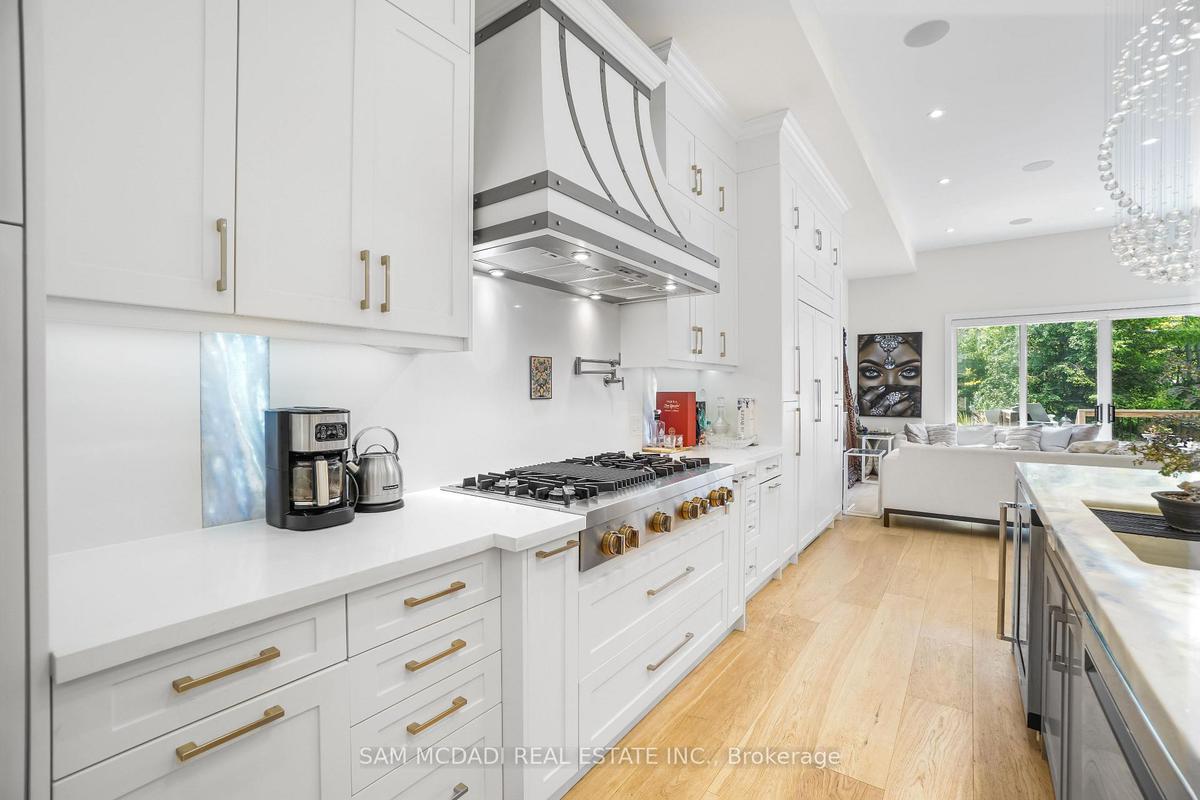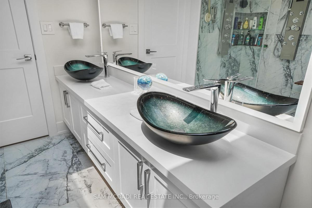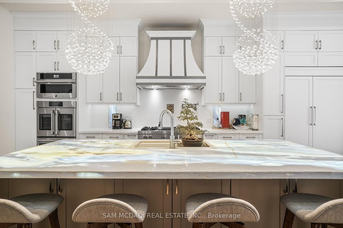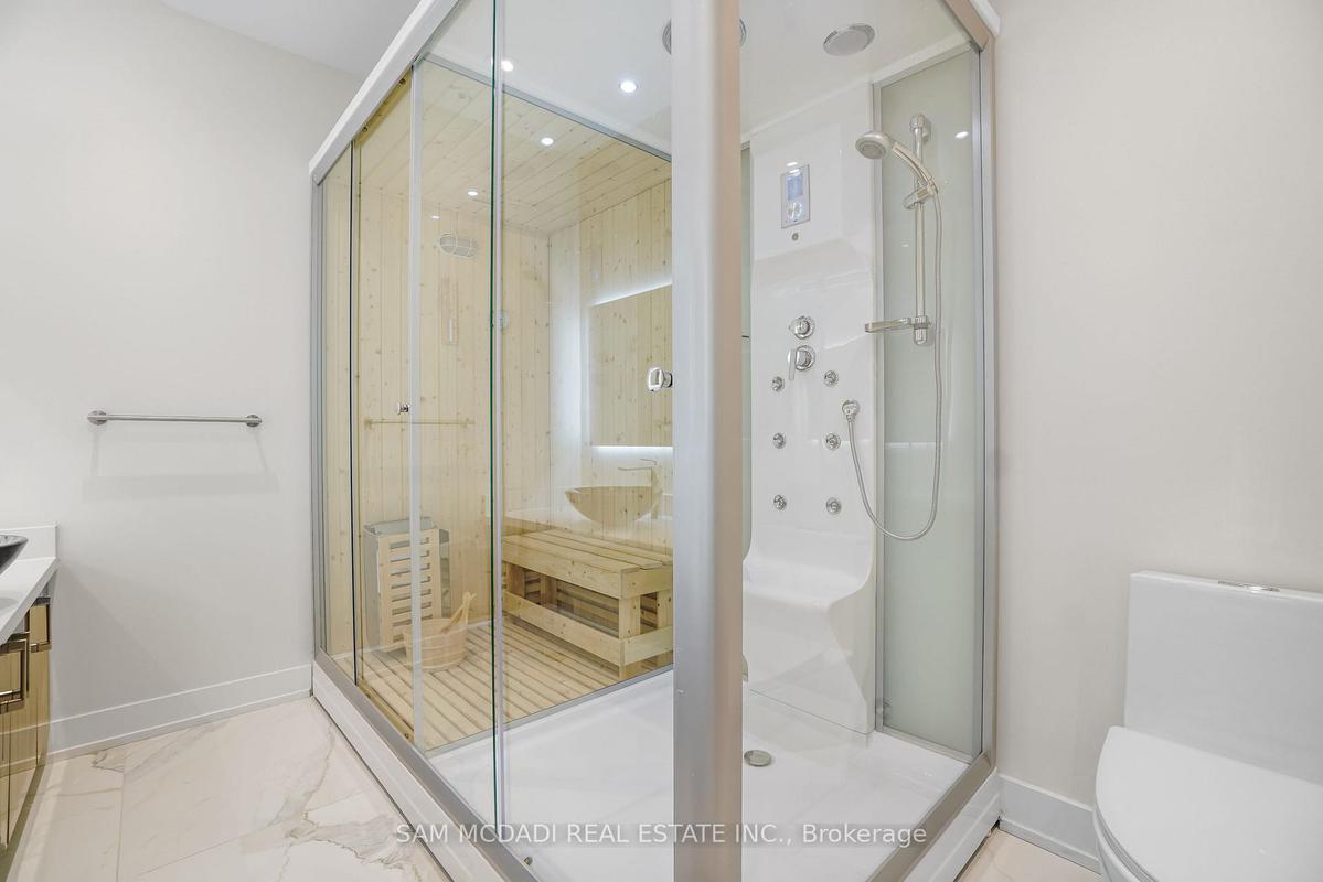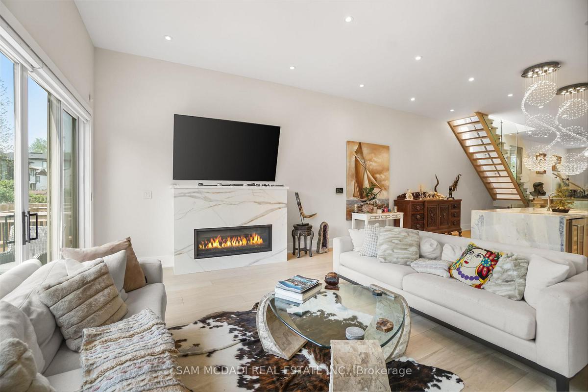 Calling all Blue Chip Tenants! Set in one of Mississauga's most sought-after and evolving neighbourhoods, 1036 Enola Avenue isn't just a home, it's a daily escape into luxury and modern living. Just minutes from the upcoming Lakeview Village, Port Credit, and Lake Ontario's shoreline, this stunning residence blends sophistication with everyday functionality, offering over 3,600 sq ft of meticulously finished space. With no detail overlooked, this custom showpiece features 11-ft ceilings on the main level, open-tread staircases, and sleek glass railings that create effortless flow and sophistication. At the heart of the home, the chef's kitchen is outfitted with built-in premium appliances, custom hood, and a showstopping illuminated imported marble island. Pot lights, wide-plank flooring, and integrated speakers enhance the modern aesthetic. The adjoining living area is anchored by a sleek gas fireplace and full-length windows framing tranquil, green views. The spa-inspired primary suite offers a sculptural soaking tub, dual rainfall shower towers, and a custom walk-in closet. Additional bedrooms are generously sized with designer finishes, and a skylight above the upper hallway floods the space with natural light. The fully finished lower level elevates the living experience with a glass-enclosed wine cellar, private sauna, and a separate walk-up entrance, ideal for extended family or a home office. A modern bathroom with double vessel sinks completes the space. Each level features built-in iPad screens connected to the door camera system for secure, voice-enabled entry, while integrated speakers throughout the home are powered by a premium Onkyo audio system perfect for immersive, whole-home sound. Outside, a fenced yard and deck create a private setting for summer entertaining. Just steps from lakefront parks, golf, top-tier schools, and with easy access to the QEW, Highway 403, and the GO Station, this is luxury living in Lakeview at its finest.