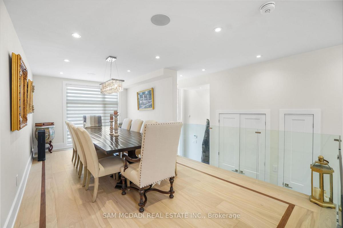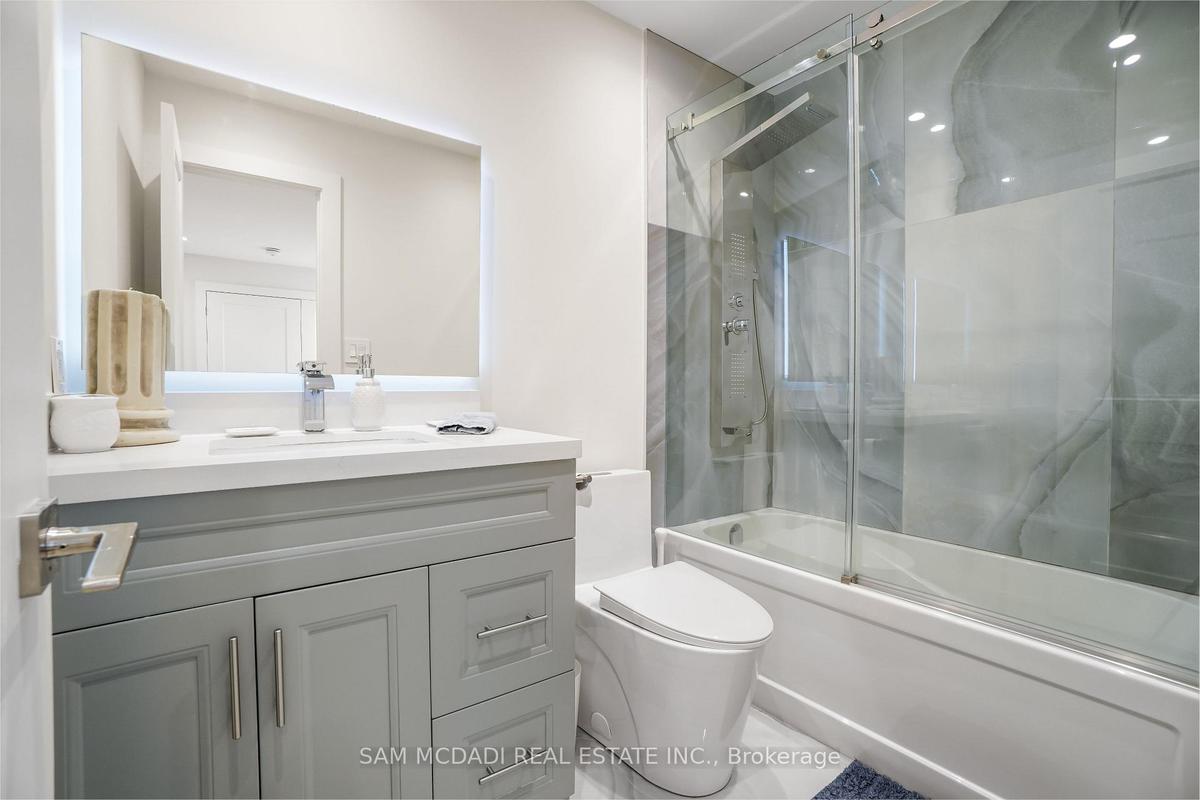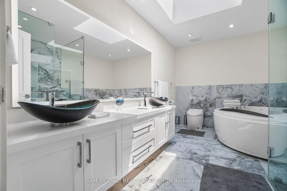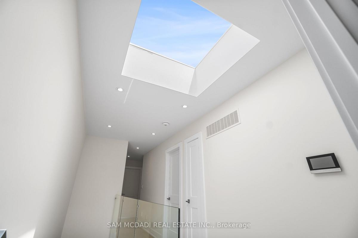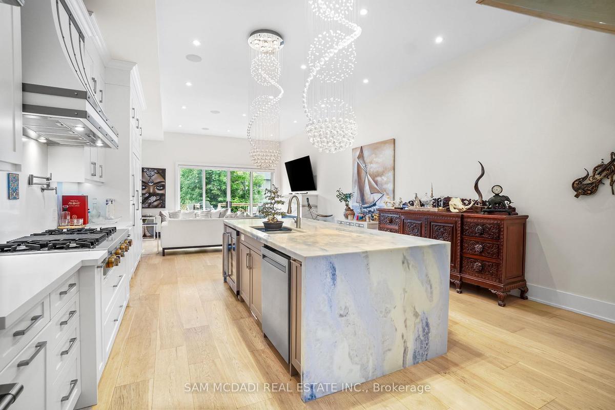 Calling all Blue Chip Tenants! Set in one of Mississauga's most sought-after and evolving neighbourhoods, 1036 Enola Avenue isn't just a home, it's a daily escape into luxury and modern living. Just minutes from the upcoming Lakeview Village, Port Credit, and Lake Ontario's shoreline, this stunning residence blends sophistication with everyday functionality, offering over 3,600 sq ft of meticulously finished space. With no detail overlooked, this custom showpiece features 11-ft ceilings on the main level, open-tread staircases, and sleek glass railings that create effortless flow and sophistication. At the heart of the home, the chef's kitchen is outfitted with built-in premium appliances, custom hood, and a showstopping illuminated imported marble island. Pot lights, wide-plank flooring, and integrated speakers enhance the modern aesthetic. The adjoining living area is anchored by a sleek gas fireplace and full-length windows framing tranquil, green views. The spa-inspired primary suite offers a sculptural soaking tub, dual rainfall shower towers, and a custom walk-in closet. Additional bedrooms are generously sized with designer finishes, and a skylight above the upper hallway floods the space with natural light. The fully finished lower level elevates the living experience with a glass-enclosed wine cellar, private sauna, and a separate walk-up entrance, ideal for extended family or a home office. A modern bathroom with double vessel sinks completes the space. Each level features built-in iPad screens connected to the door camera system for secure, voice-enabled entry, while integrated speakers throughout the home are powered by a premium Onkyo audio system perfect for immersive, whole-home sound. Outside, a fenced yard and deck create a private setting for summer entertaining. Just steps from lakefront parks, golf, top-tier schools, and with easy access to the QEW, Highway 403, and the GO Station, this is luxury living in Lakeview at its finest.