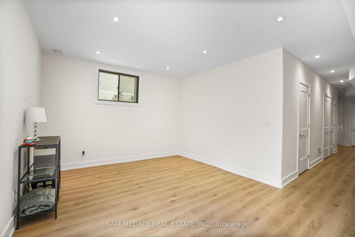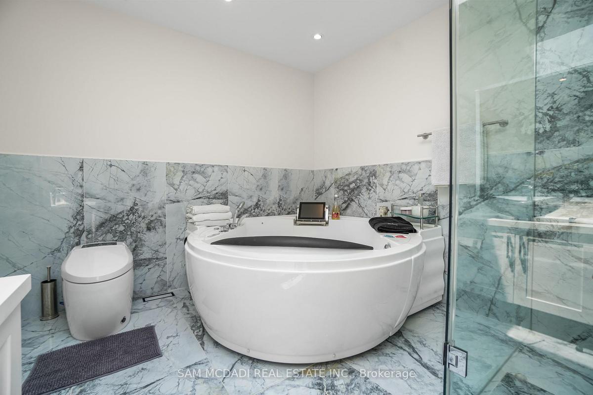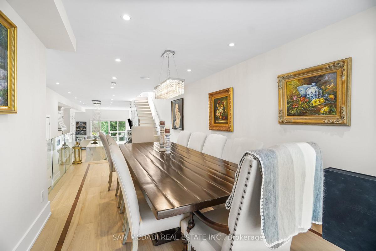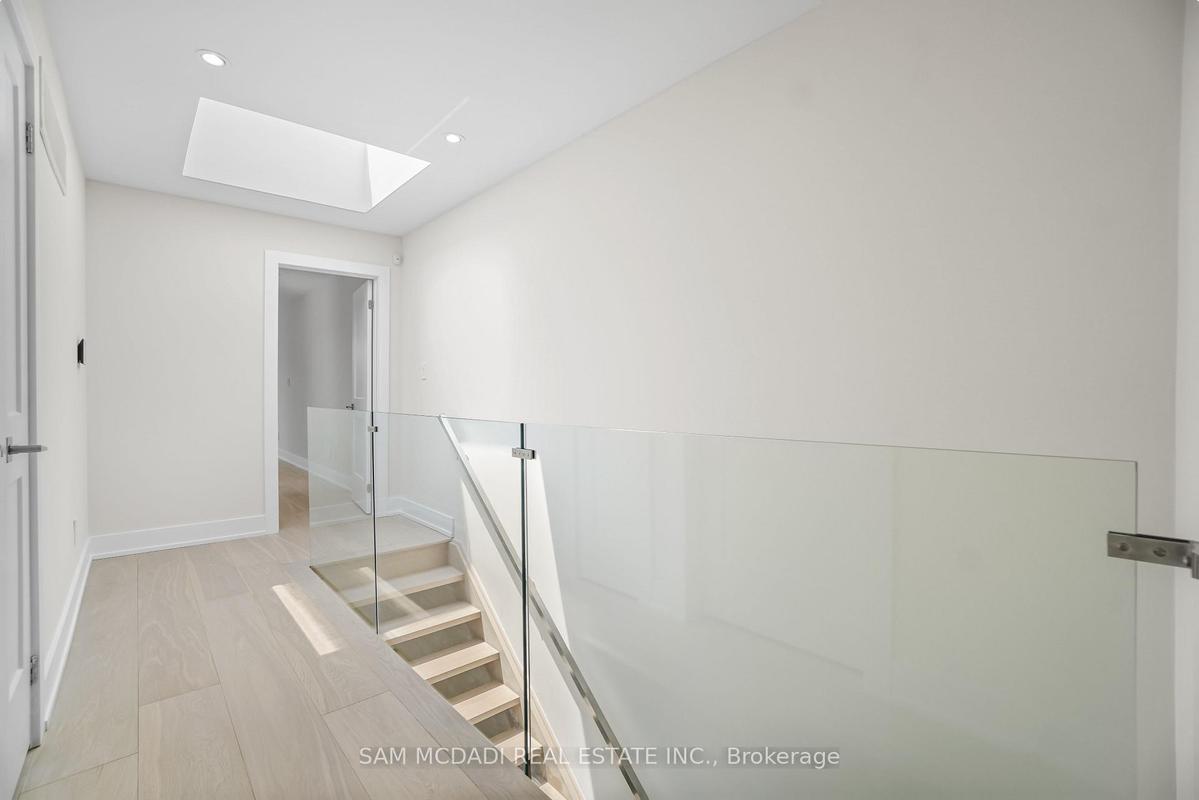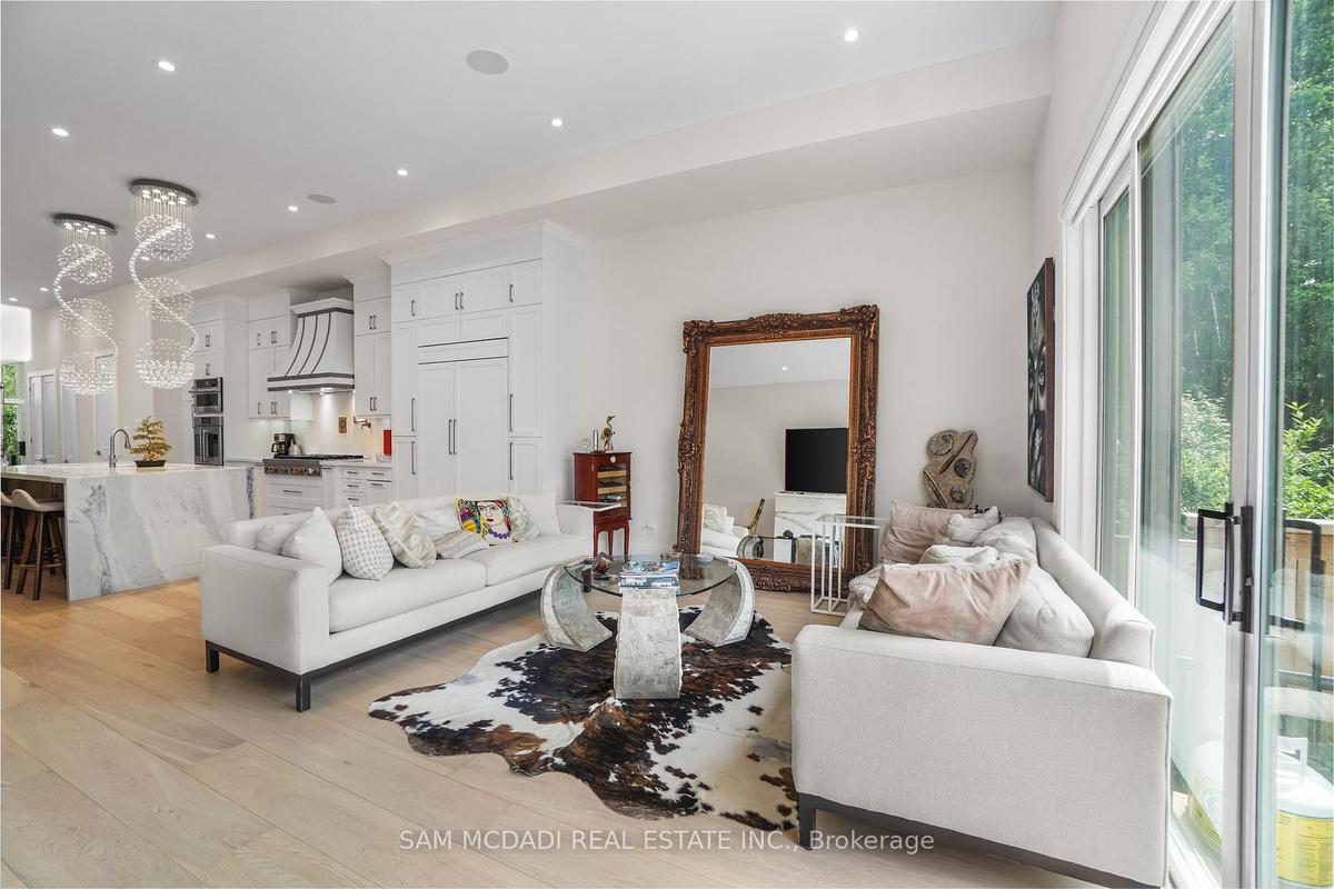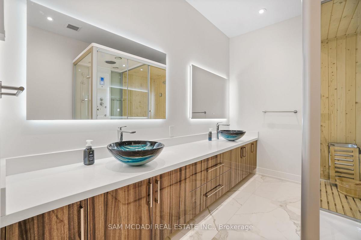 Calling all Blue Chip Tenants! Set in one of Mississauga's most sought-after and evolving neighbourhoods, 1036 Enola Avenue isn't just a home, it's a daily escape into luxury and modern living. Just minutes from the upcoming Lakeview Village, Port Credit, and Lake Ontario's shoreline, this stunning residence blends sophistication with everyday functionality, offering over 3,600 sq ft of meticulously finished space. With no detail overlooked, this custom showpiece features 11-ft ceilings on the main level, open-tread staircases, and sleek glass railings that create effortless flow and sophistication. At the heart of the home, the chef's kitchen is outfitted with built-in premium appliances, custom hood, and a showstopping illuminated imported marble island. Pot lights, wide-plank flooring, and integrated speakers enhance the modern aesthetic. The adjoining living area is anchored by a sleek gas fireplace and full-length windows framing tranquil, green views. The spa-inspired primary suite offers a sculptural soaking tub, dual rainfall shower towers, and a custom walk-in closet. Additional bedrooms are generously sized with designer finishes, and a skylight above the upper hallway floods the space with natural light. The fully finished lower level elevates the living experience with a glass-enclosed wine cellar, private sauna, and a separate walk-up entrance, ideal for extended family or a home office. A modern bathroom with double vessel sinks completes the space. Each level features built-in iPad screens connected to the door camera system for secure, voice-enabled entry, while integrated speakers throughout the home are powered by a premium Onkyo audio system perfect for immersive, whole-home sound. Outside, a fenced yard and deck create a private setting for summer entertaining. Just steps from lakefront parks, golf, top-tier schools, and with easy access to the QEW, Highway 403, and the GO Station, this is luxury living in Lakeview at its finest.