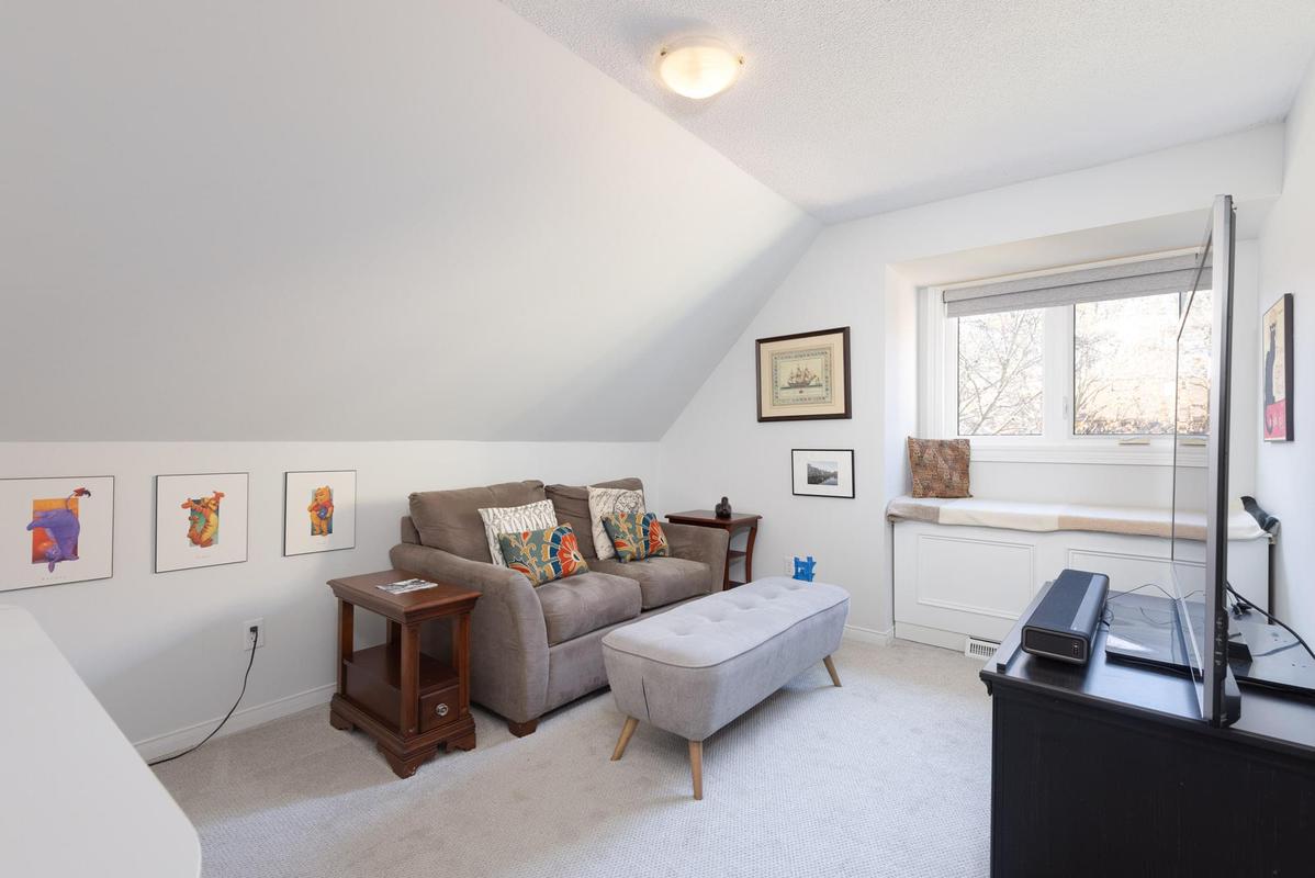 Nestled along the beautiful ravine trail system of Sawmill Valley, in the sought after gated community of Eagle Ridge, you will delight in this expansive executive two storey end-unit townhome offering over 2750sf of finished living space, with a versatile lower level perfect for family, work, or recreation. Step into a spacious foyer with a large coat closet and secondary access through the private garage. The main level is beautifully appointed with hardwood flooring throughout, complemented by crown moulding and wainscotting. The formal dining room enjoys a northwest exposure, filling the space with natural light. A bright and airy living room and breakfast area with many large windows, new blinds, gas fireplace, and walkout to back patio through sliding glass doors. Notice the conveniently located private powder room. The newly renovated kitchen is a highlight, featuring a quartz countertop, classic white cabinetry with large pot drawers and an additional sliding door to the barbecue patio. Upstairs, enjoy the new wood staircase with new spindles and railing. The primary bedroom overlooks the backyard with two large windows, spacious walk-in closet and fully renovated ensuite with glass-enclosed shower and separate vanities with storage. Two additional bedrooms offer large windows and ample closet space, with the second bedroom featuring an attractive bay window. The main 4-piece bathroom includes a tub/shower combination with a quartz-topped vanity. Upper level laundry washer and dryer is conveniently located. Additions include security guard at gate, a private recreation centre with indoor pool, hot tub, sauna, racquetball court and library. All included in your fees.