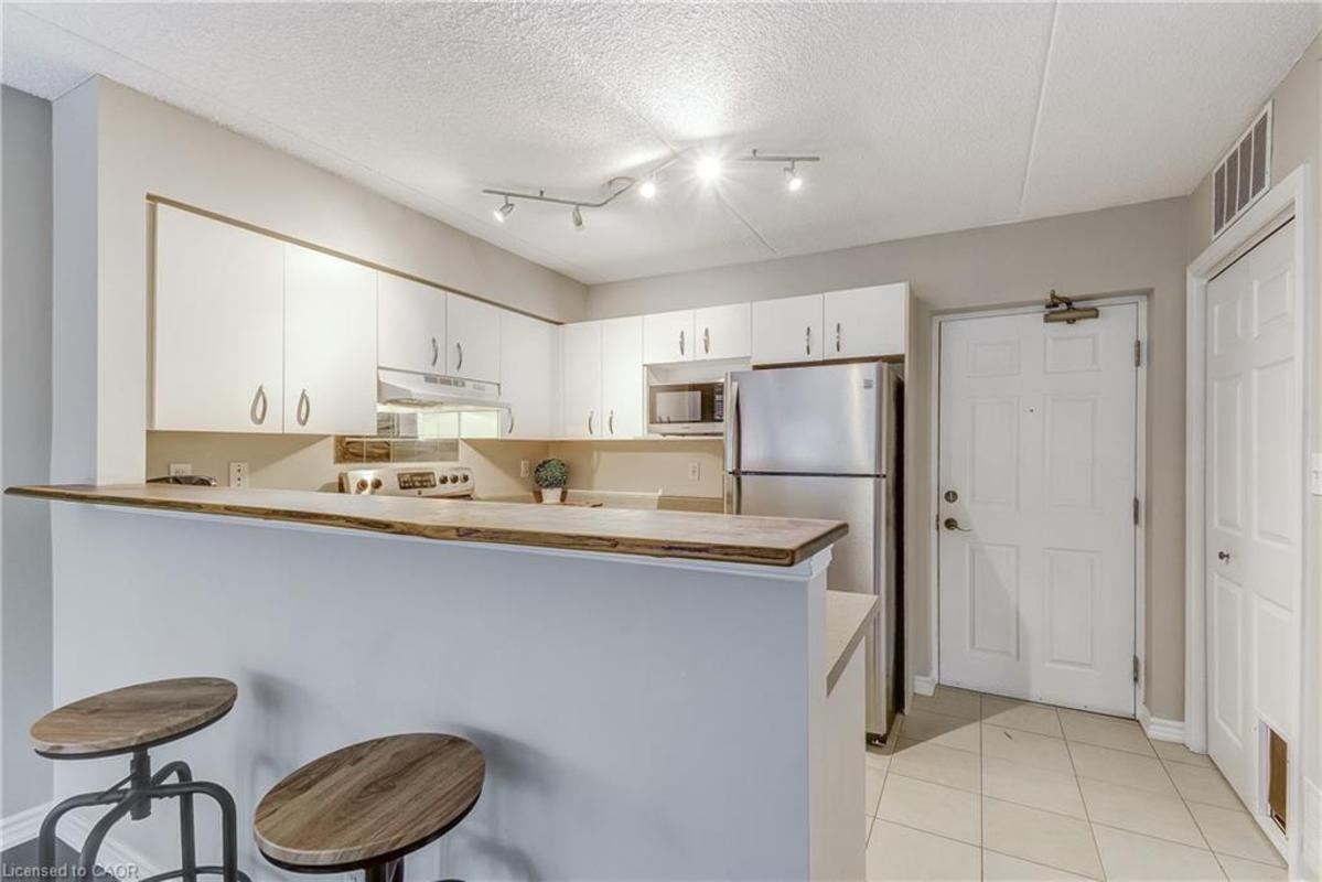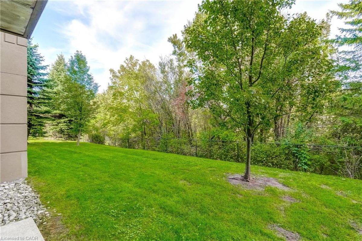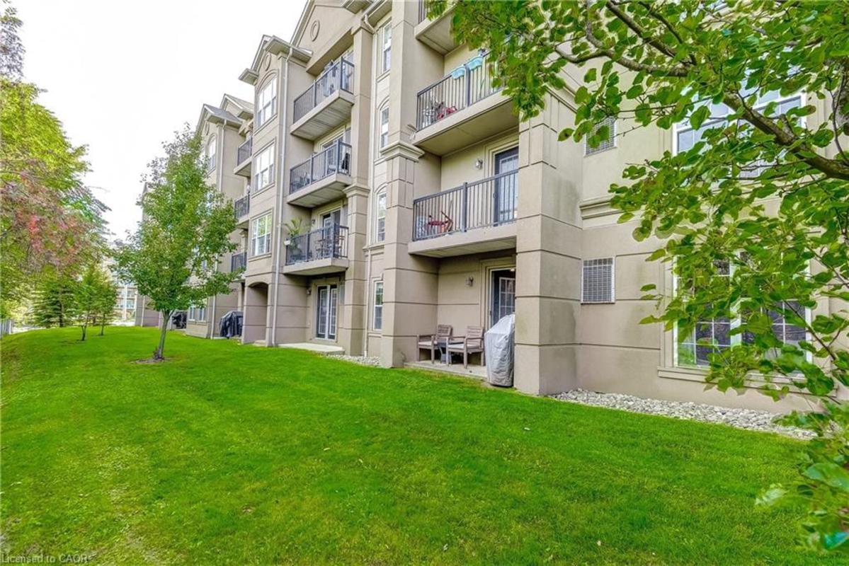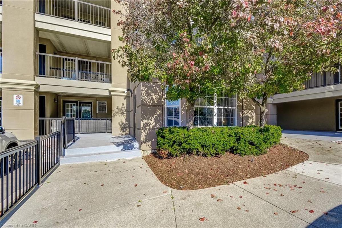 Welcome to Orchard Uptown, where quiet living meets everyday convenience. This main-level 1-bedroom, 1-bathroom condo is tucked into a peaceful area of the complex, offering a level of privacy that's hard to find-especially with a patio that looks out over ravine and greenspace rather than parking or traffic. The private patio is a true extension of the living space and a rare feature for a condo. Being on the main level and backing directly onto greenspace means easy outdoor access without elevators, stairwells, or long common hallways-a practical advantage for everyday living and especially convenient for those with a dog who want quick, stress-free access outside. Inside, the layout is bright, functional, and easy to live in. The open living area offers flexibility for daily routines and entertaining, the kitchen offers ample storage and workspace, and the bedroom is generously sized and comfortable. In-suite laundry adds convenience, and the Kitec plumbing has been professionally removed, offering added peace of mind. The unit includes one underground parking space and a storage locker, and the building is well managed with low condo fees. Residents enjoy access to a fitness centre, sauna, and party room, along with ample visitor parking. Location is a major advantage. Shopping, coffee shops, restaurants, and everyday essentials are located directly across the street. Commuters will appreciate quick access to the QEW, 407, and Appleby GO Station, while nearby trails and Bronte Creek Provincial Park provide excellent options for outdoor walks and recreation. A well-maintained condo offering privacy, main-level convenience, and direct access to greenspace-this is comfortable, low-maintenance living in one of Burlington's most established condo communities.