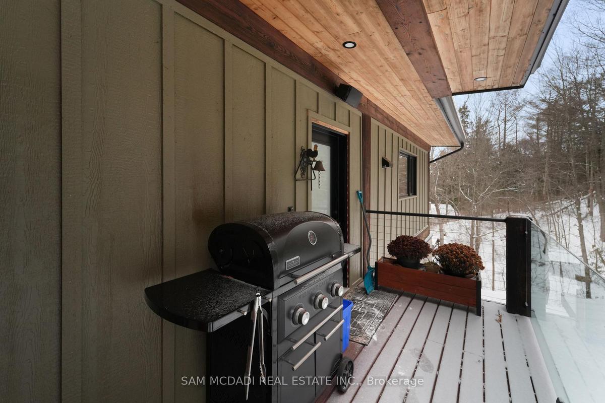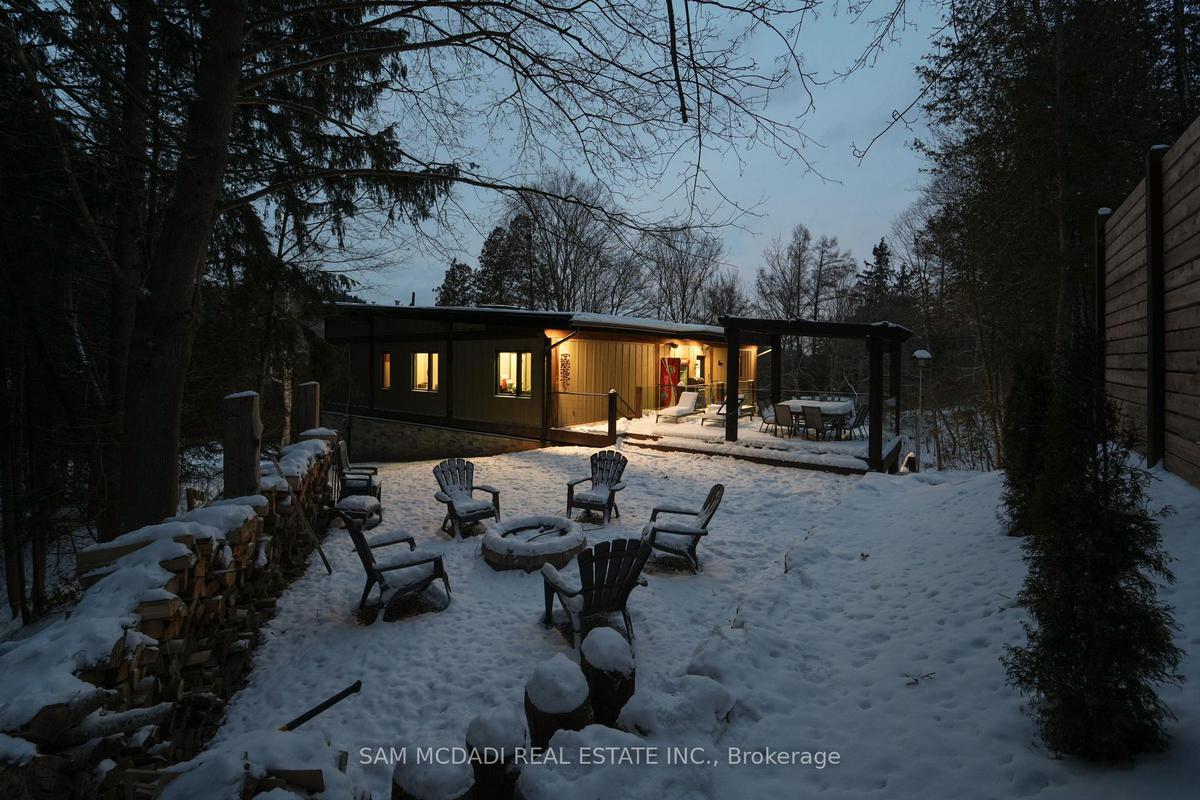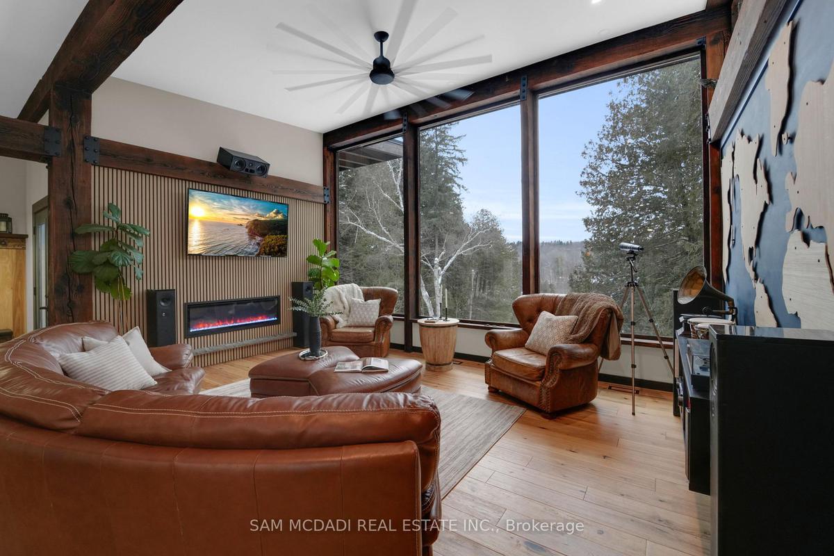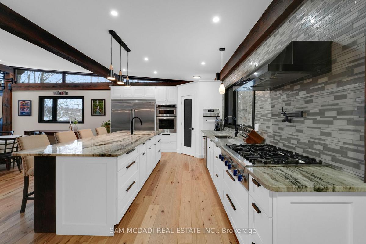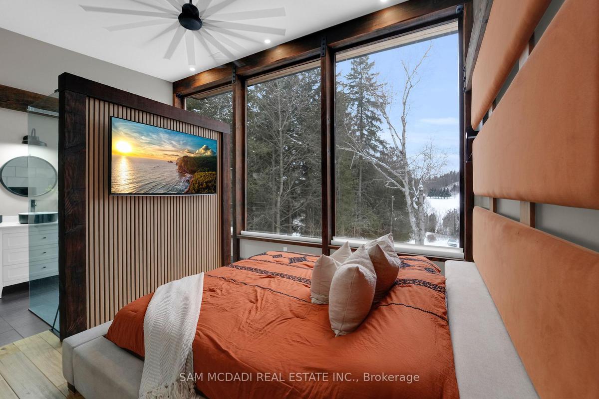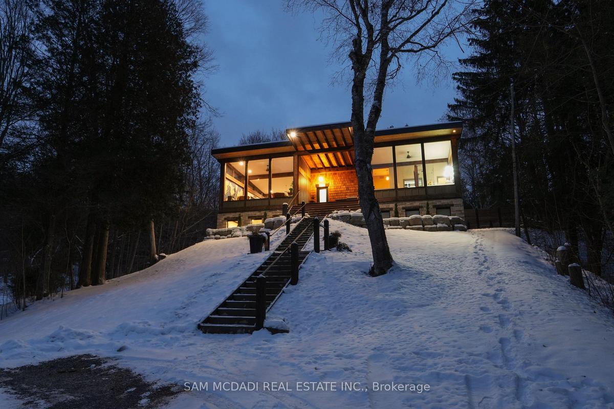 Welcome to 2084 Grand Blvd., a contemporary 3-bedroom, 4-bath summer home set within the exclusive, gated community of Cedar Springs, nestled along the Niagara Escarpment in the sought-after village of Kilbride, just 15 minutes from downtown Burlington. This private enclave of only 83 homes spans over 600 acres of protected nature and trails and offers a challenging golf course, pickleball and clay tennis courts, a sandy beach, and a vibrant community with year-round events, including a summer camp for children and grandchildren. Designed for recreation and entertaining, the home offers over 3,600 sq ft of living space across two levels with ceilings up to 12 ft, highlighted by post-and-beam Douglas fir timbers and sweeping views of the golf course and escarpment, with the first tee just steps from the front door. The main level features open-concept kitchen, dining, and living areas overlooking the first fairway, with a chef-inspired kitchen offering built-in appliances, walk-in pantry, and oversized centre island, while the dining area comfortably seats twelve. The serene primary suite enjoys golf course views, a dressing room, and spa-inspired ensuite, while two additional bedrooms share a Jack-and-Jill ensuite and walk-in closets. The walk-out lower level is an entertainer's retreat with theatre, golf simulator, games area, wet bar, gym, office or optional fourth bedroom, fourth bathroom, and an approx. 500 sq ft workshop/garage with glass walls. Outdoor living includes a covered front porch, rear timber/composite deck with glass railings, fire pit area, raised garden beds, and parking for up to 12 vehicles. Built with an ICF foundation, Shou Sugi Ban, protected Douglas fir framing, spray foam insulation, in-floor radiant heating, unlimited hot water, UV-treated spring water, and Ecoflo septic system, this is a rare offering delivering comfort, privacy, and resort-style living within the GTA.