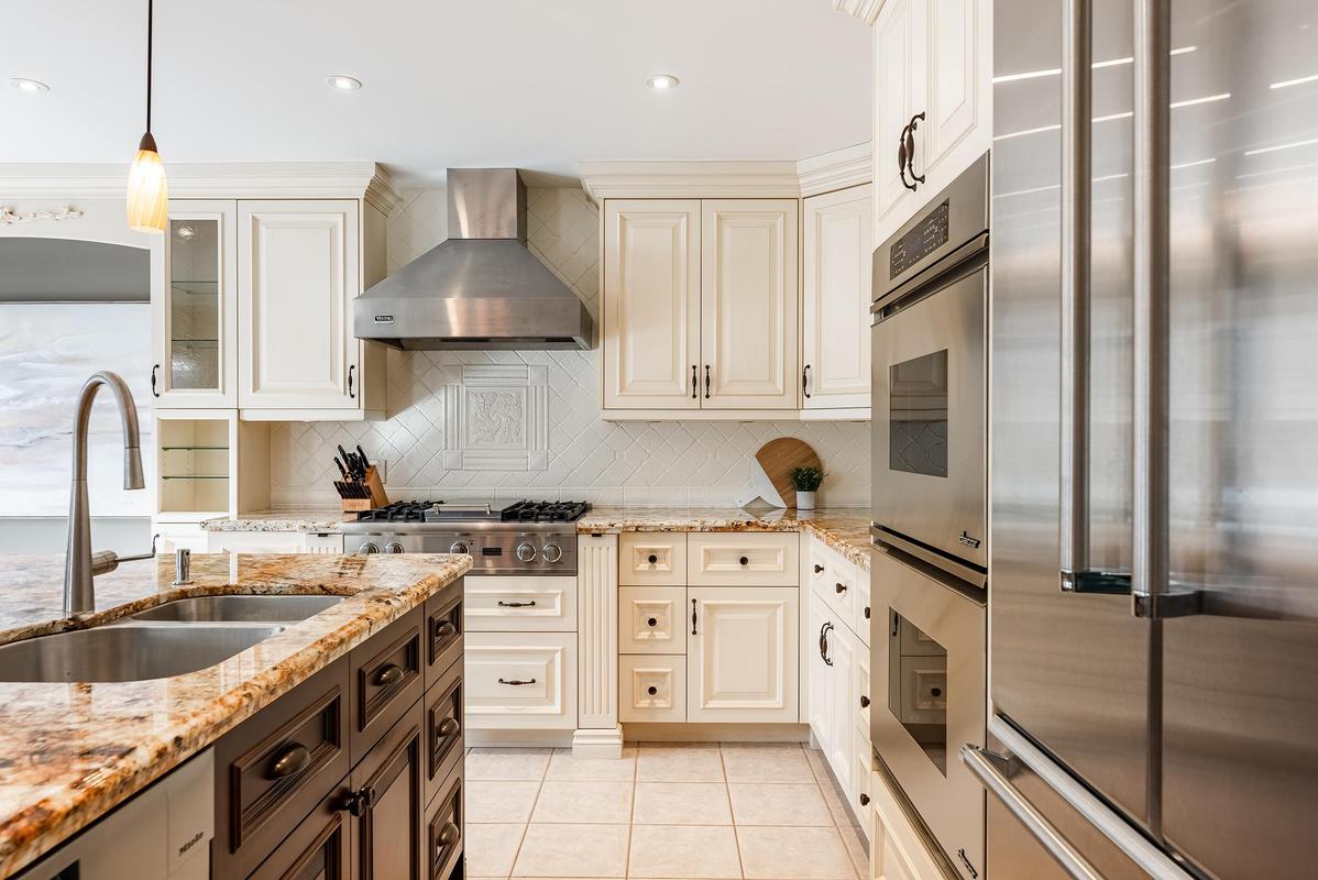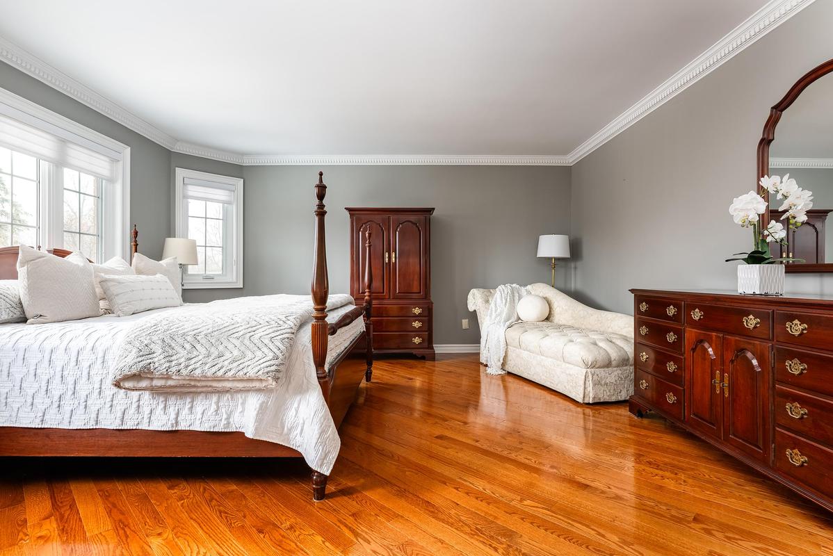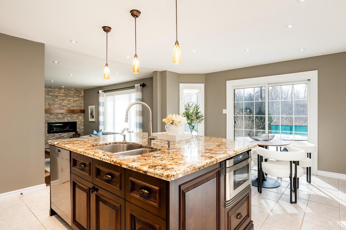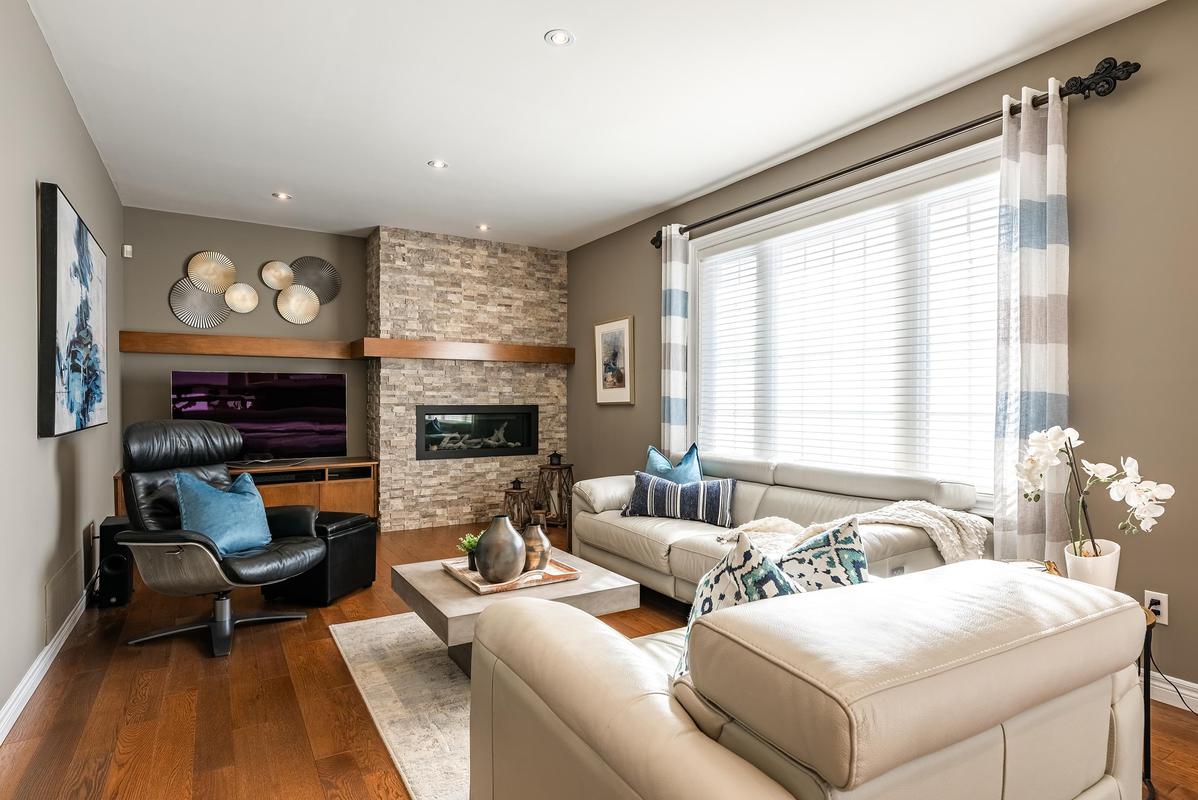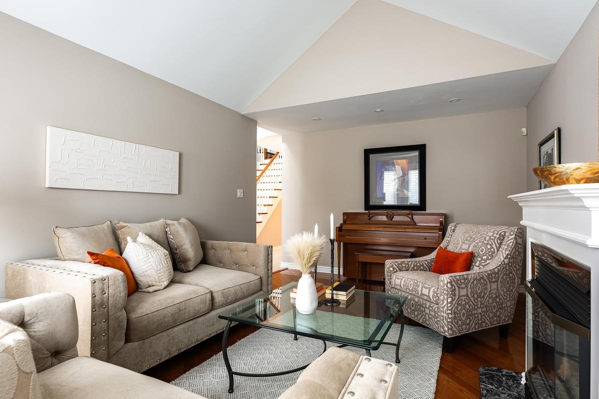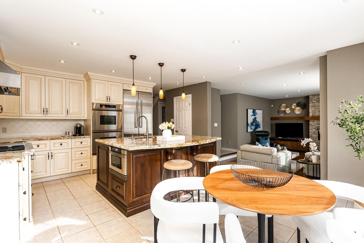 The main level is designed to bring people together. At its centre, the chef's kitchen combines beauty and function with a generous island, premium appliances, walk-in pantry, and a breakfast area overlooking the backyard. Flowing seamlessly into the family room, a striking architectural stone feature wall and linear gas fireplace create a space that feels both comfortable and elevated. Formal living and dining rooms add flexibility for entertaining, while vaulted ceilings, bay windows, and a second fireplace enhance the home's timeless character. A private office, powder room, and laundry room complete the level with everyday practicality.