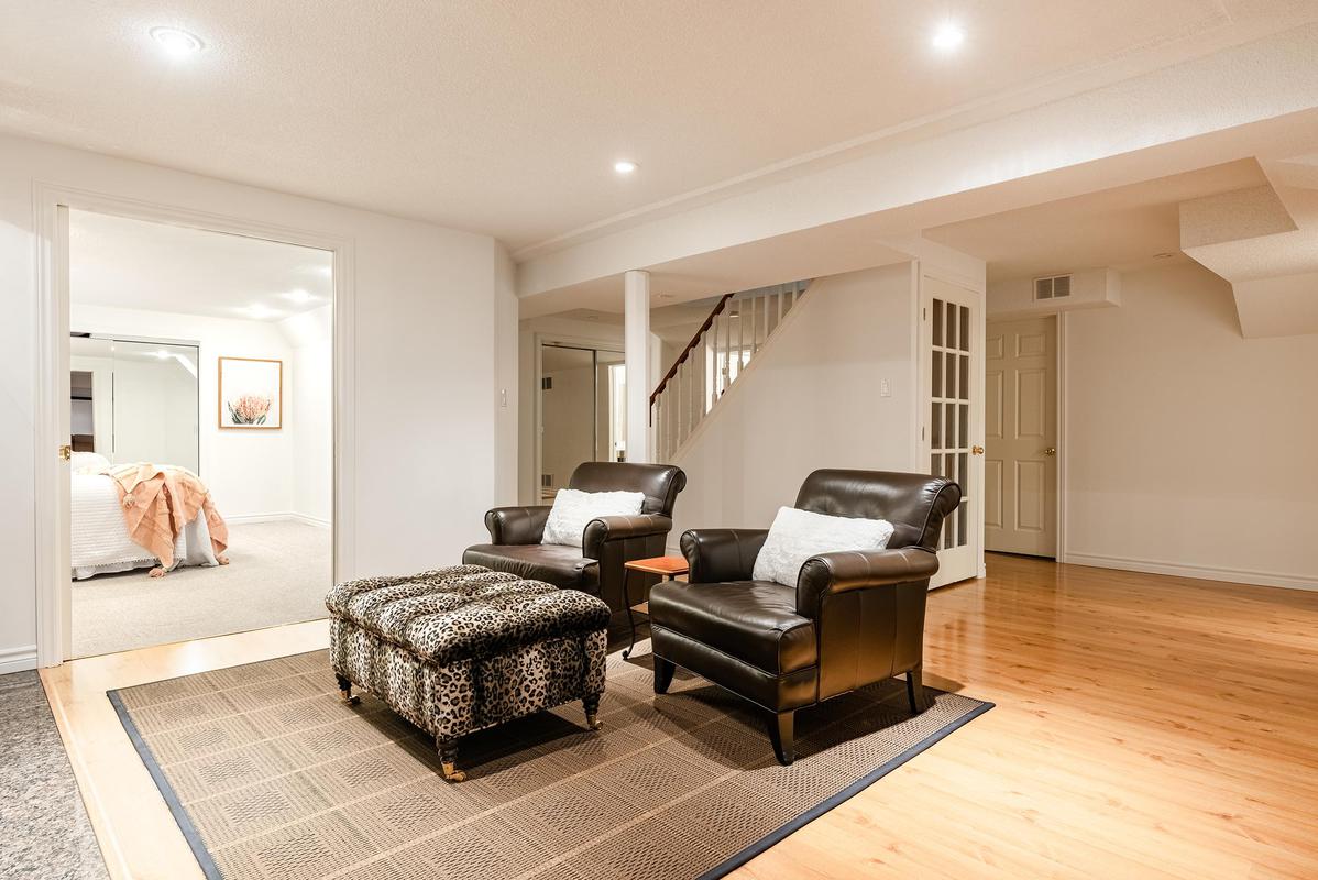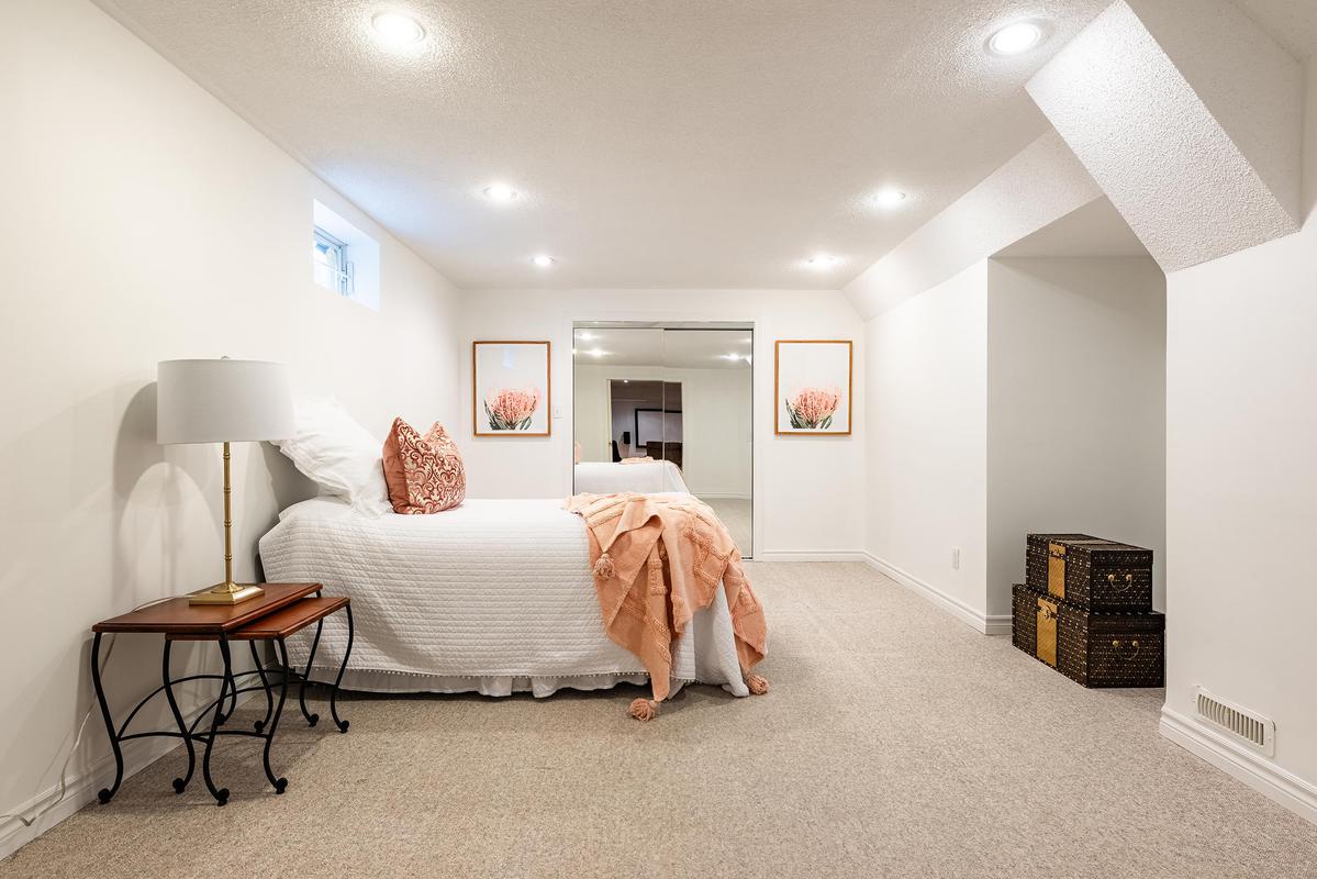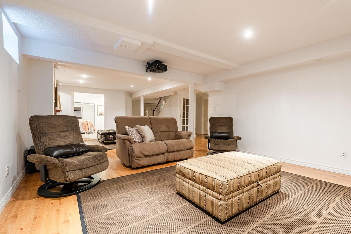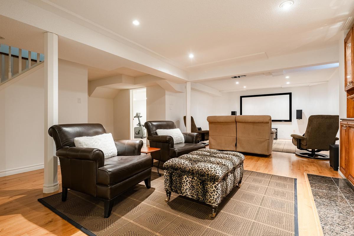 The lower level extends the living space with intention, offering a home theatre complete with overhead projector and Stewart screen, recreation room with gas fireplace, gym, fifth bedroom and a three-piece bathroom. Whether hosting friends or enjoying quiet evenings at home, this level adapts effortlessly.