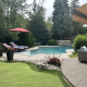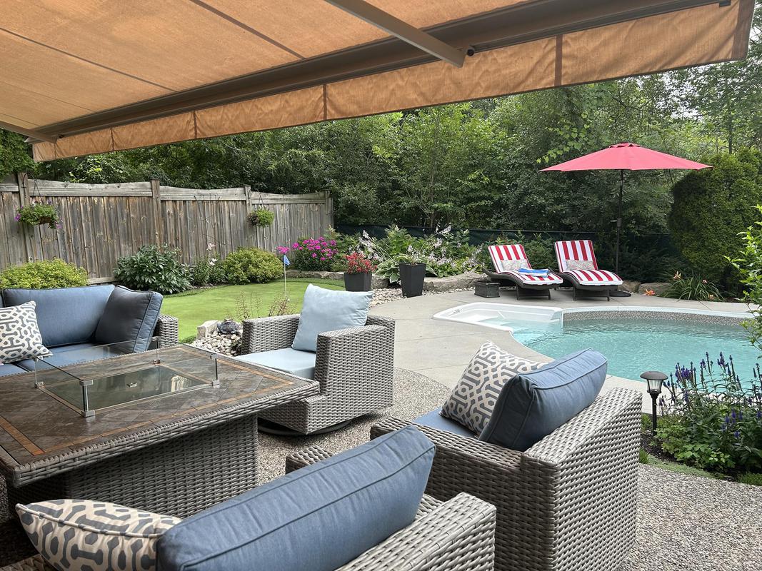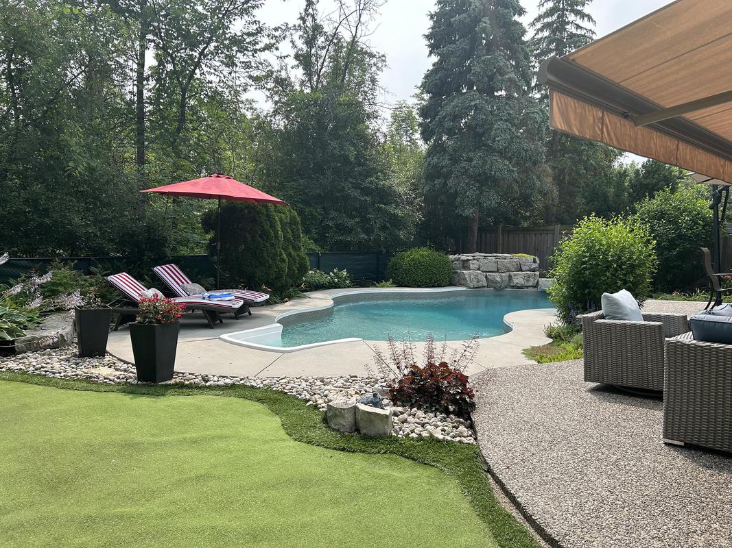 Out back, the experience becomes resort-like. West-facing and spanning approximately 67 feet across the rear property line, the ravine-backed yard features an inground saltwater pool with rock waterfall, multiple lounge areas, a putting green, and low-maintenance landscaping, all framed by mature trees that ensure privacy and calm.