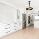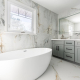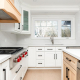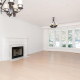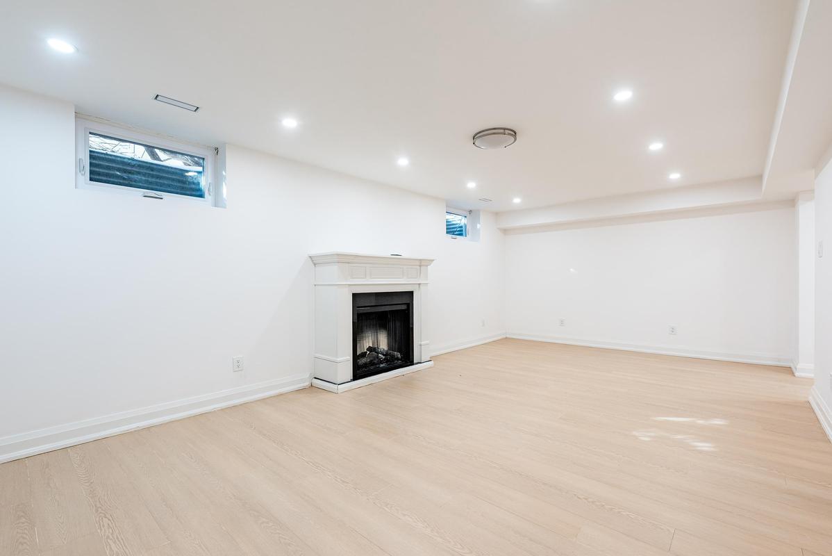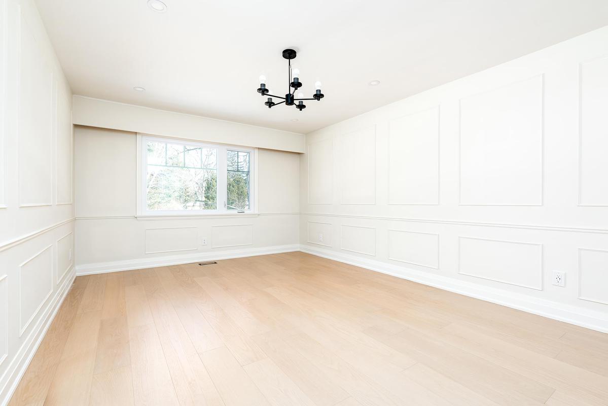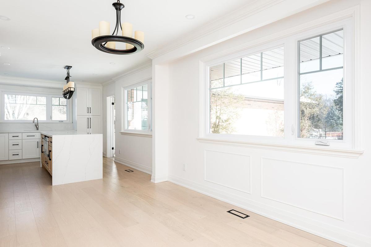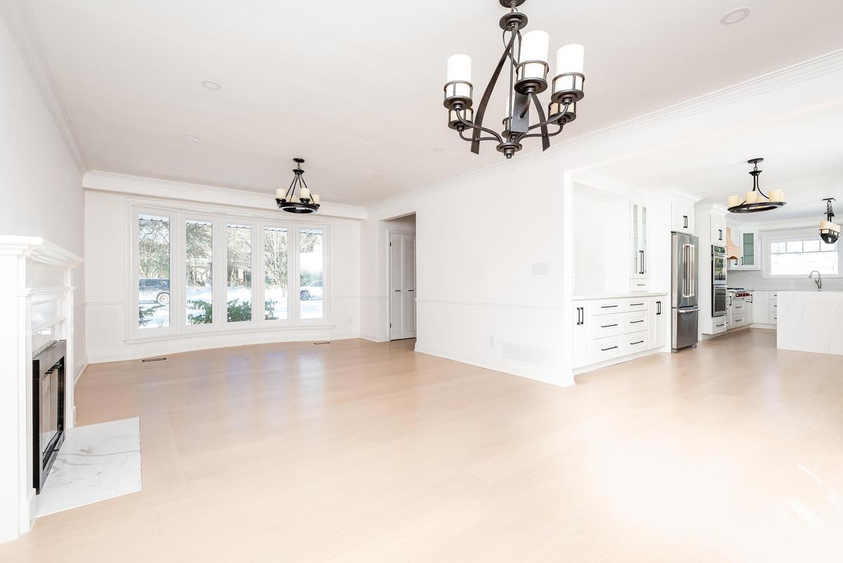 The dining room features magnificent floor-to-ceiling bay windows overlooking the front yard and French doors leading to the backyard oasis. The space is centred around a beautiful gas fireplace featuring a marble surround and hearth, finished with crisp architectural millwork.