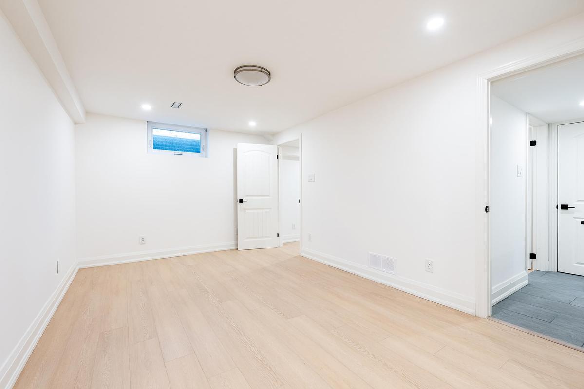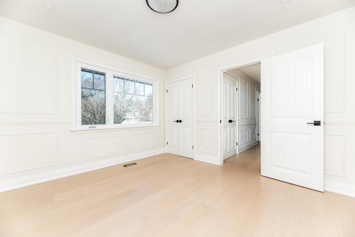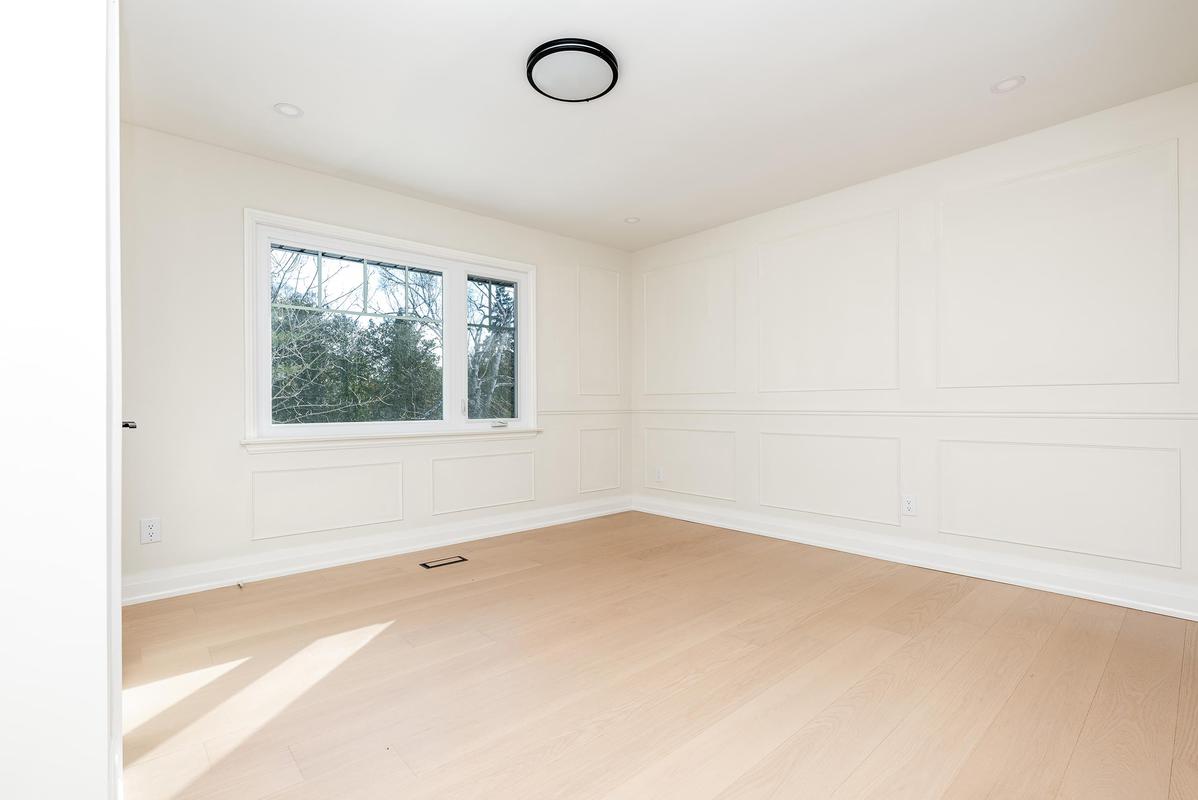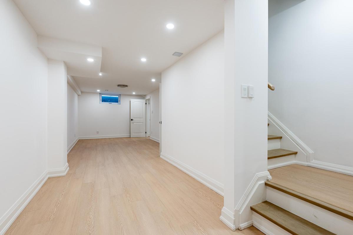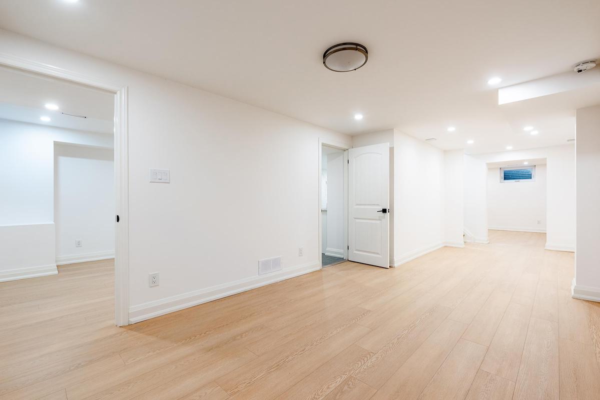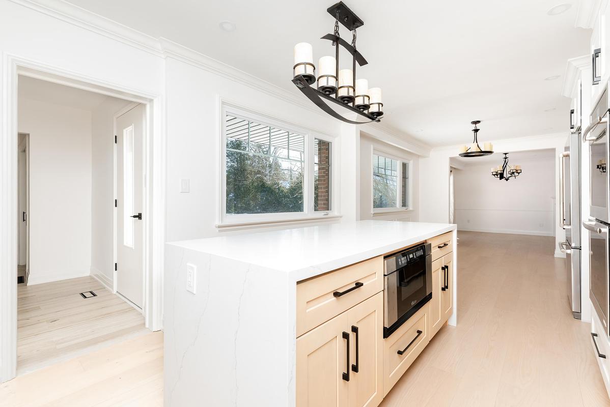 The thoughtfully redesigned main level showcases an elegant open-concept living, dining, and kitchen space, ideal for both refined entertaining and everyday family living, complemented by a private main-floor office. Throughout the home, you'll find new wide-plank hardwood flooring, custom iron-railing staircases, wainscoting wall paneling, crown moulding, designer baseboards, and pot lighting across all three levels, accented by statement chandeliers and curated lighting fixtures.