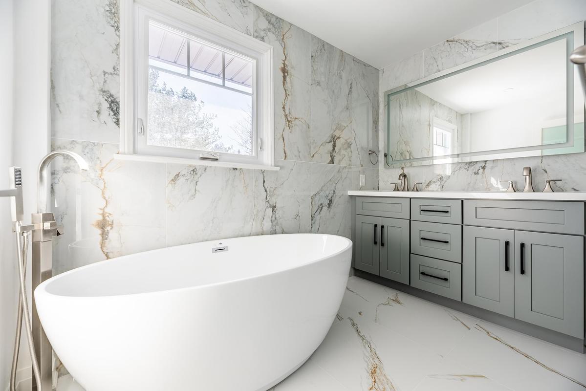 The second level offers four generously proportioned bedrooms, anchored by a luxurious primary room with a spa-inspired five-piece ensuite featuring porcelain tile finishes, glass-enclosed showers, stand-alone bathtub, and expansive LED mirrors, evoking a boutique-hotel aesthetic.