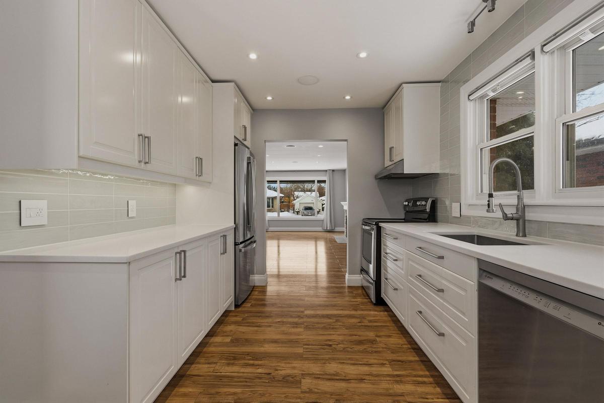 Welcome to this truly turn-key bungalow backing directly onto lush greenspace in highly sought-after University Gardens - where privacy, lifestyle, and income potential come together effortlessly. Tucked into a quiet, family-oriented neighbourhood just minutes from shopping, transit, and everyday amenities, this home offers the perfect blend of quality construction, thoughtful updates, and exceptional versatility. Lovingly maintained, it features cove mouldings and a cozy wood-burning fireplace anchoring the bright, open living and dining area. Large vinyl windows flood the space with natural light, highlighting updated flooring. The main level offers three generous bedrooms and a beautifully renovated kitchen with stone countertops, stainless steel appliances, and abundant cabinetry - stylish, modern, and functional. The professionally finished lower level adds exceptional versatility with a spacious in-law suite complete with two large bedrooms, an eat-in kitchen, bright family room, and 3-piece bath - ideal for multi-generational living or added income. Step outside to your private, fully fenced backyard oasis, featuring an expansive deck and a serene greenspace backdrop with no rear neighbours - perfect for entertaining, relaxing, or enjoying peaceful outdoor living. A rare opportunity in University Gardens that is completely move-in ready and not to be missed.