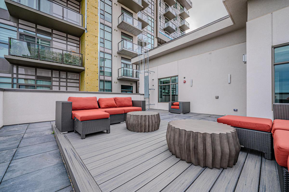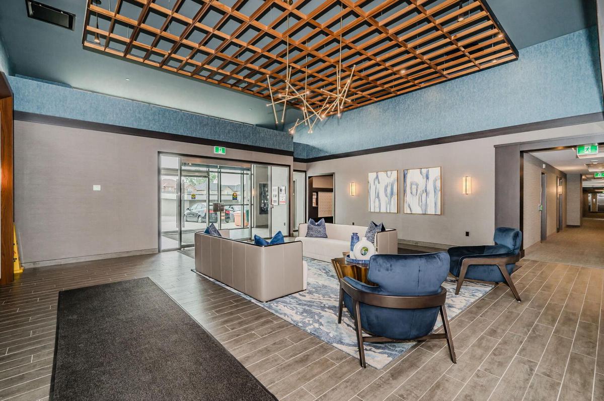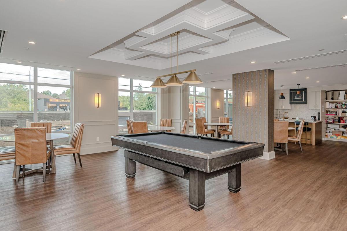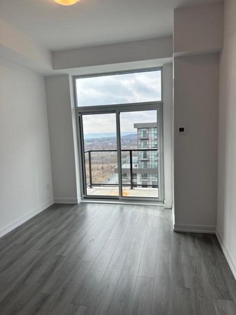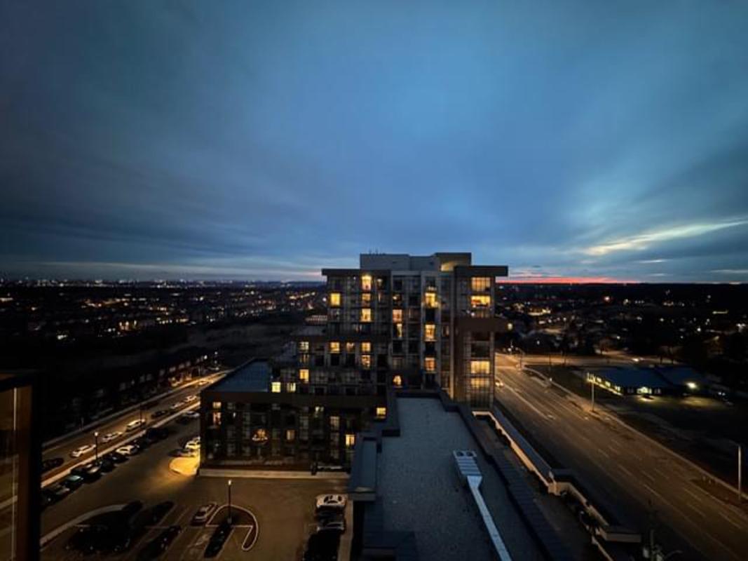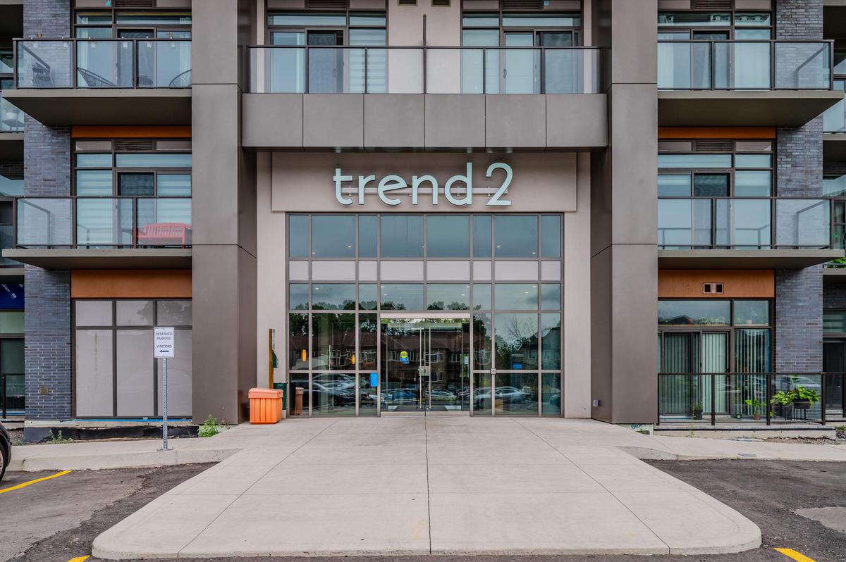 Experience elevated living in this stunning penthouse retreat perched on the 12th floor, offering 638 square feet of thoughtfully designed space. This 1 bedroom plus den residence impresses with soaring 10-ft ceilings and an abundance of natural light streaming through floor-to-ceiling windows. Step out to your private balcony and take in sweeping southwest panoramic views over the east end of Waterdown-the perfect backdrop for morning coffee or evening sunsets. The suite is loaded with quality upgrades, including custom navy cabinetry, gleaming white quartz countertops with an extended breakfast bar, upscale stainless steel appliances, a timeless subway tile backsplash, and top-of-the-line vinyl flooring that blends durability with contemporary style. Residents enjoy exceptional building amenities, including a rooftop terrace with BBQ, stylish party room, fully equipped gym, and convenient bicycle storage locker. Geothermal heating/cooling ensures energy efficiency and low utility costs year-round. Complete with 1 underground parking space and 1 storage locker, this residence offers comfort, convenience, and sophistication. This is more than a home-it's a lifestyle at the top, where modern design, smart efficiency, and breathtaking views come together seamlessly.