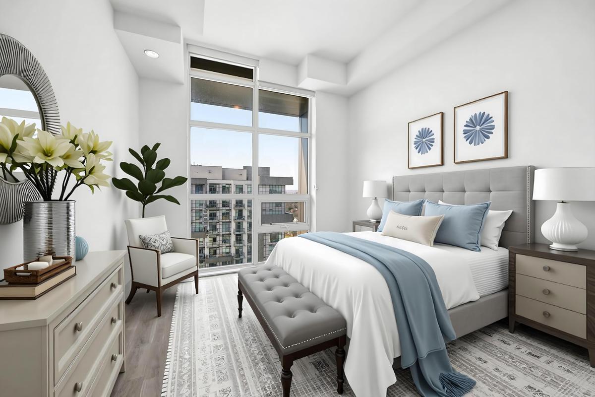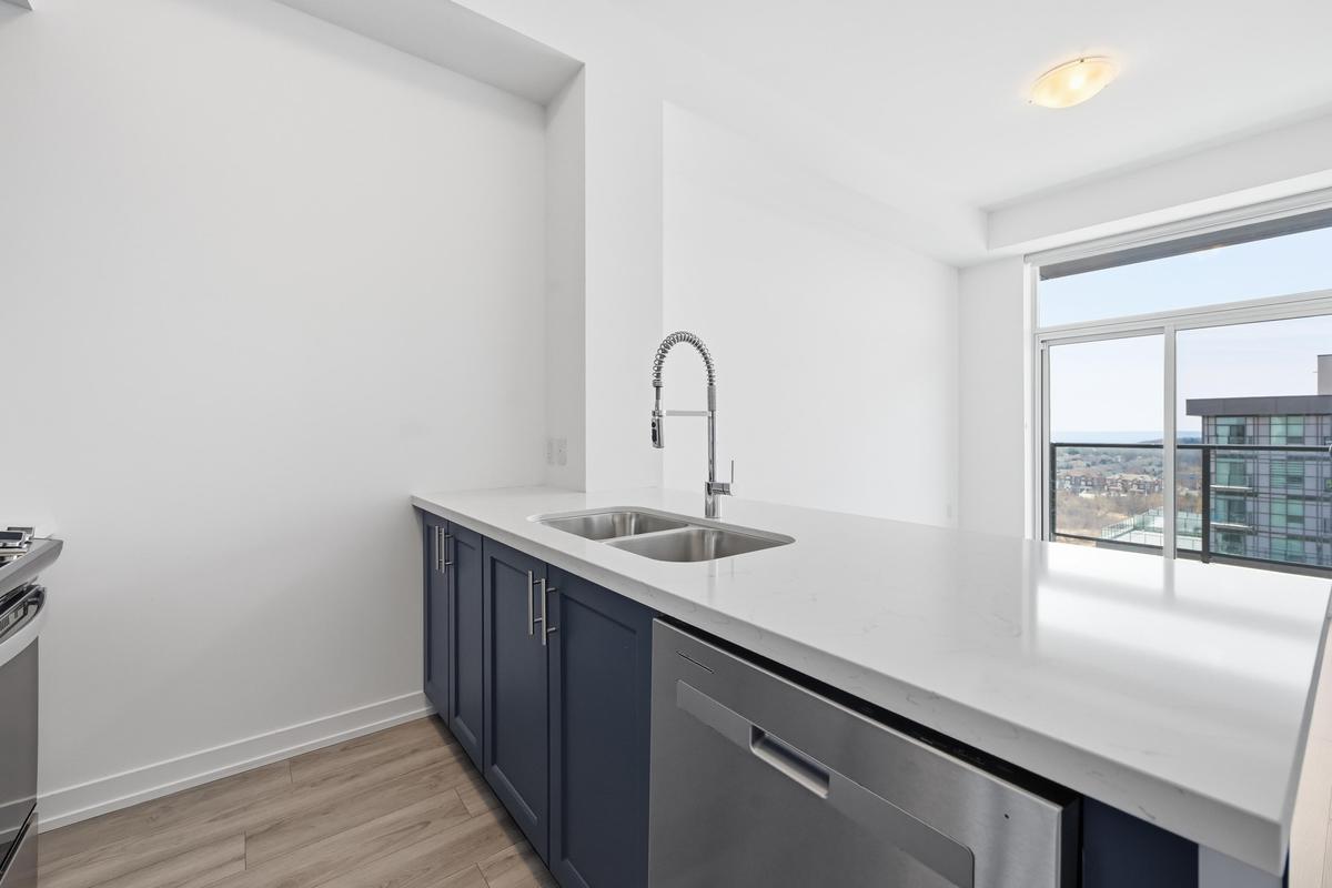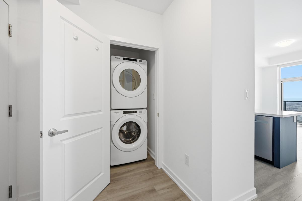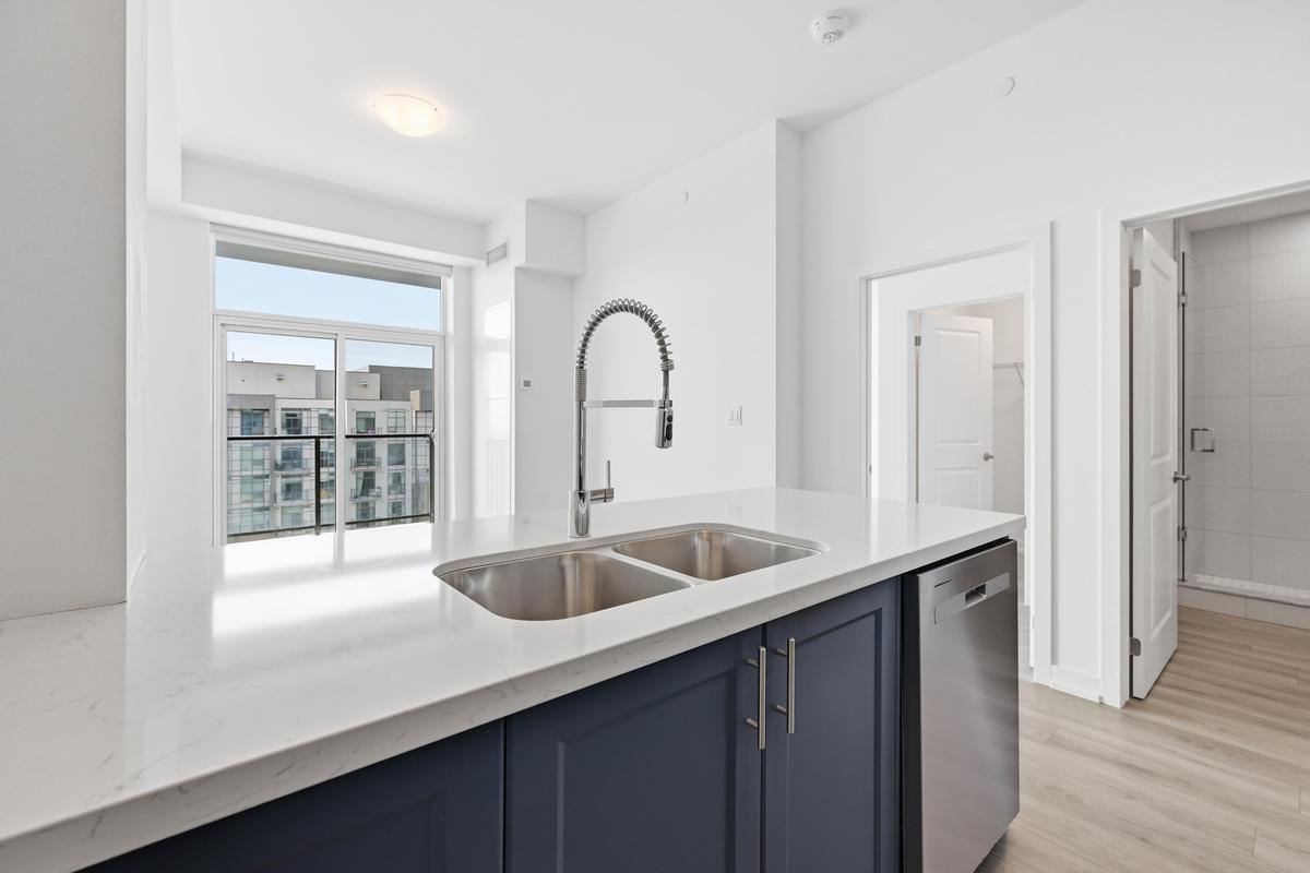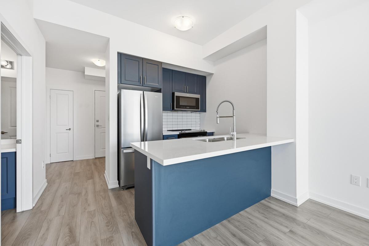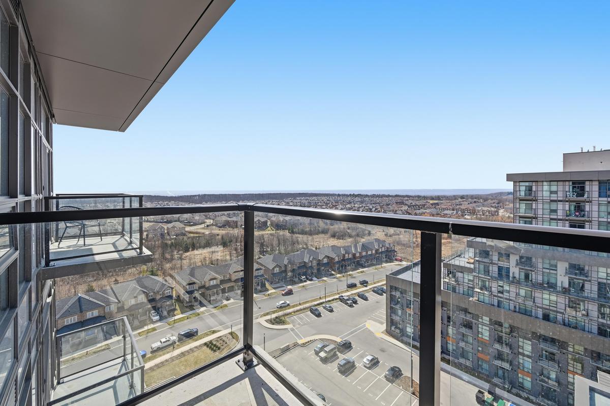 Experience elevated living in this stunning penthouse retreat perched on the 12th floor, offering 638 square feet of thoughtfully designed space. This 1 bedroom plus den residence impresses with soaring 10-ft ceilings and an abundance of natural light streaming through floor-to-ceiling windows. Step out to your private balcony and take in sweeping southwest panoramic views over the east end of Waterdown-the perfect backdrop for morning coffee or evening sunsets. The suite is loaded with quality upgrades, including custom navy cabinetry, gleaming white quartz countertops with an extended breakfast bar, upscale stainless steel appliances, a timeless subway tile backsplash, and top-of-the-line vinyl flooring that blends durability with contemporary style. Residents enjoy exceptional building amenities, including a rooftop terrace with BBQ, stylish party room, fully equipped gym, and convenient bicycle storage locker. Geothermal heating/cooling ensures energy efficiency and low utility costs year-round. Complete with 1 underground parking space and 1 storage locker, this residence offers comfort, convenience, and sophistication. This is more than a home-it's a lifestyle at the top, where modern design, smart efficiency, and breathtaking views come together seamlessly.