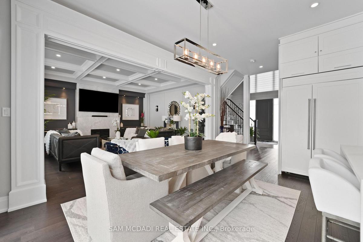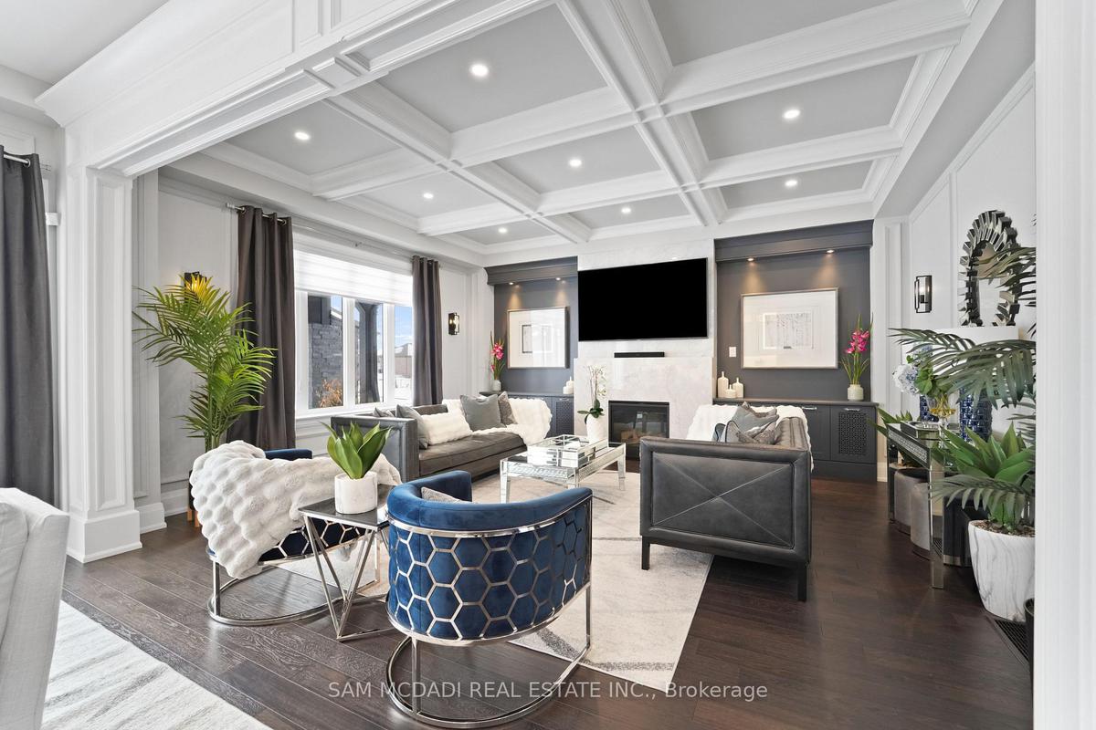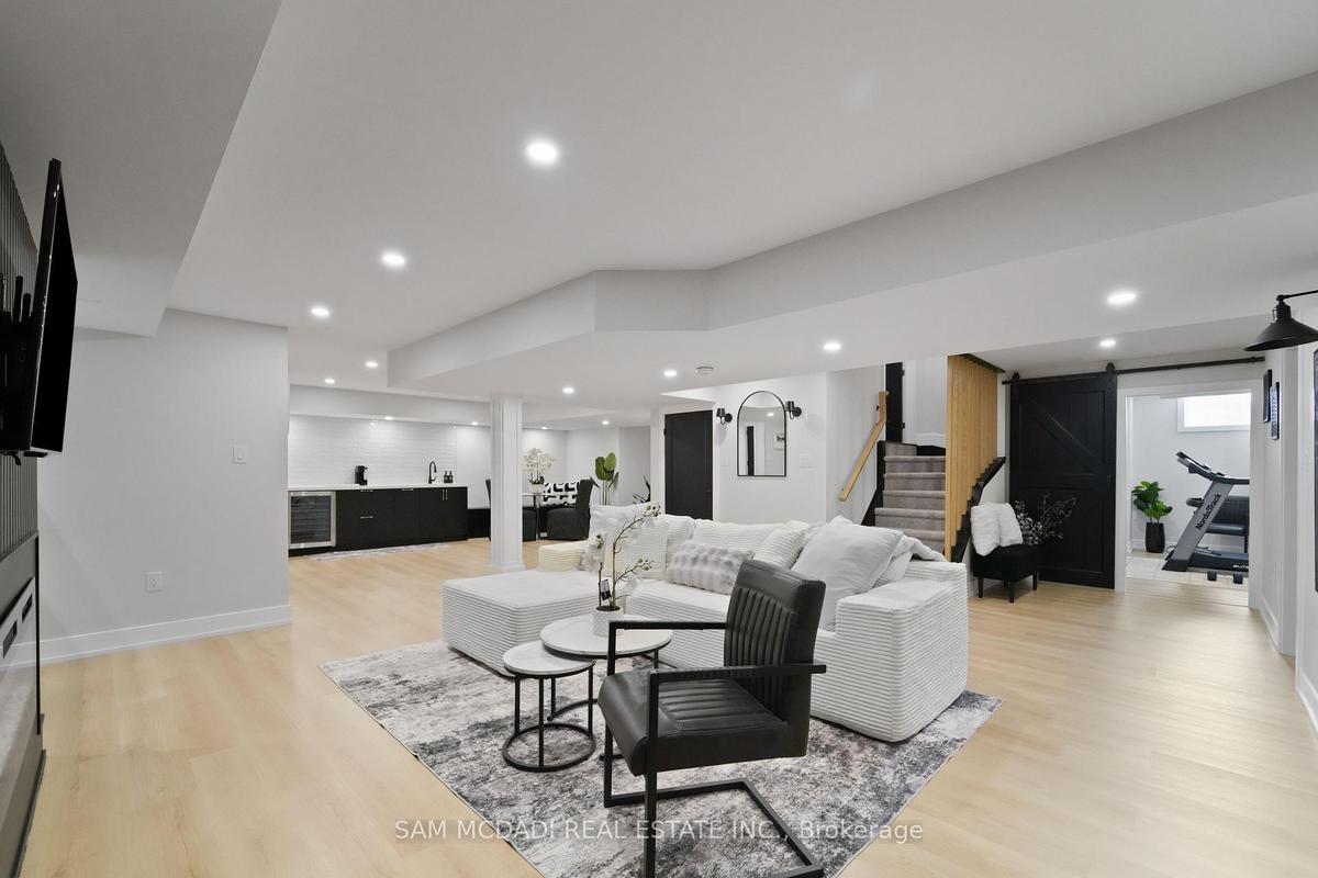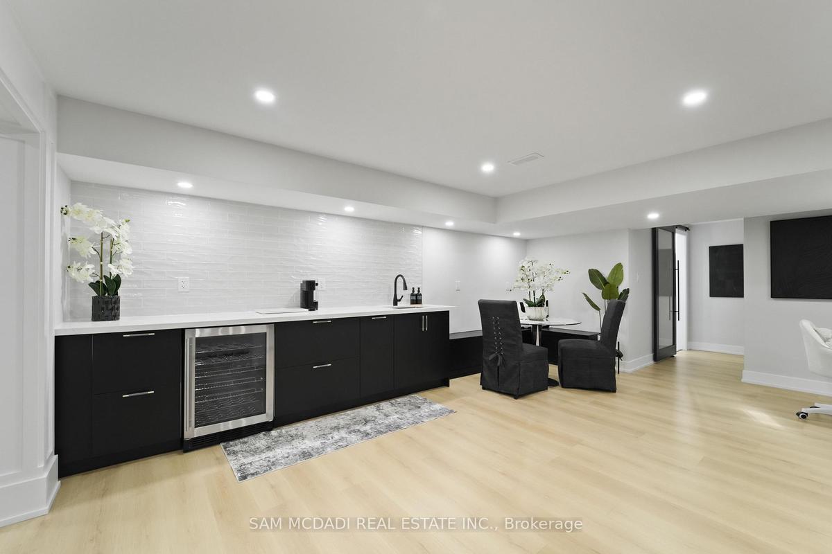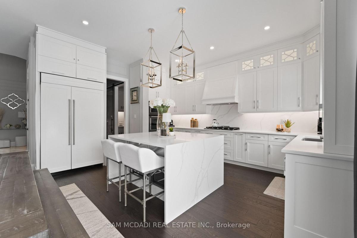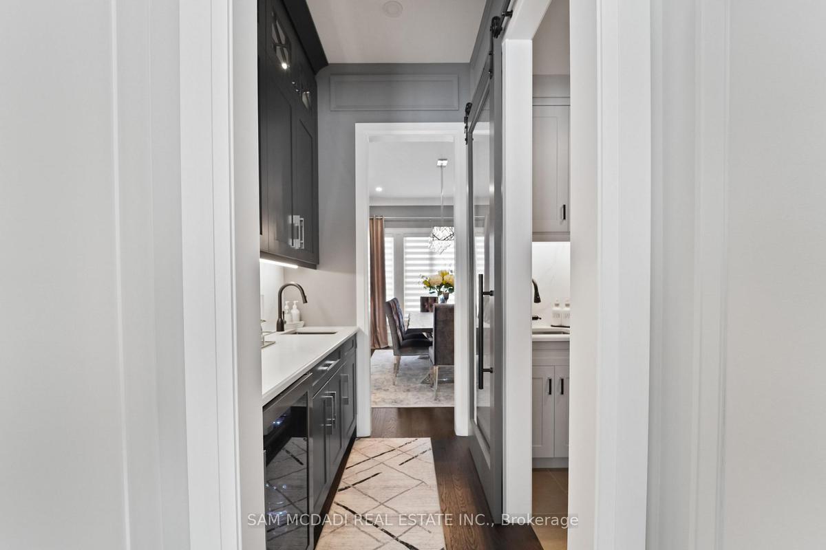 A very rare FURNISHED, truly turn key home. Step into exceptional craftsmanship and timeless design in this beautifully styled residence on nearly a half acre offered !!fully furnished!! - move-in ready with the stunning existing furniture. Approximately 4,500 sq ft of impeccably finished living space showcases 10' main-floor ceilings, 8' interior doors, and extraordinary millwork: generous trim, intricate moldings and custom woodworking throughout that reflect attention to detail unlike any home you've seen. Entertain and live luxuriously on the main level where a tucked-away office provides quiet work space and a chef's kitchen anchors the home. The kitchen features custom cabinetry with bespoke hardware, built-in appliances, an impressive waterfall quartz center island and quartz backsplash. It opens to a great room with built-in shelving, an intricate coffered ceiling and a showpiece fireplace and mantel. An accessory butler servery with wine fridge and sink makes hosting effortless. A very stylish separate dining room offers crown molding, chic wallpaper and wainscoting. Upstairs offers four bedrooms including the primary suite with a spa-like 5-piece ensuite and generous walk-in closet, two additional full bathrooms, and a striking bedroom with a 12' vaulted ceiling - bright, airy and refined living spaces designed for comfort and style. The lower level, with separate entrance, is ideal for guests or an in-law/nanny suite: kitchenette, bedroom, full bathroom and a large rec room anchored by a beautiful fireplace. Outside, the expansive nearly half-acre lot has inground sprinklers, a gorgeous covered porch with lighting, hot tub, stone facade wall with a fireplace and mount for a TV perfect for entertaining. Offered with the curated furniture and finishes that make this house a turnkey show-home.