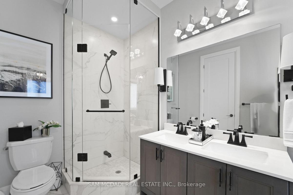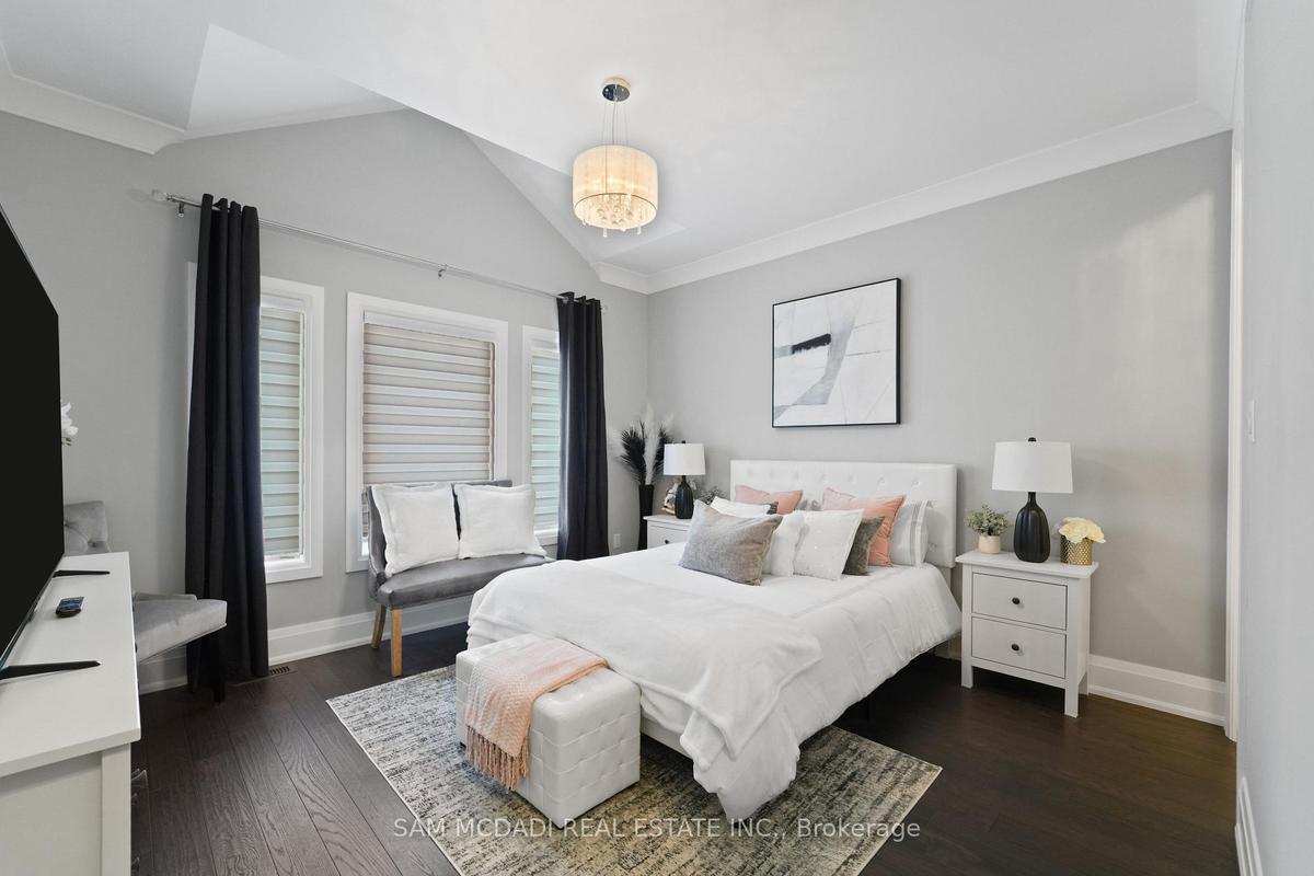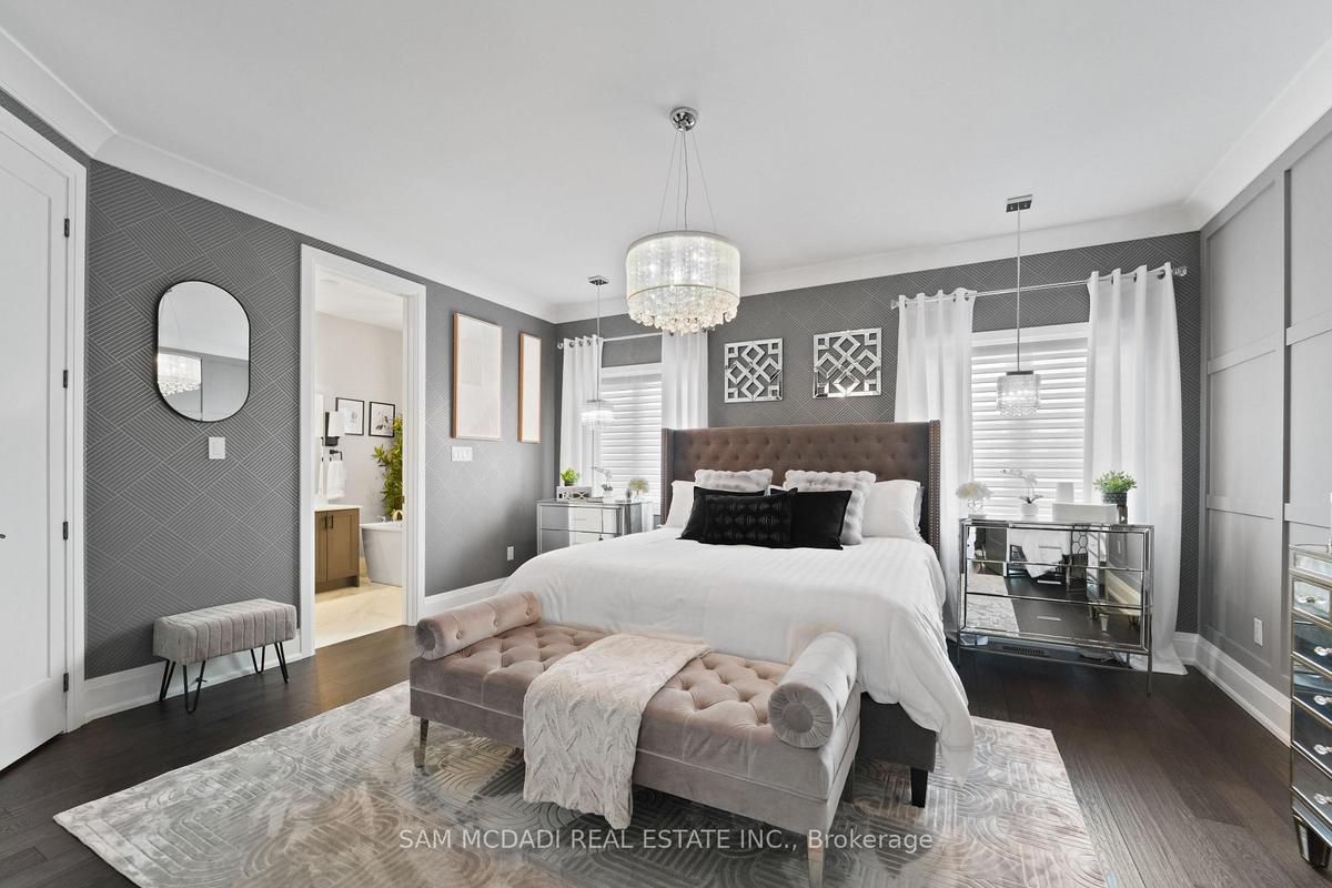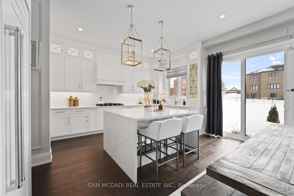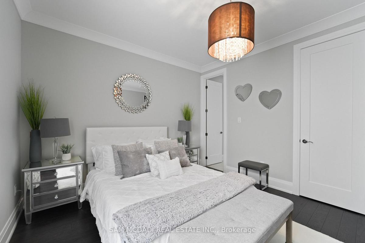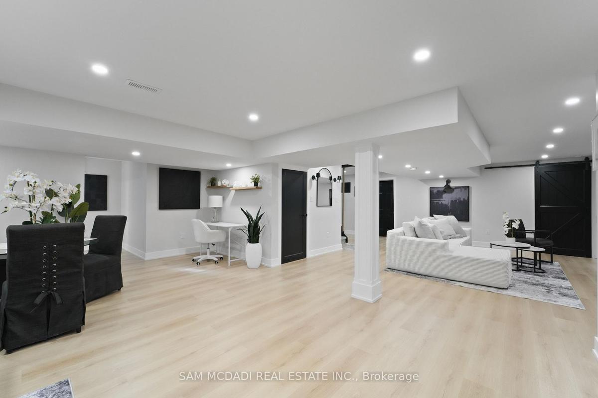A very rare FURNISHED, truly turn key home. Step into exceptional craftsmanship and timeless design in this beautifully styled residence on nearly a half acre offered !!fully furnished!! - move-in ready with the stunning existing furniture. Approximately 4,500 sq ft of impeccably finished living space showcases 10' main-floor ceilings, 8' interior doors, and extraordinary millwork: generous trim, intricate moldings and custom woodworking throughout that reflect attention to detail unlike any home you've seen. Entertain and live luxuriously on the main level where a tucked-away office provides quiet work space and a chef's kitchen anchors the home. The kitchen features custom cabinetry with bespoke hardware, built-in appliances, an impressive waterfall quartz center island and quartz backsplash. It opens to a great room with built-in shelving, an intricate coffered ceiling and a showpiece fireplace and mantel. An accessory butler servery with wine fridge and sink makes hosting effortless. A very stylish separate dining room offers crown molding, chic wallpaper and wainscoting. Upstairs offers four bedrooms including the primary suite with a spa-like 5-piece ensuite and generous walk-in closet, two additional full bathrooms, and a striking bedroom with a 12' vaulted ceiling - bright, airy and refined living spaces designed for comfort and style. The lower level, with separate entrance, is ideal for guests or an in-law/nanny suite: kitchenette, bedroom, full bathroom and a large rec room anchored by a beautiful fireplace. Outside, the expansive nearly half-acre lot has inground sprinklers, a gorgeous covered porch with lighting, hot tub, stone facade wall with a fireplace and mount for a TV perfect for entertaining. Offered with the curated furniture and finishes that make this house a turnkey show-home.