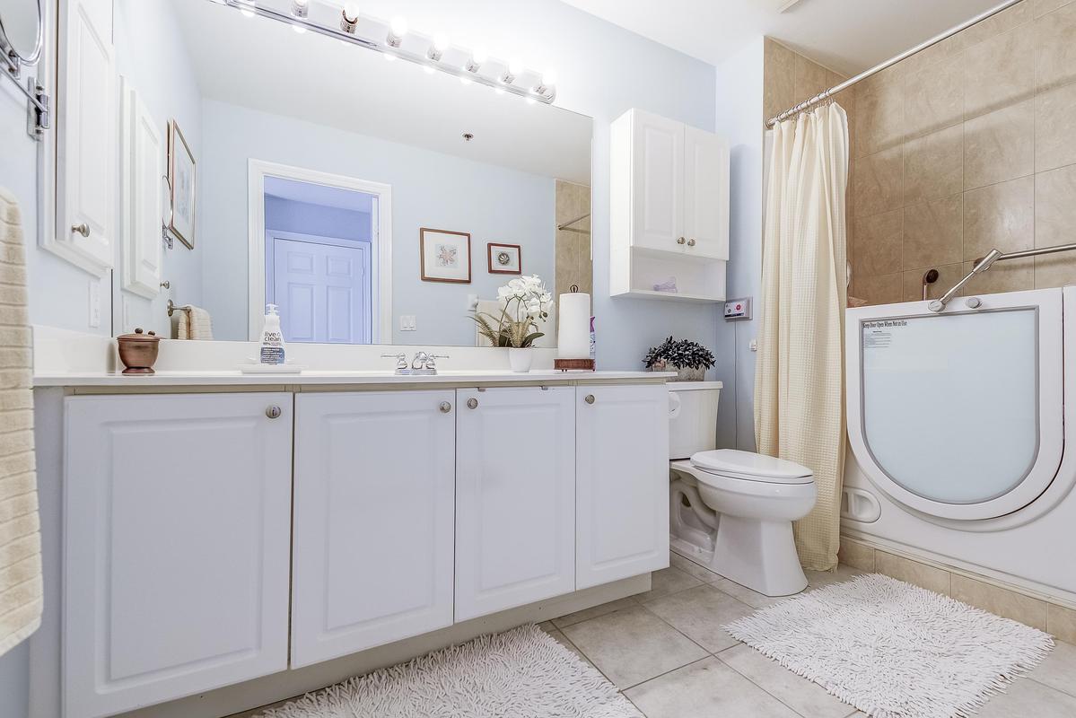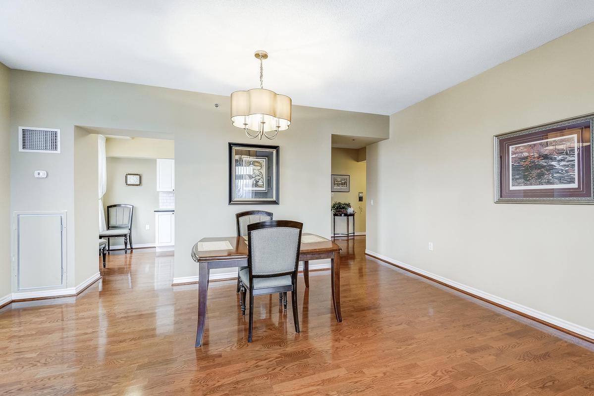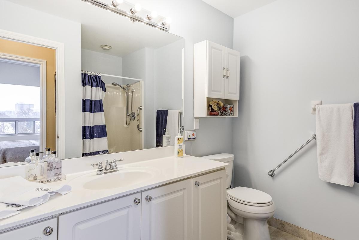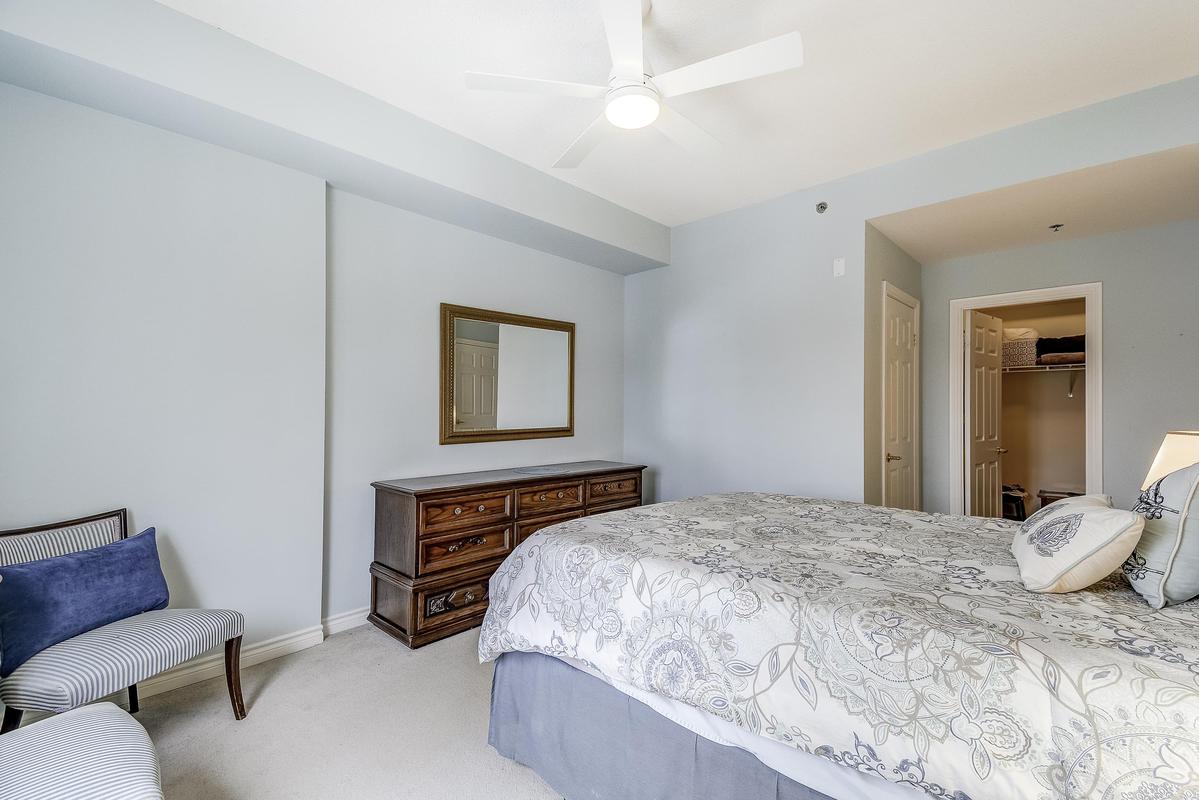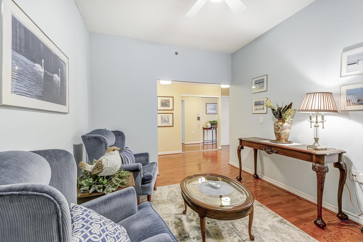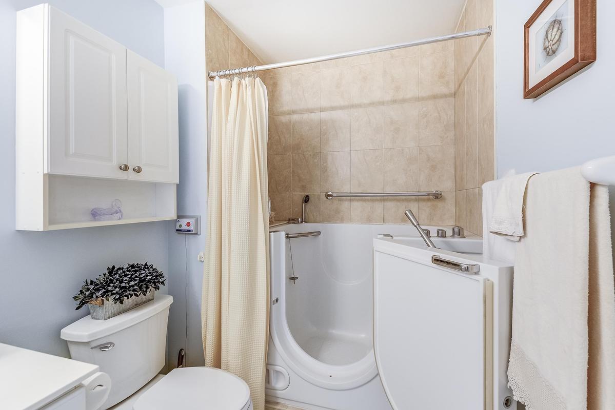 Hearthstone by the Lake where you can live independently or retire in style making use of the many available amenities. This 1485 sq. ft. Inverness Model offers 9' ceilings, 2 bedrooms PLUS a comfortable den, an eat-in kitchen, a full sized laundry room and a spacious living/dining room. It's a corner unit so you have views from two directions (north and west) and a private balcony. The primary suite has a spacious bedroom, a walk-in closet and an updated bath with a step-in tub/shower for your safety. Loads of storage in the unit PLUS a separate storage unit on the parking level and a single parking spot. Hearthstone has a full calendar of events including exercise programs, aquafit classes, and numerous other social events. The Club fee ($1739.39) provides a $260 credit to the dining room, an hour of housekeeping, access to 24/7 emergency nursing, an emergency call system wired into the building and each unit, an onsite handyman, the list goes on.