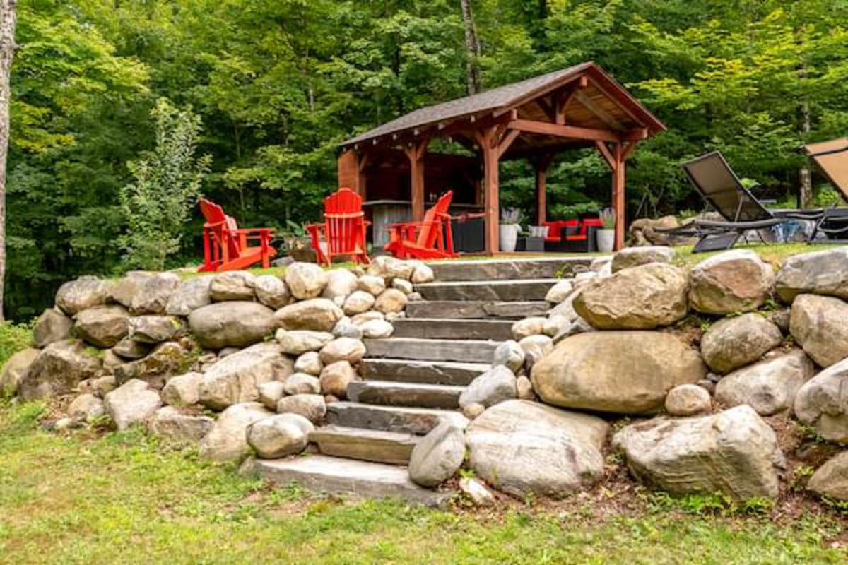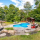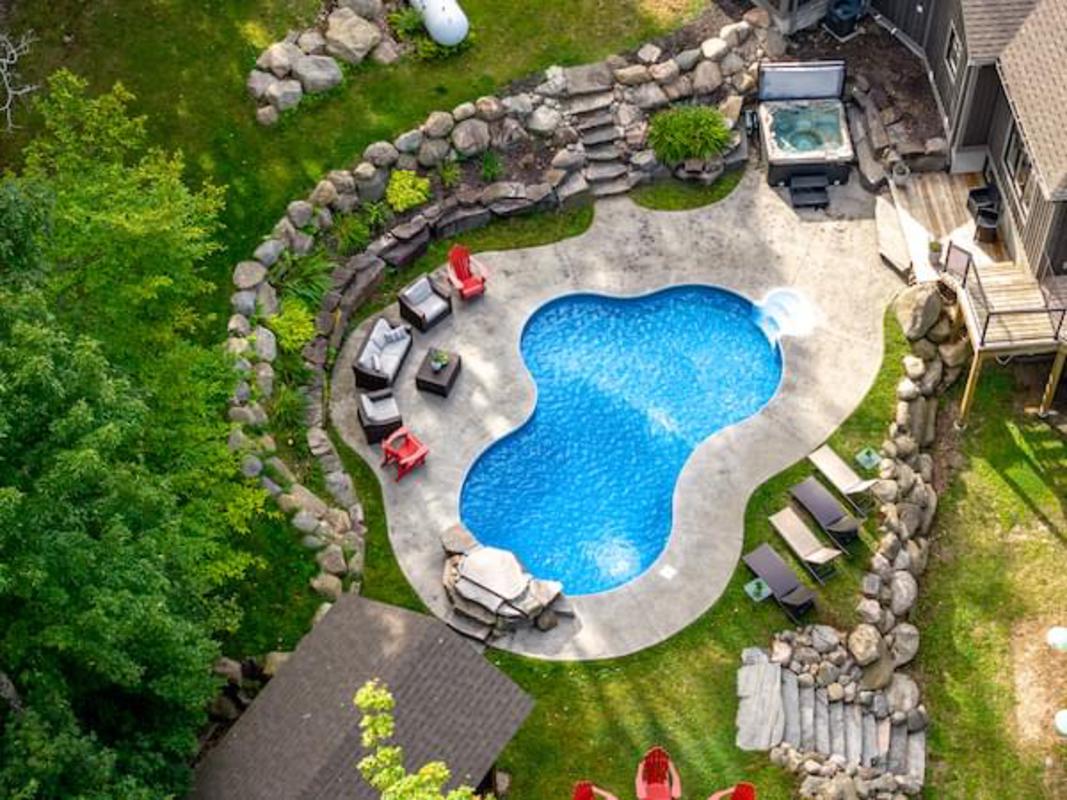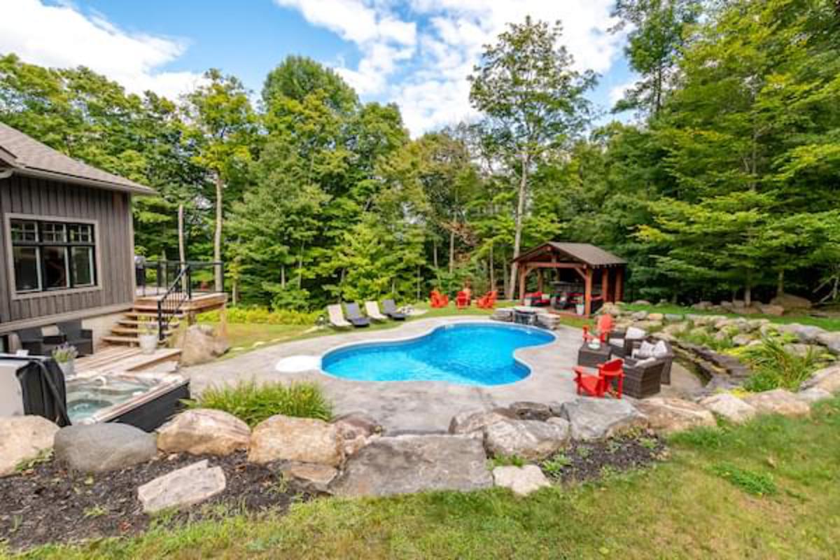 Welcome to this remarkable property, tucked away on a private, year-round road. It spans almost 4 acres across both sides of the road, offering space, privacy, & convenience just minutes from town. The outdoor setting is spectacular & designed for both relaxation & entertaining. Professional landscaping surrounds an inground pool with a cascading stone waterfall. A hot tub area & covered lounge invite endless summer enjoyment. Expansive decking overlooks, creating the perfect backdrop for lively gatherings, quiet afternoons in the sun, or evenings under the stars. Here is a property where lasting memories are made outdoors as much as in.Stepping inside, the home continues to impress with a sprawling executive bungalow layout crafted for comfort & style. A spacious foyer welcomes you to the bright living room. A wall of windows frames the outdoors, while a striking stone fireplace adds warmth & charm. The chefs kitchen is a showpiece. It offers high-end appliances, abundant storage, a large island, & beverage fridge. From the dining area, walk out to the expansive deck & extend your living space into the outdoor paradise. The main floor is anchored by a generous primary suite with direct deck access, a walk-in closet, & a luxurious 4-pc ensuite with glass shower & double sinks. A guest bedroom & 4-pc bath provide comfort for visitors. A large mudroom & laundry area, with inside entry to the oversized double garage, adds everyday convenience. Descend the curved staircase to the fully finished walkout lower level, where a massive rec room with an electric fireplace creates the ultimate gathering place. This level also offers 3 guest bedrooms, a 3-pc bath, a cozy office, & a bonus room currently used as a gym. A spacious utility/storage room completes the design, ensuring both function & flexibility.This exceptional property blends refined living with an incredible outdoor oasis, offering the perfect balance of privacy, luxury & convenience.