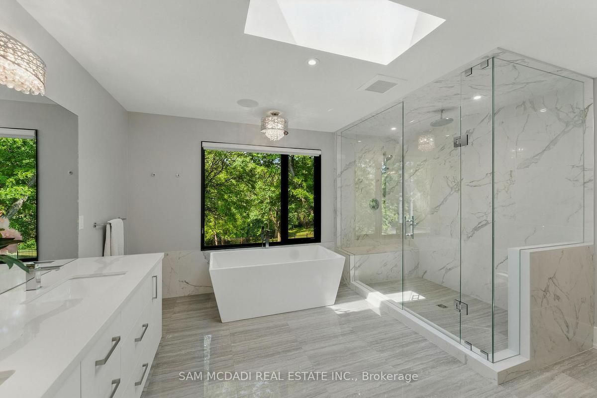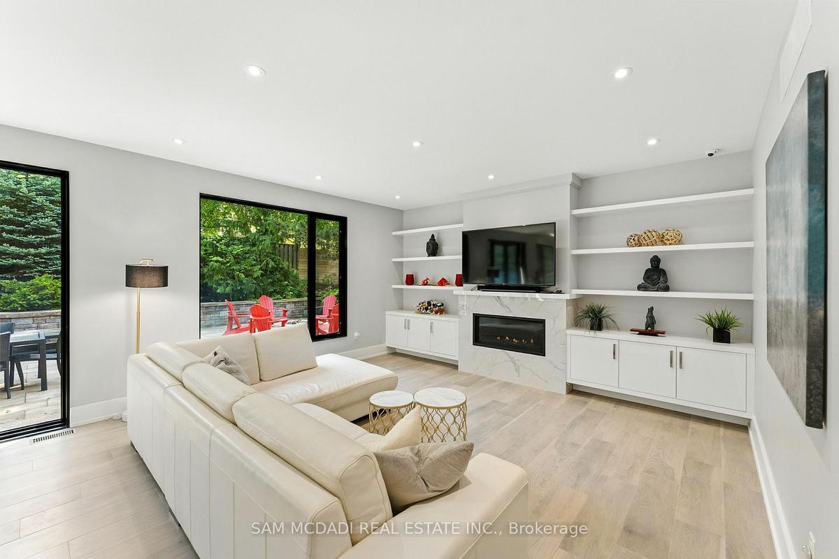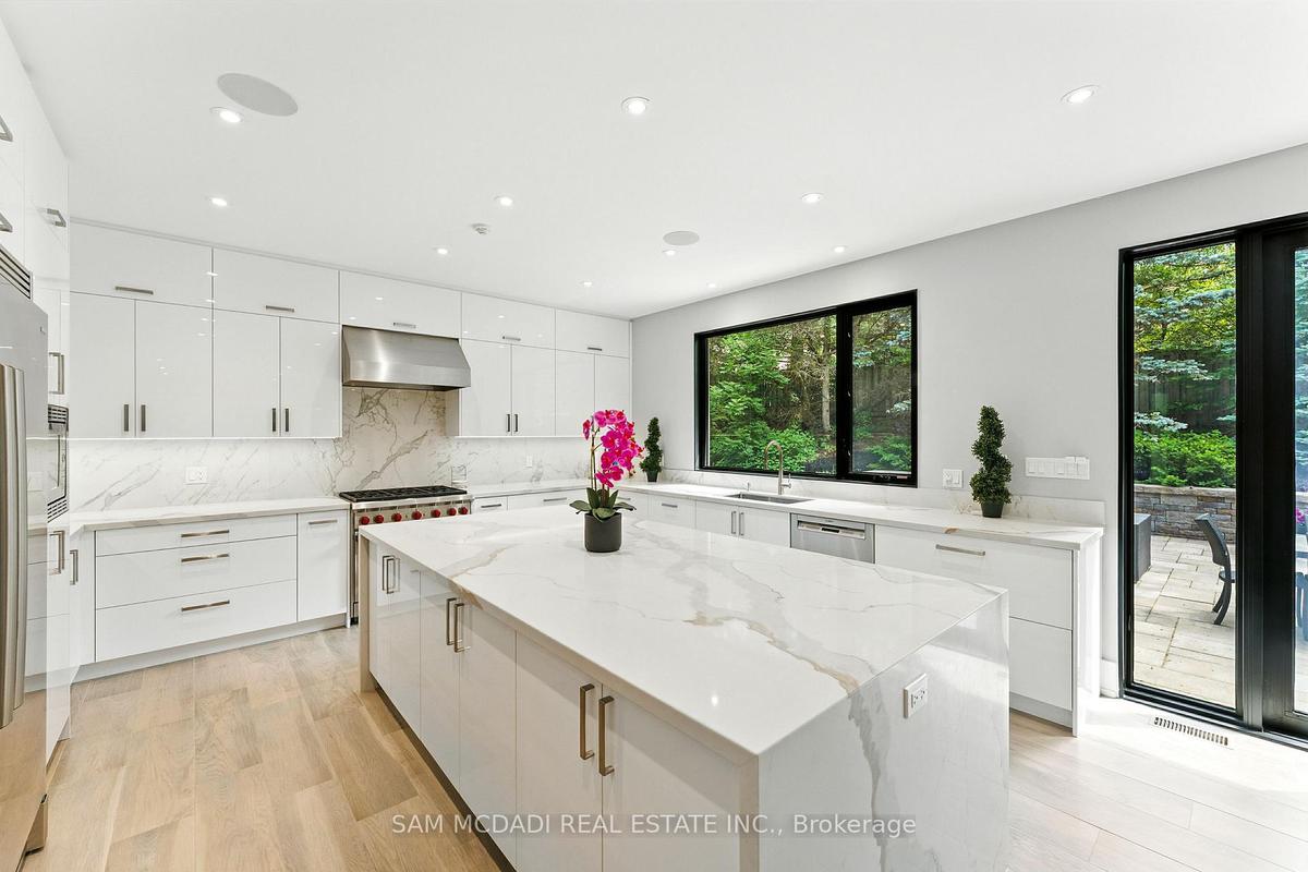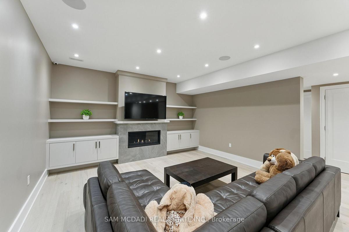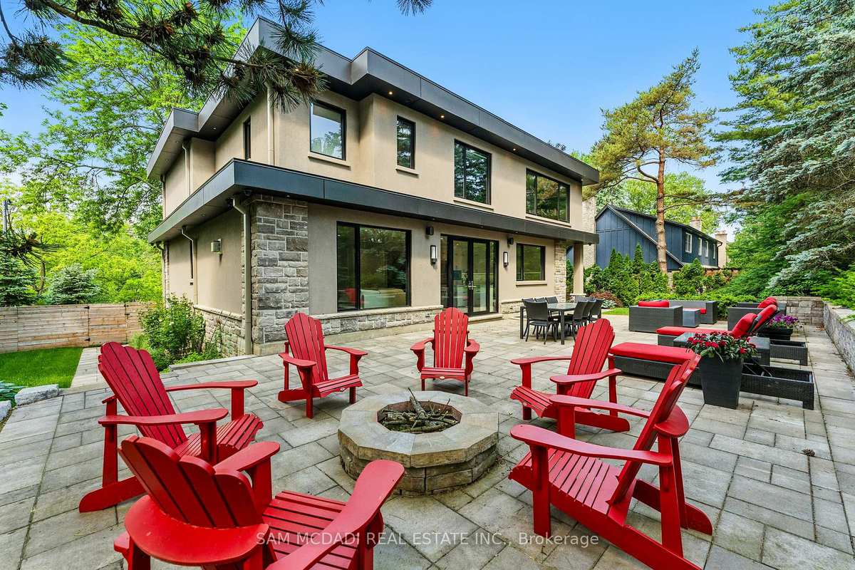Welcome to 1112 Caldwell Avenue, a stunning custom-built home completed in 2019 in prestigious Lorne Park. Offering over 5400 sqft of beautifully finished living space across three levels and set on a generous 96 x 106 ft lot, this residence showcases timeless curb appeal with its classic stone and stucco exterior. Inside, a dramatic double-height foyer welcomes you into a thoughtfully designed interior. The chef's kitchen features premium stainless steel appliances including a Wolf 6-burner gas stove, full-height custom cabinetry, and a 9 ft centre island with waterfall quartz countertop. The adjoining living room is highlighted by a gas fireplace and a custom built-in media centre. A formal dining room, beautifully designed home office with full-height custom cabinetry, and a functional mudroom complete the main level. A striking floating staircase with solid oak open risers leads to the upper level. The impressive 600+ sqft primary suite offers a walk-in closet and spa-inspired 5-pc ensuite with freestanding tub and thermostatic shower system. The upper level also features a junior suite with 3-pc ensuite, 2 additional bedrooms, and a 5-pc bathroom. The finished lower level adds exceptional versatility with a nanny's bedroom, rec room, gym, 3-pc bathroom, and ample storage. Outdoors, enjoy a private backyard surrounded by mature trees and lush foliage, featuring an expansive stone patio, gas firepit, and wood-burning fire pit. Premium finishes include engineered oak hardwood flooring, porcelain tile, oversized windows with security film, 3 skylights, motion-sensor closet lighting, and solid core doors. Additional features include Sonos sound system, alarm system, HRV, sump pump, and professional-grade security cameras. Ideally located near top-rated schools including Tecumseh PS, Lorne Park PS and Lorne Park SS, Lake Ontario, Port Credit village, and quick access to the QEW, this exceptional home offers refined living in Mississauga's most sought-after community.