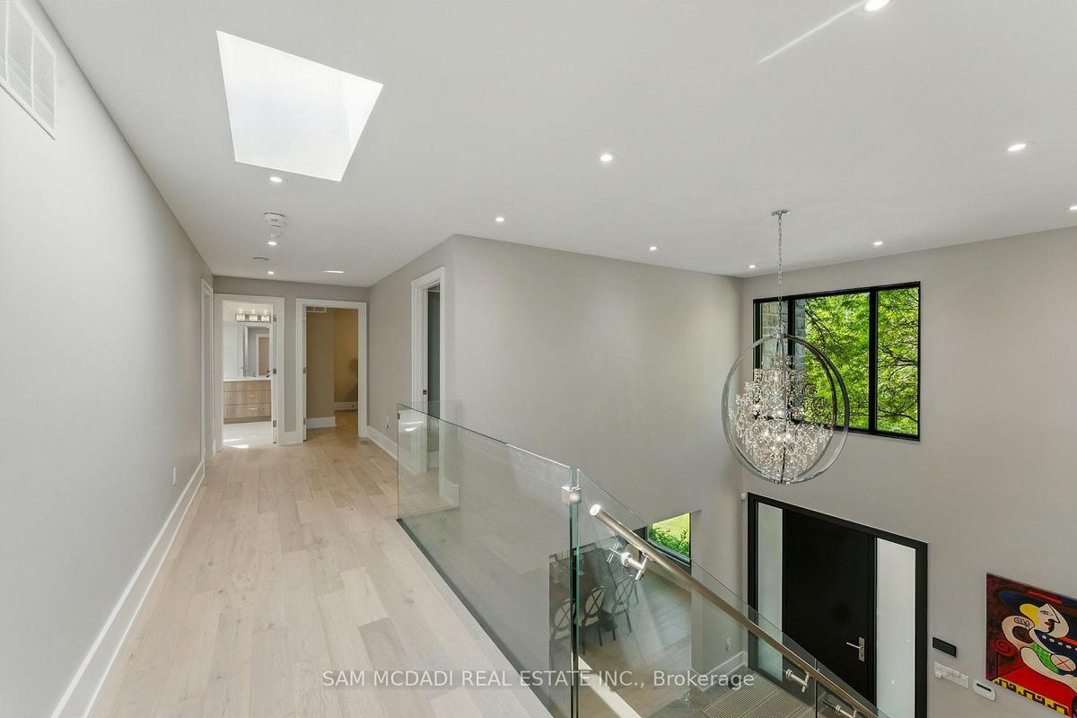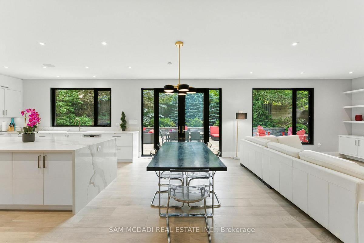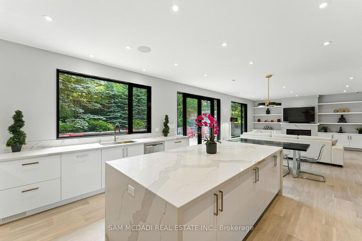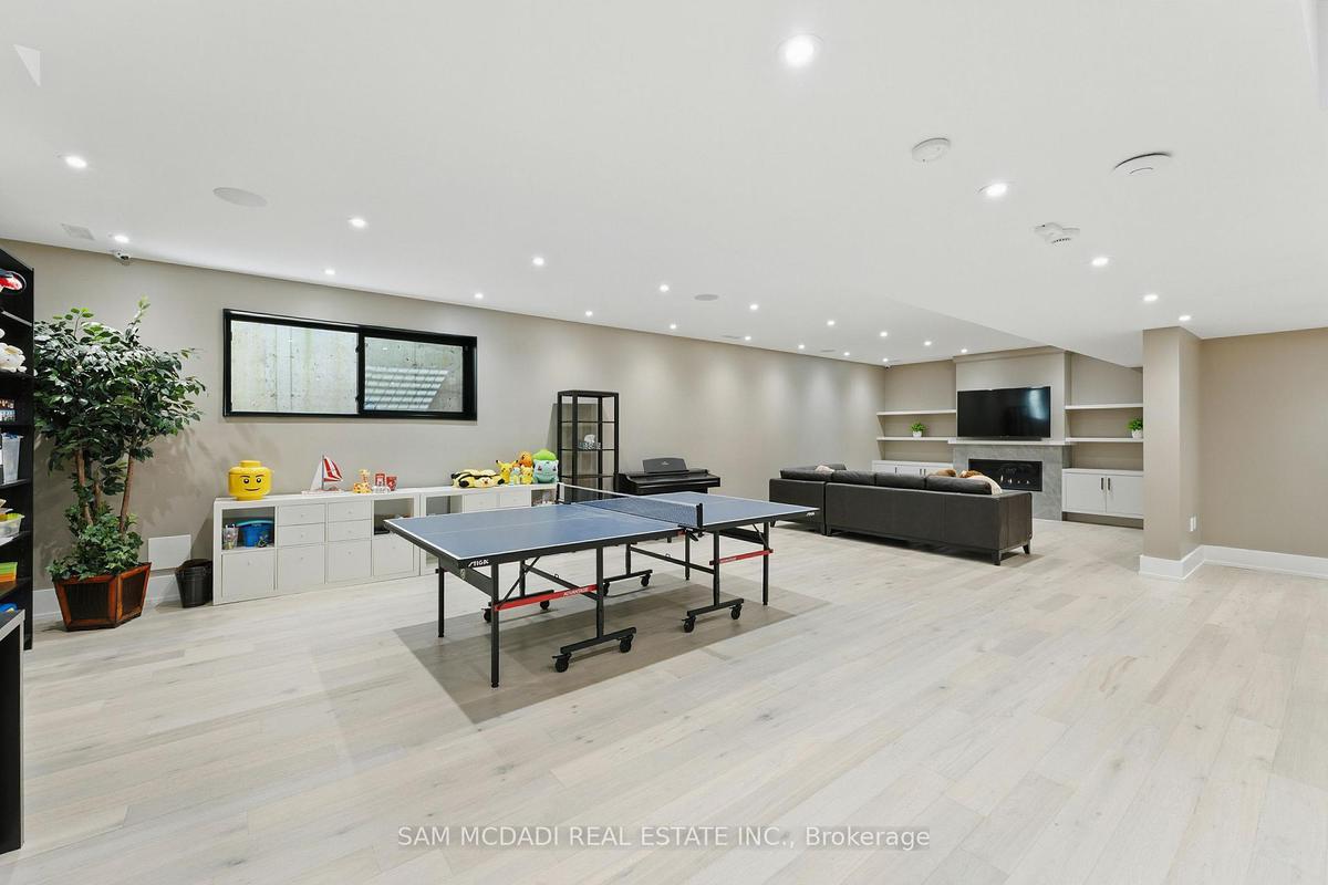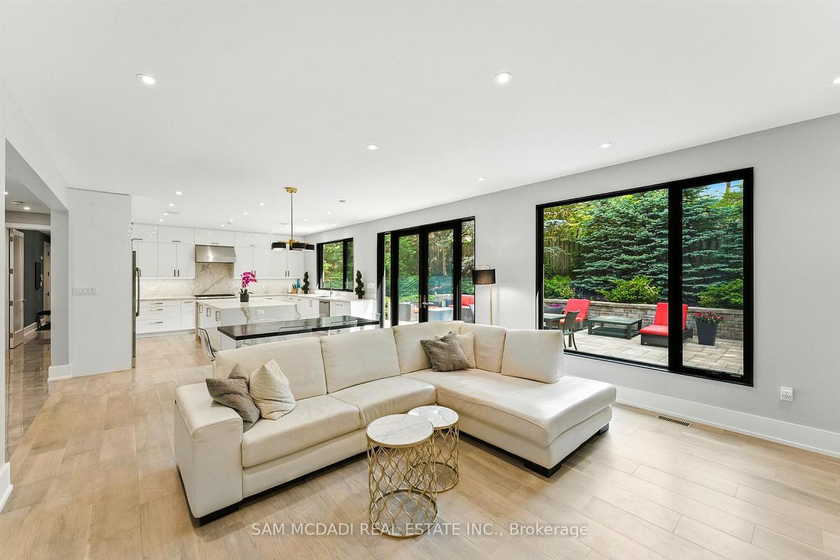 Welcome to 1112 Caldwell Avenue, a stunning custom-built home completed in 2019 in prestigious Lorne Park. Offering over 5400 sqft of beautifully finished living space across three levels and set on a generous 96 x 106 ft lot, this residence showcases timeless curb appeal with its classic stone and stucco exterior. Inside, a dramatic double-height foyer welcomes you into a thoughtfully designed interior. The chef's kitchen features premium stainless steel appliances including a Wolf 6-burner gas stove, full-height custom cabinetry, and a 9 ft centre island with waterfall quartz countertop. The adjoining living room is highlighted by a gas fireplace and a custom built-in media centre. A formal dining room, beautifully designed home office with full-height custom cabinetry, and a functional mudroom complete the main level. A striking floating staircase with solid oak open risers leads to the upper level. The impressive 600+ sqft primary suite offers a walk-in closet and spa-inspired 5-pc ensuite with freestanding tub and thermostatic shower system. The upper level also features a junior suite with 3-pc ensuite, 2 additional bedrooms, and a 5-pc bathroom. The finished lower level adds exceptional versatility with a nanny's bedroom, rec room, gym, 3-pc bathroom, and ample storage. Outdoors, enjoy a private backyard surrounded by mature trees and lush foliage, featuring an expansive stone patio, gas firepit, and wood-burning fire pit. Premium finishes include engineered oak hardwood flooring, porcelain tile, oversized windows with security film, 3 skylights, motion-sensor closet lighting, and solid core doors. Additional features include Sonos sound system, alarm system, HRV, sump pump, and professional-grade security cameras. Ideally located near top-rated schools including Tecumseh PS, Lorne Park PS and Lorne Park SS, Lake Ontario, Port Credit village, and quick access to the QEW, this exceptional home offers refined living in Mississauga's most sought-after community.