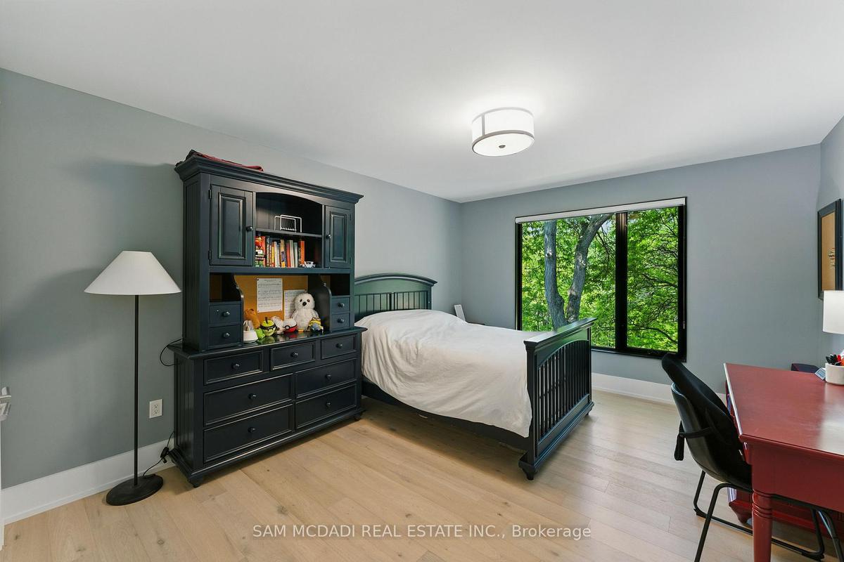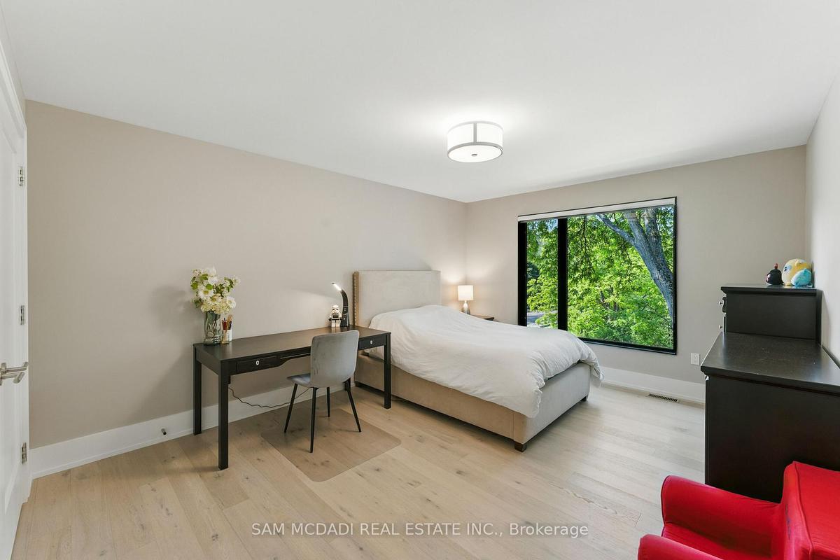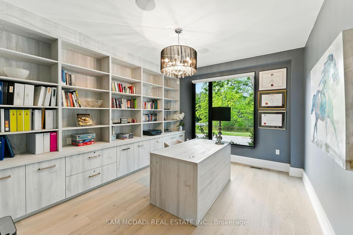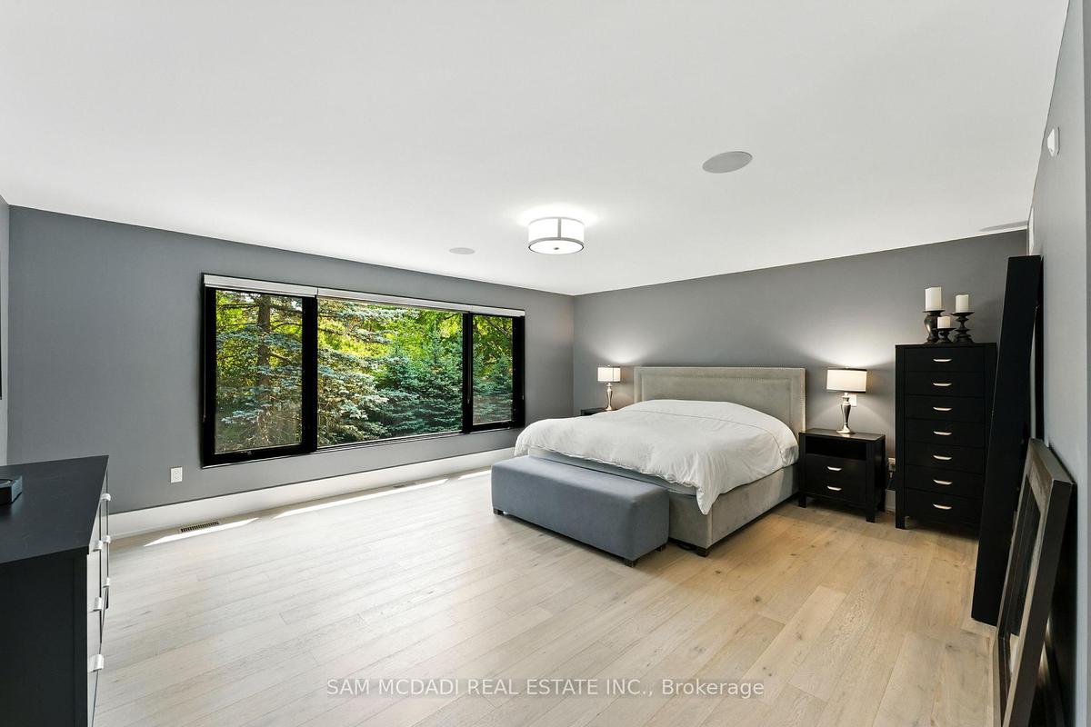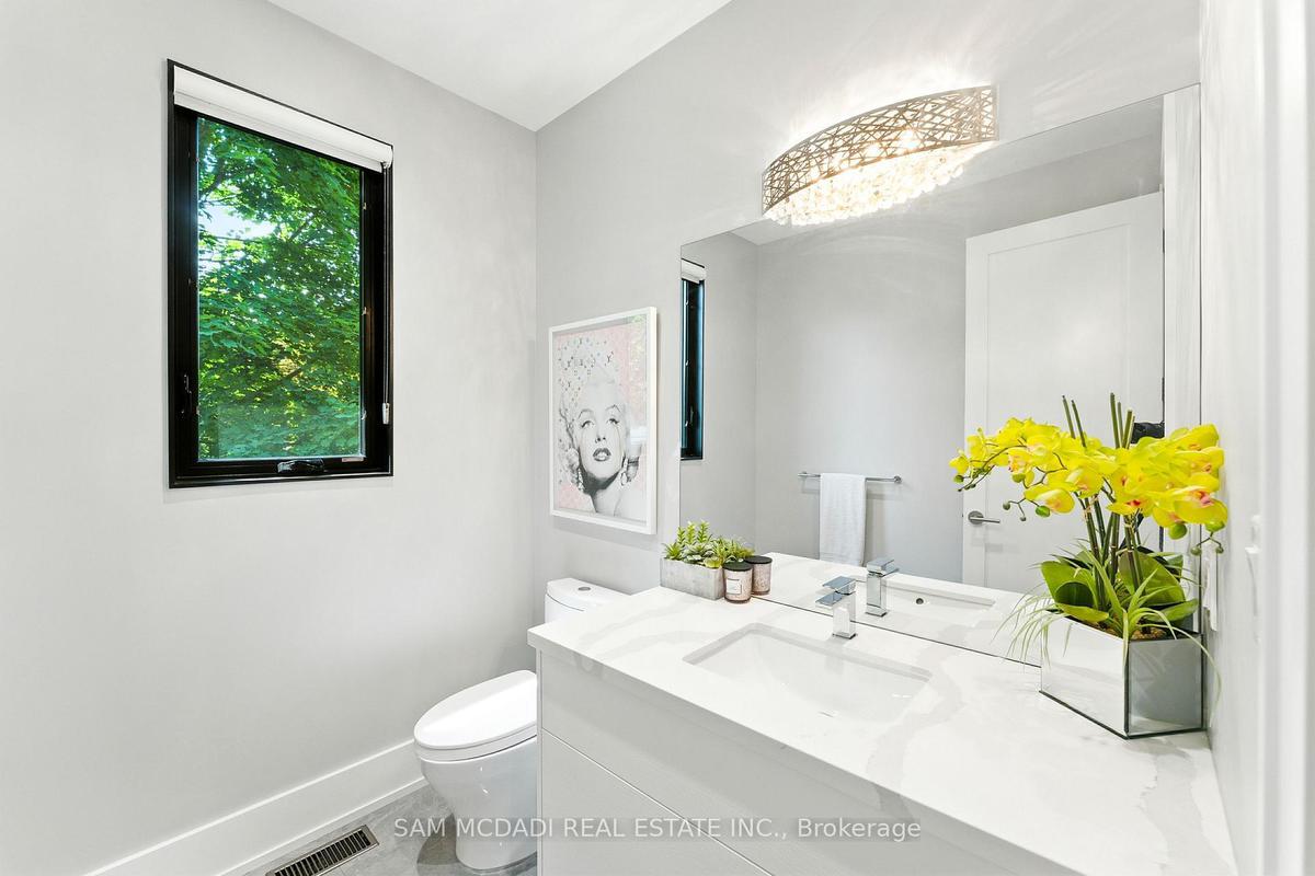 Welcome to 1112 Caldwell Avenue, a stunning custom-built home completed in 2019 in prestigious Lorne Park. Offering over 5400 sqft of beautifully finished living space across three levels and set on a generous 96 x 106 ft lot, this residence showcases timeless curb appeal with its classic stone and stucco exterior. Inside, a dramatic double-height foyer welcomes you into a thoughtfully designed interior. The chef's kitchen features premium stainless steel appliances including a Wolf 6-burner gas stove, full-height custom cabinetry, and a 9 ft centre island with waterfall quartz countertop. The adjoining living room is highlighted by a gas fireplace and a custom built-in media centre. A formal dining room, beautifully designed home office with full-height custom cabinetry, and a functional mudroom complete the main level. A striking floating staircase with solid oak open risers leads to the upper level. The impressive 600+ sqft primary suite offers a walk-in closet and spa-inspired 5-pc ensuite with freestanding tub and thermostatic shower system. The upper level also features a junior suite with 3-pc ensuite, 2 additional bedrooms, and a 5-pc bathroom. The finished lower level adds exceptional versatility with a nanny's bedroom, rec room, gym, 3-pc bathroom, and ample storage. Outdoors, enjoy a private backyard surrounded by mature trees and lush foliage, featuring an expansive stone patio, gas firepit, and wood-burning fire pit. Premium finishes include engineered oak hardwood flooring, porcelain tile, oversized windows with security film, 3 skylights, motion-sensor closet lighting, and solid core doors. Additional features include Sonos sound system, alarm system, HRV, sump pump, and professional-grade security cameras. Ideally located near top-rated schools including Tecumseh PS, Lorne Park PS and Lorne Park SS, Lake Ontario, Port Credit village, and quick access to the QEW, this exceptional home offers refined living in Mississauga's most sought-after community.
