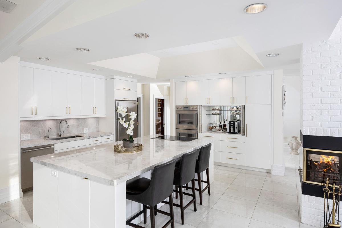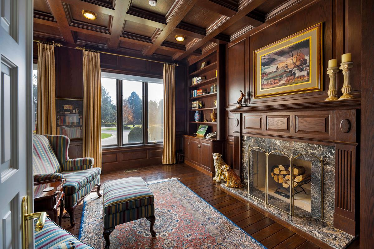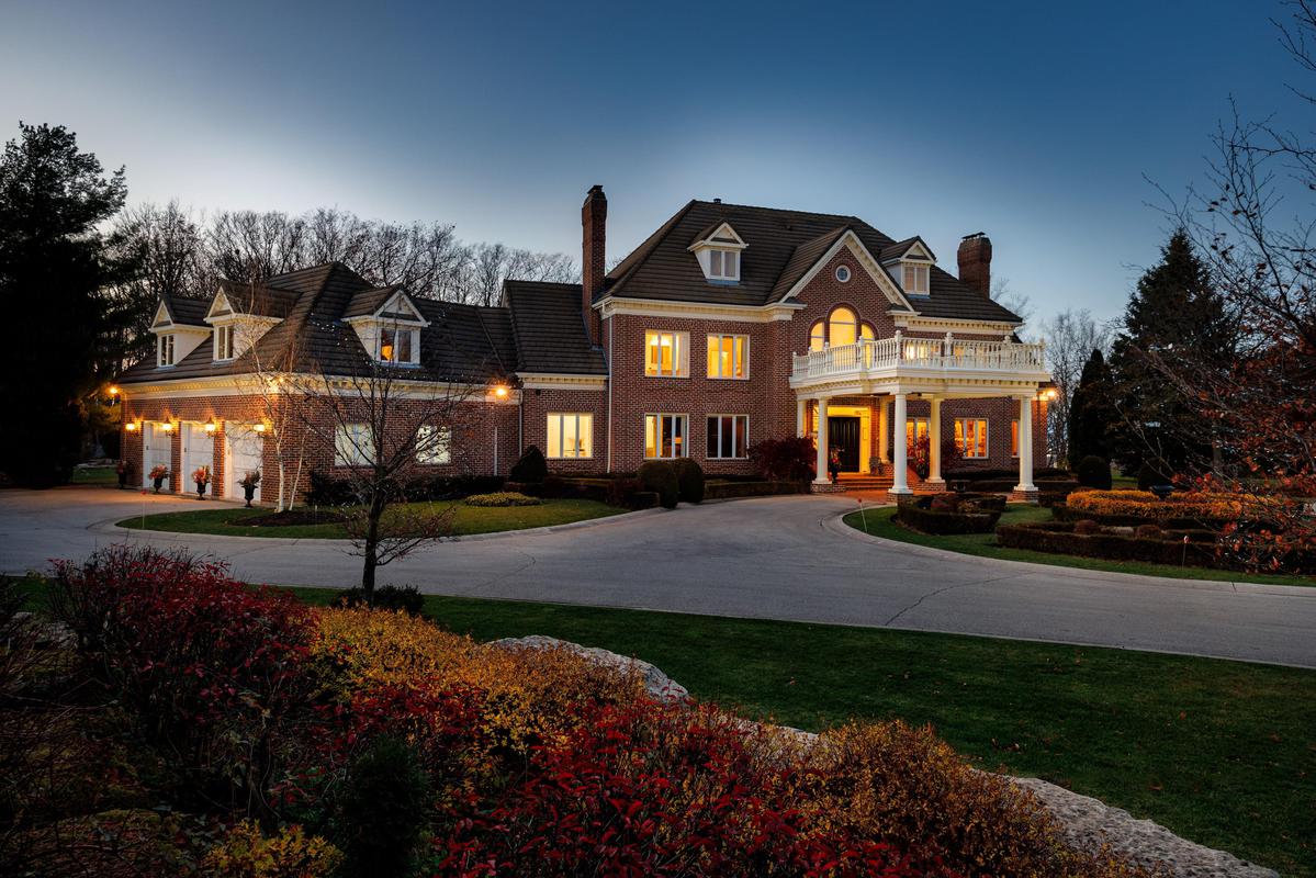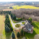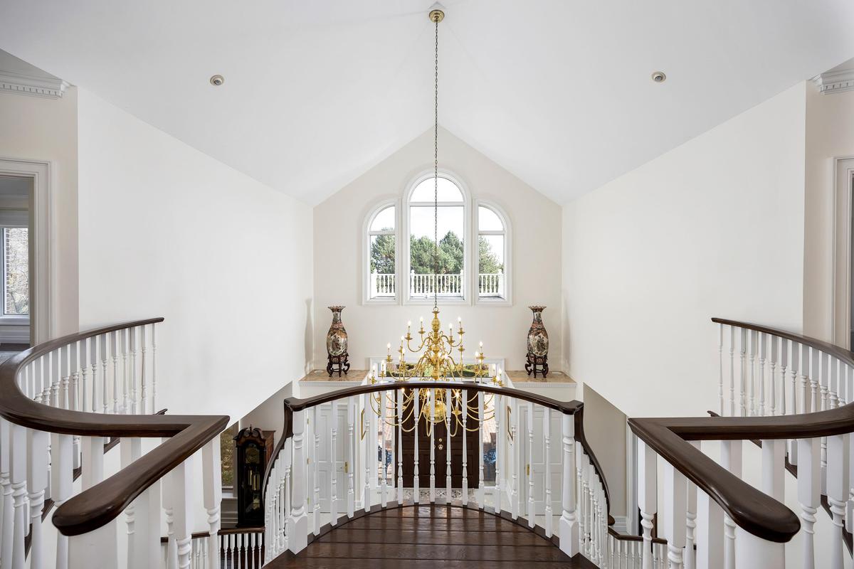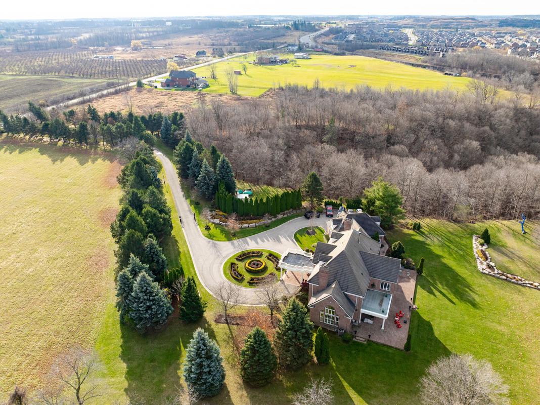 PERCHED ATOP the Stoney Creek Escarpment on a 16-acre peninsula, this distinguished Georgian-style estate offers over 7,000 sq ft of above-grade living space. Enter through private gates with a scenic driveway and formal gardens before arriving at the impressive "Porte Cochere". Dual staircases and soaring 28-ft ceilings create an immediate sense of grandeur. The open, flowing floor plan seamlessly connects all formal rooms to the foyer. Chef-inspired kitchen equipped with high-end appliances, family room features expansive windows that offer breathtaking views in every season. Luxurious primary suite includes a spa-like ensuite and a large balcony. 3 additional spacious bedrooms, each with its own ensuite. The lower level has a gym and sauna, plus a vast unfinished area.