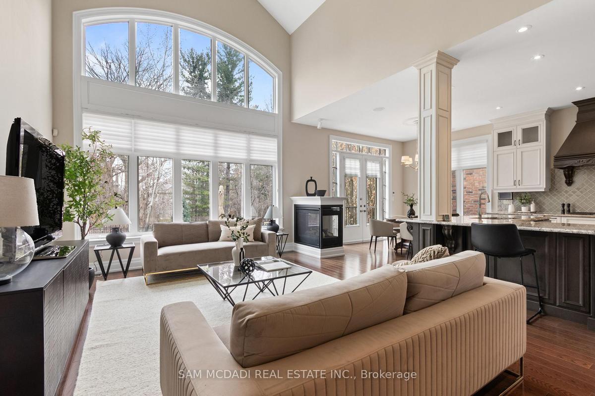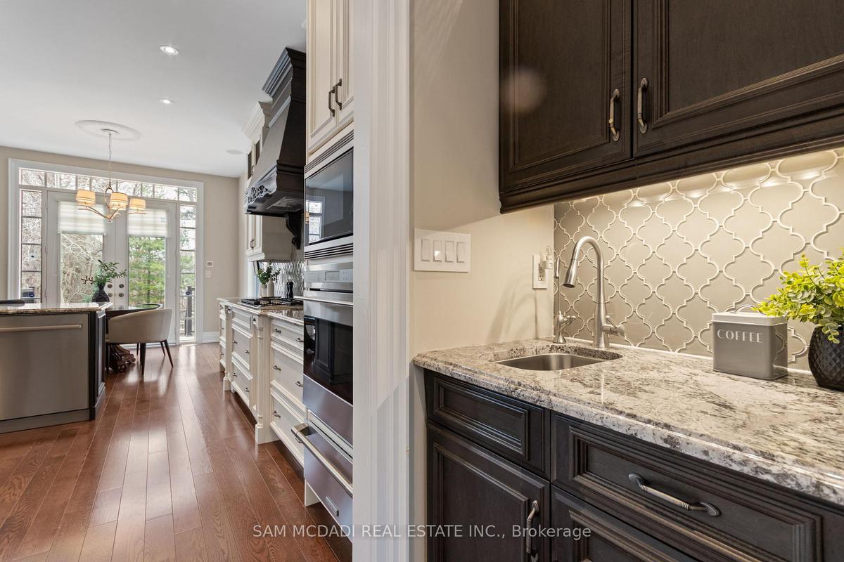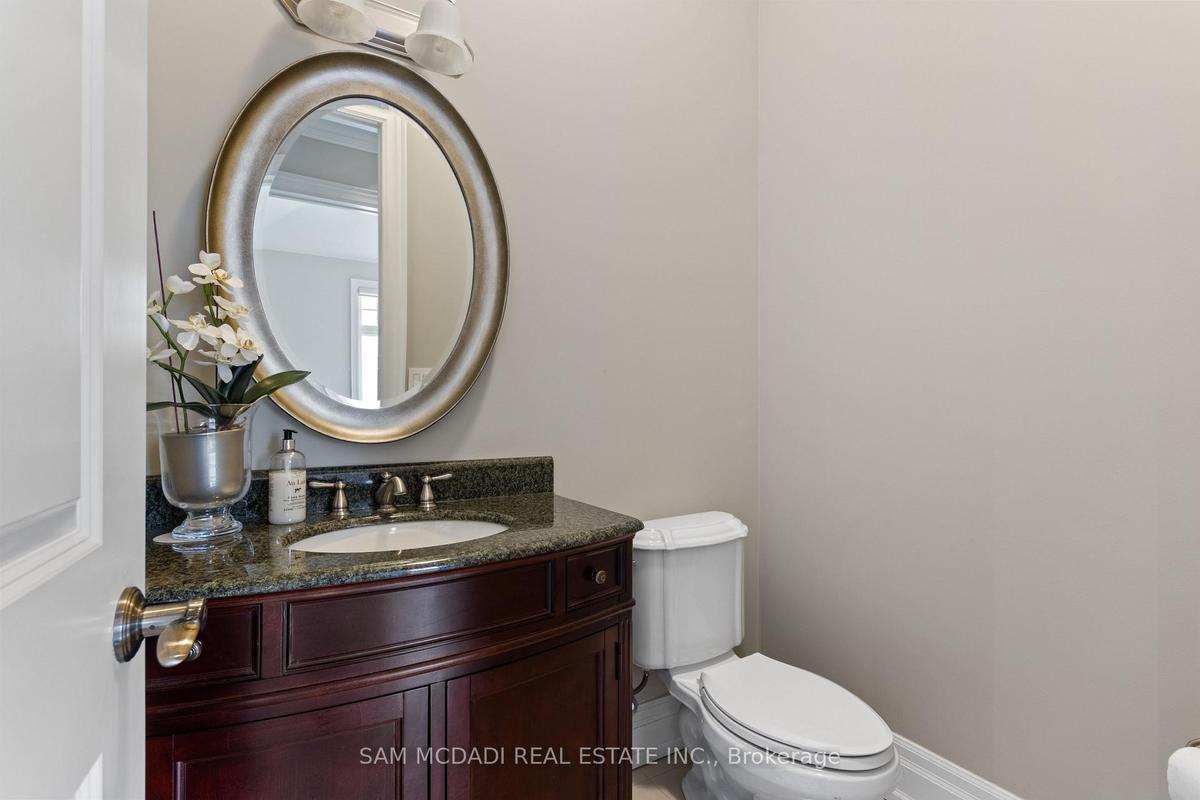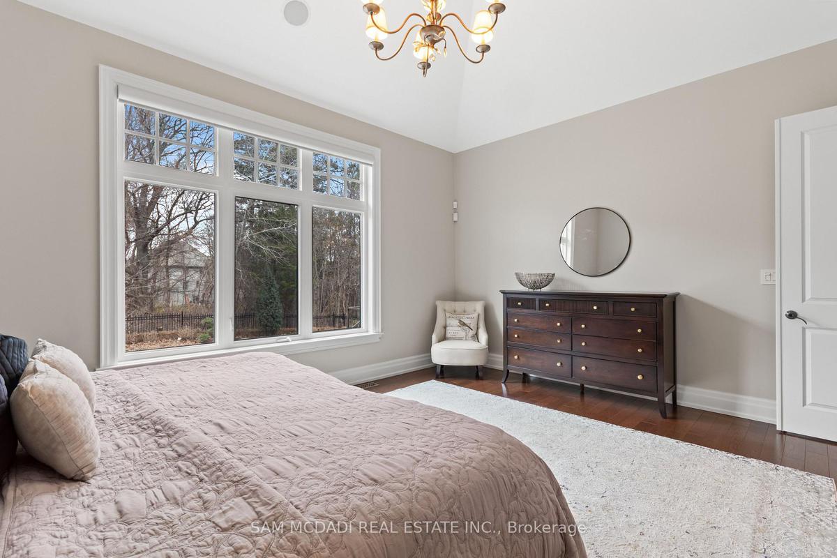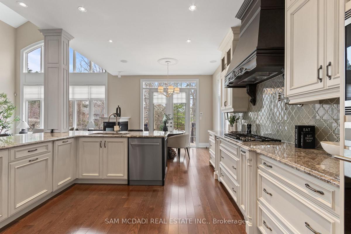 Welcome to this exceptional, executive residence on a quiet court in one of Mississauga's most sought-after enclaves. Backing onto a serene, private forest setting, this home offers the perfect blend of luxury, comfort, and timeless design ideal for discerning buyers seeking refined main-floor living. The moment you enter, you are greeted by a grand foyer with soaring 10-ft ceilings, elegant crown moulding, custom wainscoting and architectural detailing that carries throughout the home. The formal living and dining rooms impress with cathedral ceilings, designer lighting, and upscale finishes perfect for entertaining in style. At the heart of the home is a chef-inspired kitchen featuring premium appliances, custom cabinetry with illuminated uppers, a large granite peninsula and a seamless flow into the breakfast area and great room. The open-concept layout is enhanced by expansive windows showcasing tranquil views of the lush backyard and forest beyond. Designed with convenience and long-term comfort in mind, the main floor primary suite is a true retreat. Boasting a vaulted ceiling, spa-like ensuite with soaker tub and glass shower and a custom walk-in closet, this space offers privacy and ease of living rarely found in homes of this caliber. The upper level features a spacious loft area and generously sized bedrooms, including a private ensuite and a Jack & Jill bath ideal for family or guests. The professionally finished basement extends the living space with 9-ft ceilings, a guest bedroom with ensuite, a large recreation room with fireplace, a den, and a well-appointed kitchenette perfect for extended family or entertaining. Outdoors, enjoy a beautifully landscaped property complete with a two-tier deck, custom pergola and elegant stonework all backing onto nature for ultimate privacy. This is a rare offering combining luxury, functionality, and an ideal layout for those seeking the ease of main-floor living without compromising on space or elegance.