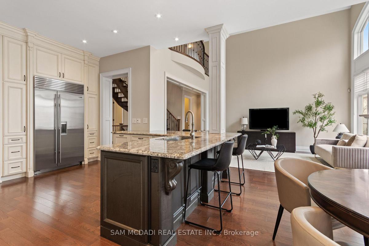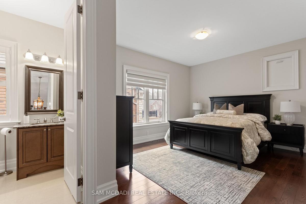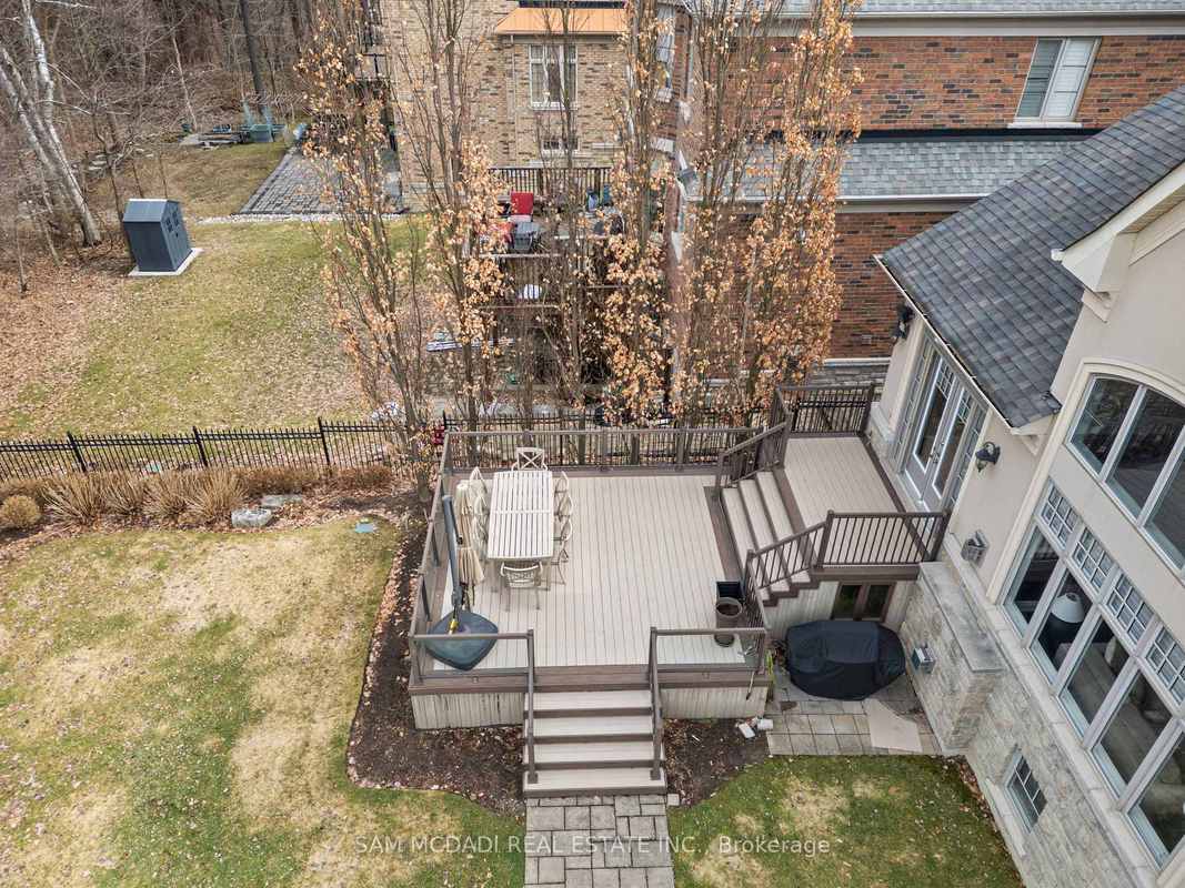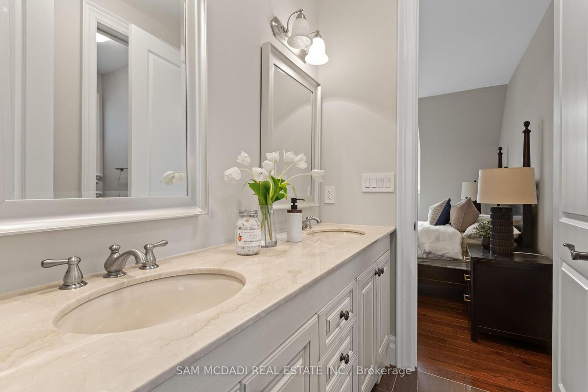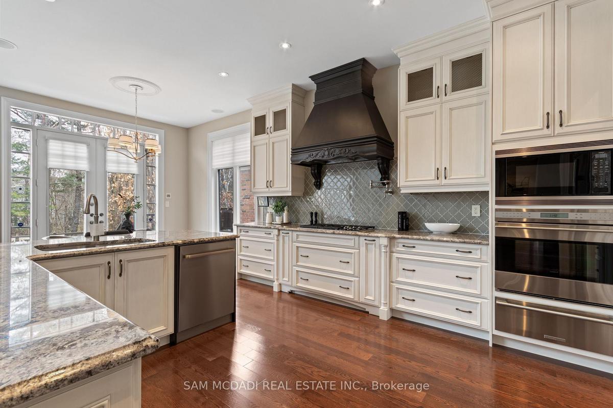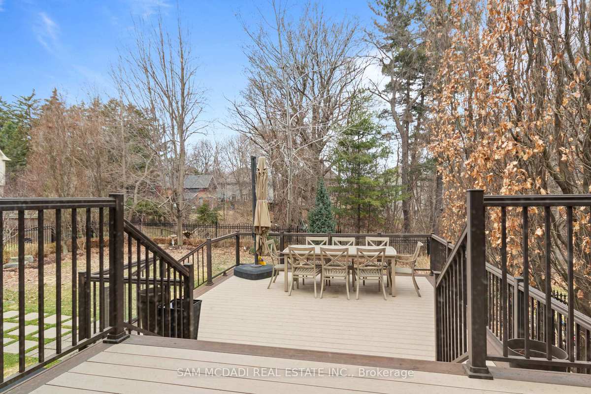 Welcome to this exceptional, executive residence on a quiet court in one of Mississauga's most sought-after enclaves. Backing onto a serene, private forest setting, this home offers the perfect blend of luxury, comfort, and timeless design ideal for discerning buyers seeking refined main-floor living. The moment you enter, you are greeted by a grand foyer with soaring 10-ft ceilings, elegant crown moulding, custom wainscoting and architectural detailing that carries throughout the home. The formal living and dining rooms impress with cathedral ceilings, designer lighting, and upscale finishes perfect for entertaining in style. At the heart of the home is a chef-inspired kitchen featuring premium appliances, custom cabinetry with illuminated uppers, a large granite peninsula and a seamless flow into the breakfast area and great room. The open-concept layout is enhanced by expansive windows showcasing tranquil views of the lush backyard and forest beyond. Designed with convenience and long-term comfort in mind, the main floor primary suite is a true retreat. Boasting a vaulted ceiling, spa-like ensuite with soaker tub and glass shower and a custom walk-in closet, this space offers privacy and ease of living rarely found in homes of this caliber. The upper level features a spacious loft area and generously sized bedrooms, including a private ensuite and a Jack & Jill bath ideal for family or guests. The professionally finished basement extends the living space with 9-ft ceilings, a guest bedroom with ensuite, a large recreation room with fireplace, a den, and a well-appointed kitchenette perfect for extended family or entertaining. Outdoors, enjoy a beautifully landscaped property complete with a two-tier deck, custom pergola and elegant stonework all backing onto nature for ultimate privacy. This is a rare offering combining luxury, functionality, and an ideal layout for those seeking the ease of main-floor living without compromising on space or elegance.